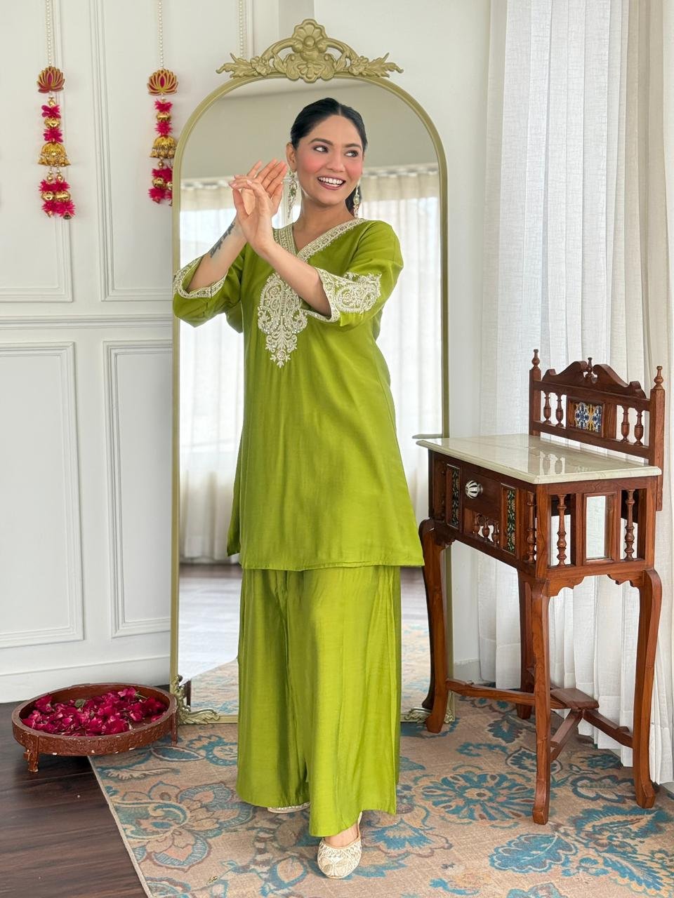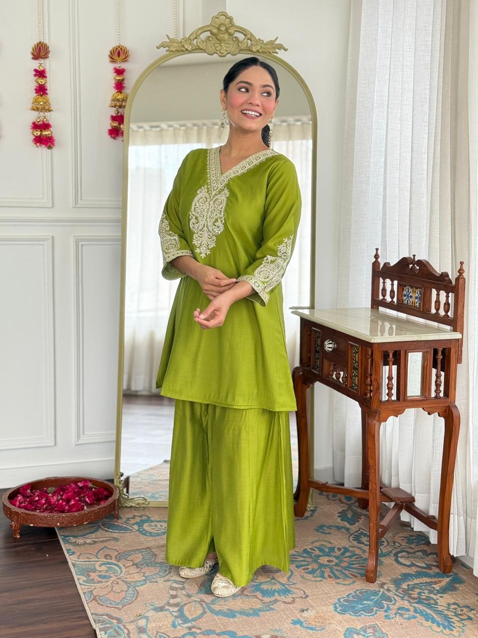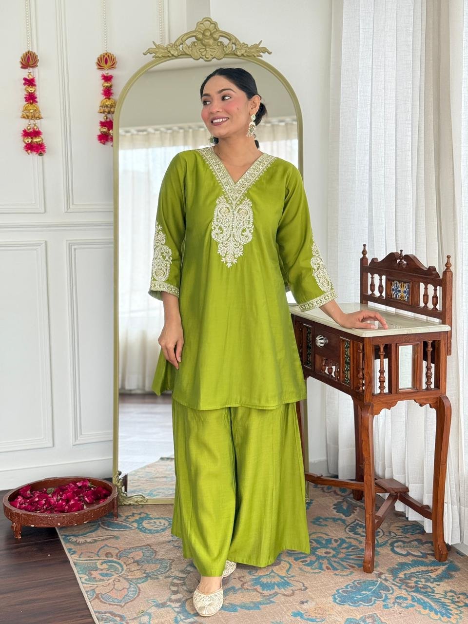 The CS-028 Roman Silk Stylish Co-ord Set with Coding & Sequins Work is a statement piece crafted for women who love refined glamour with comfort. Made from luxurious Roman Silk fabric, this co-ord set drapes beautifully while offering a smooth, rich texture.
