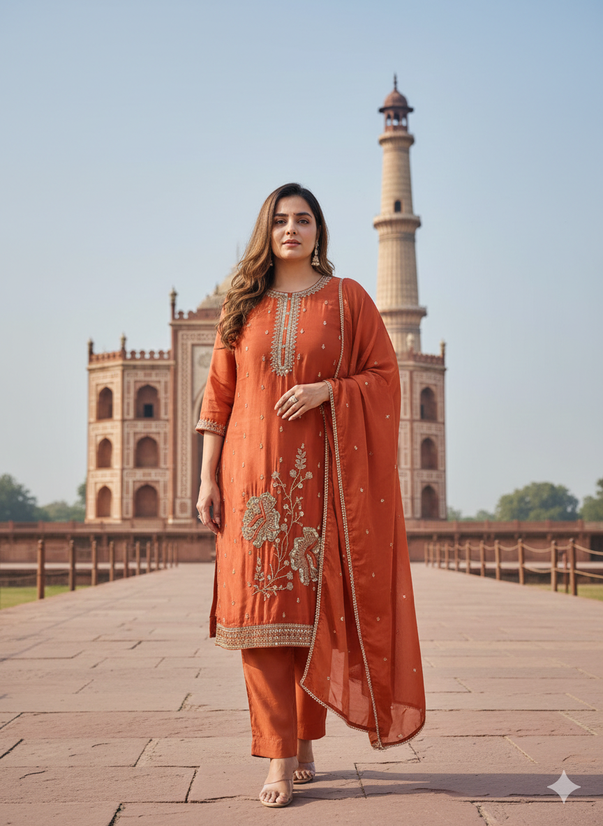 The PW-052 Partywear 3PC Set is crafted to bring elegance and sparkle to your festive wardrobe. Made from luxurious Row Silk fabric, this ensemble offers a rich texture with a graceful drape.