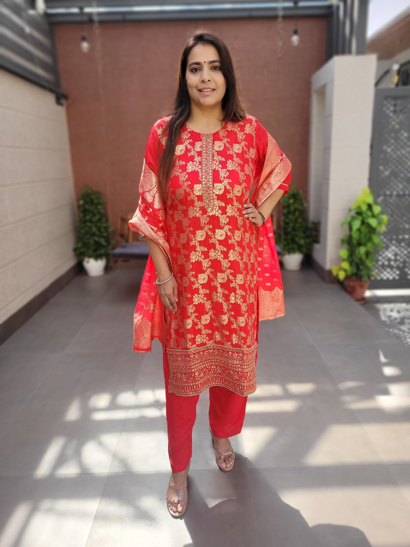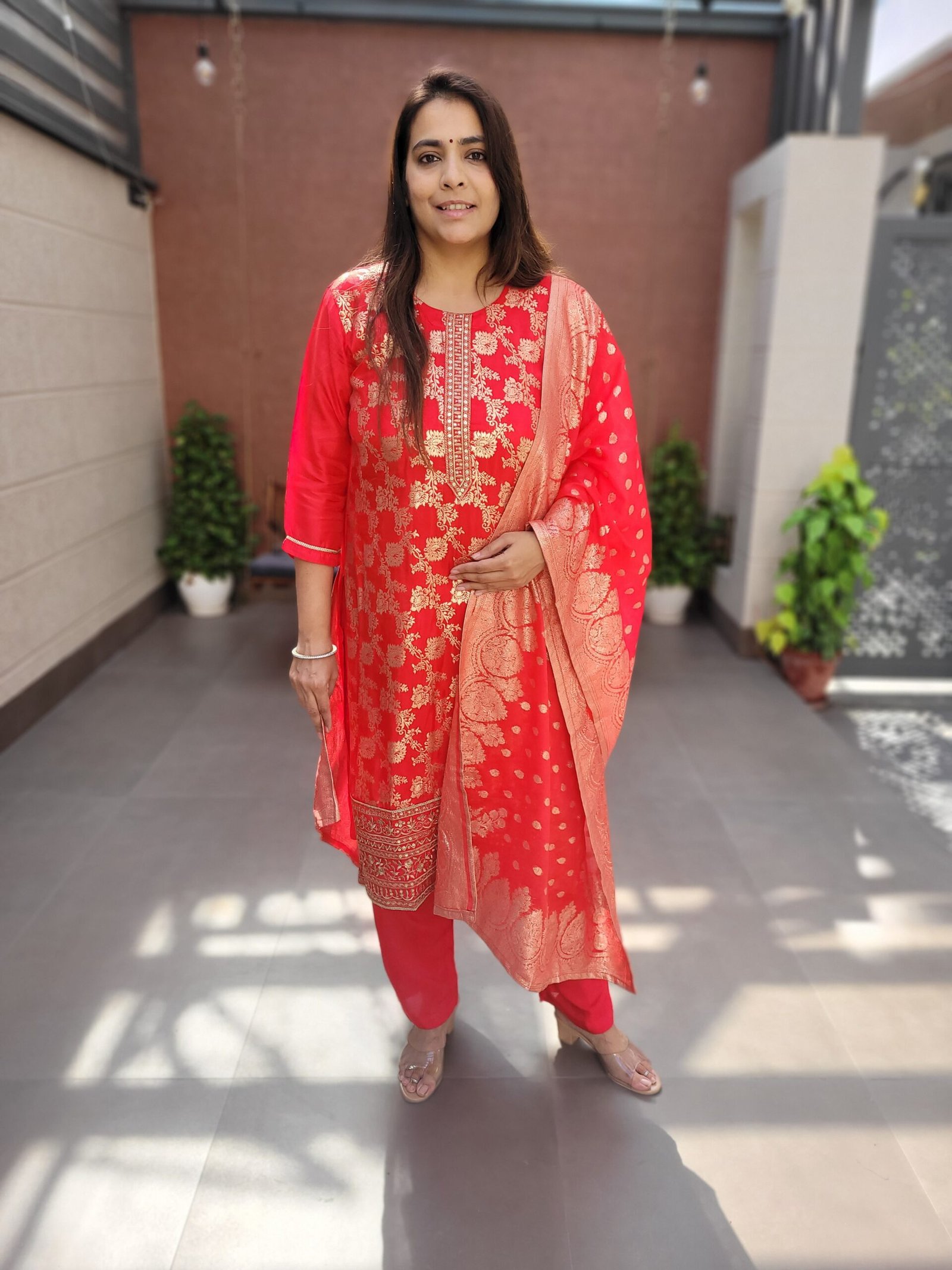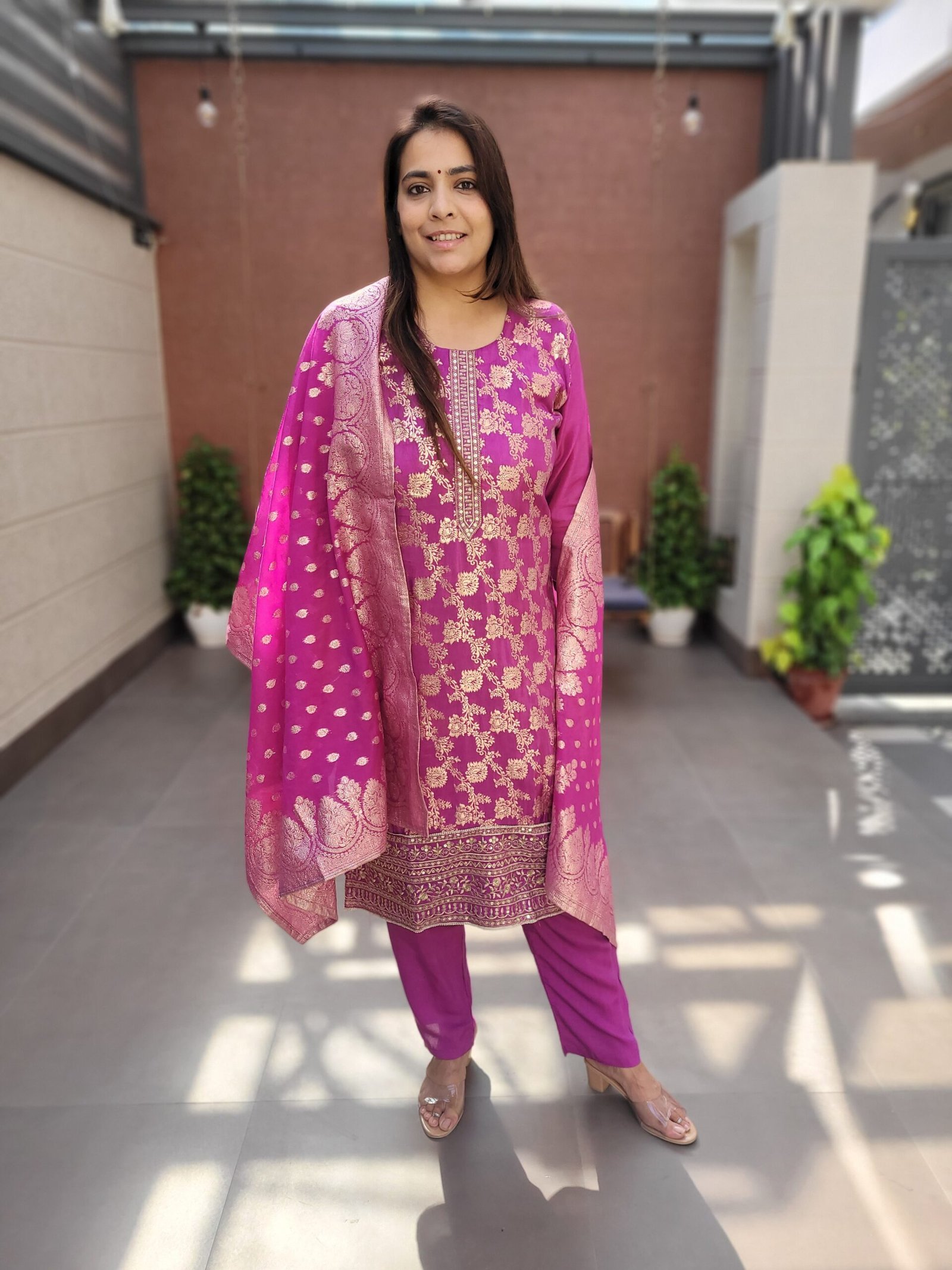 The PW-194 Russian Silk Suit Set blends luxurious texture with sophisticated festive detailing. The kurta is crafted from premium Russian Silk, enhanced with zari embroidery, creating a refined and graceful look. The Banarasi dupatta elevates the entire ensemble with a royal festive charm.