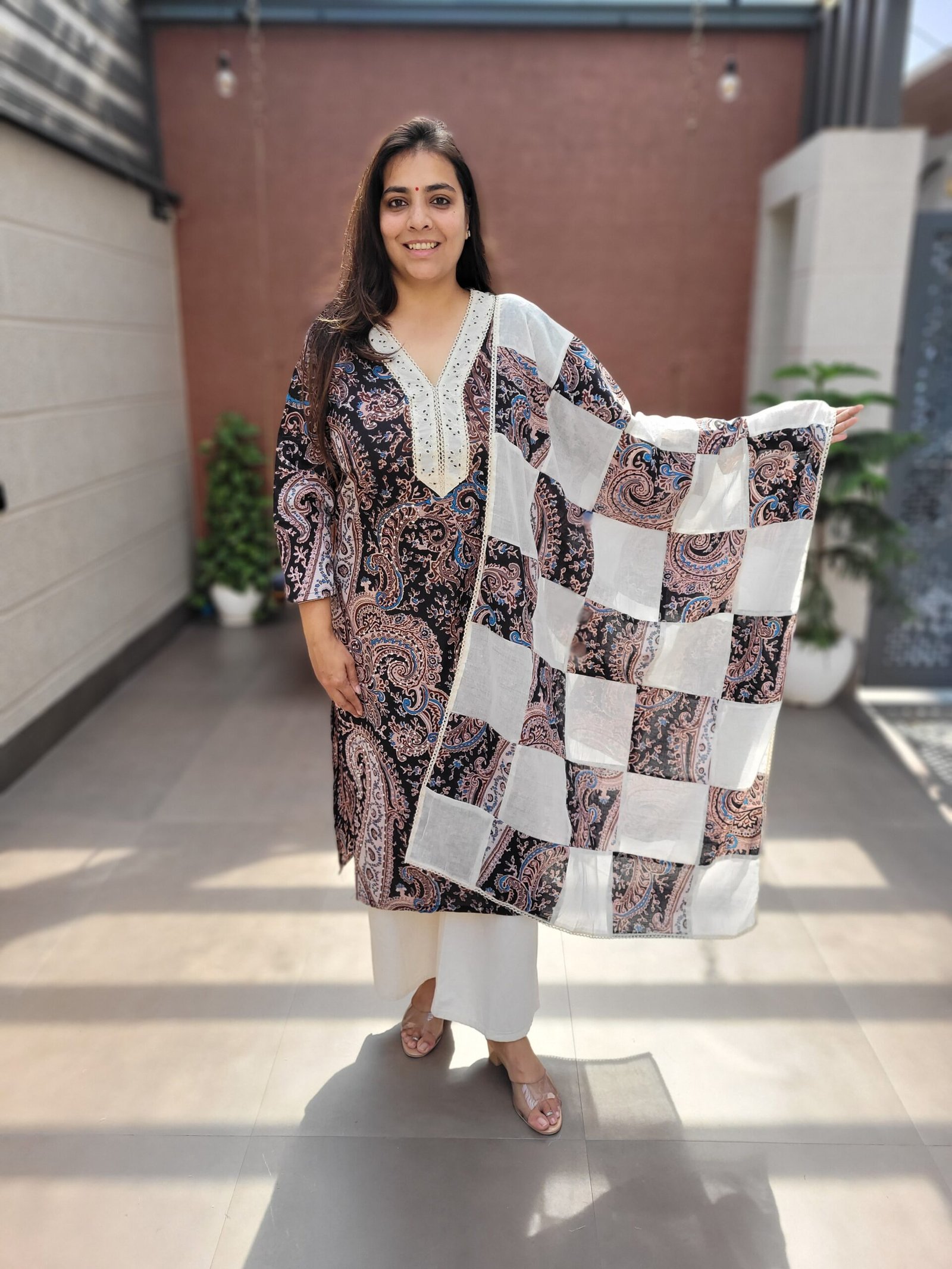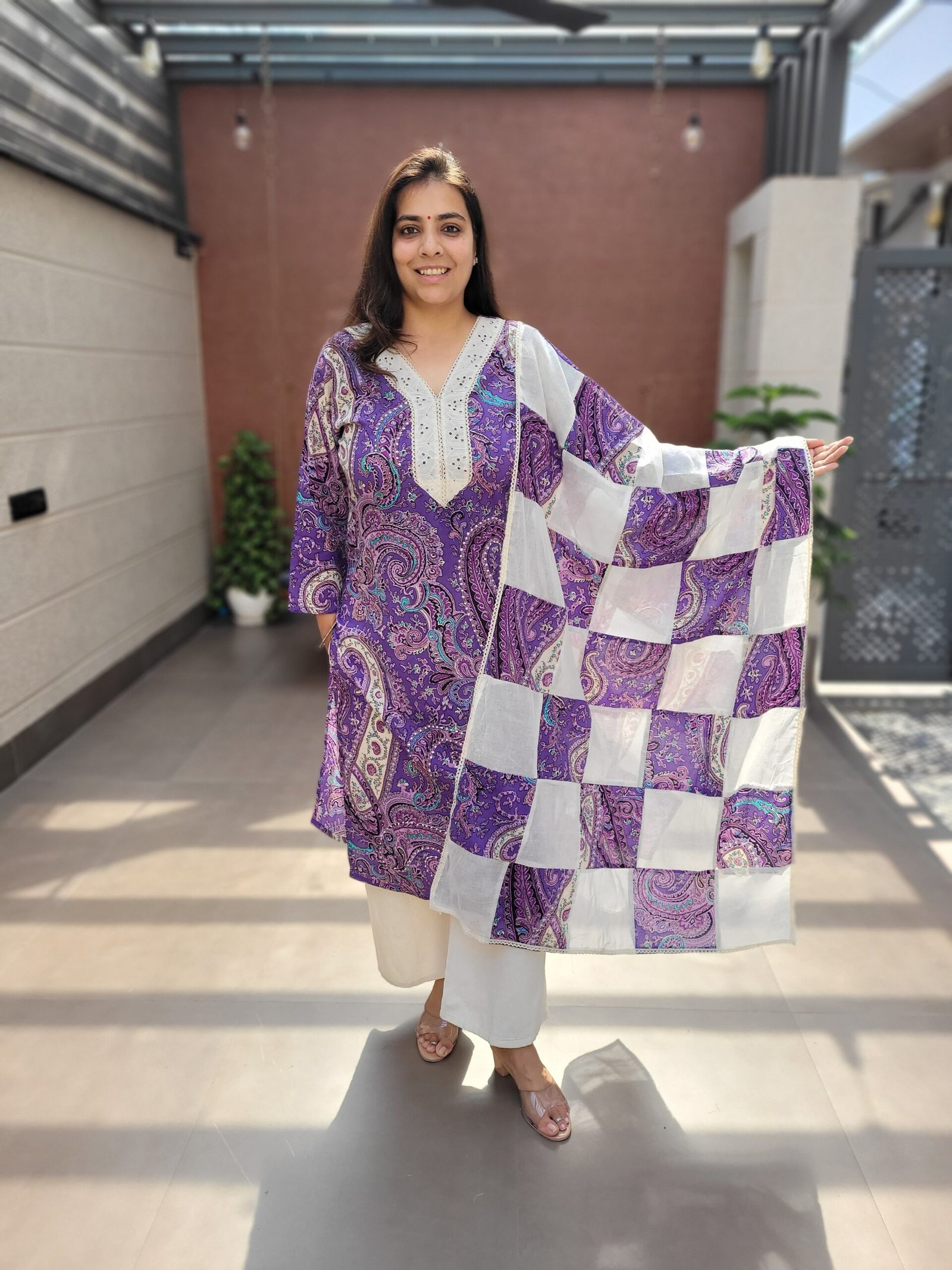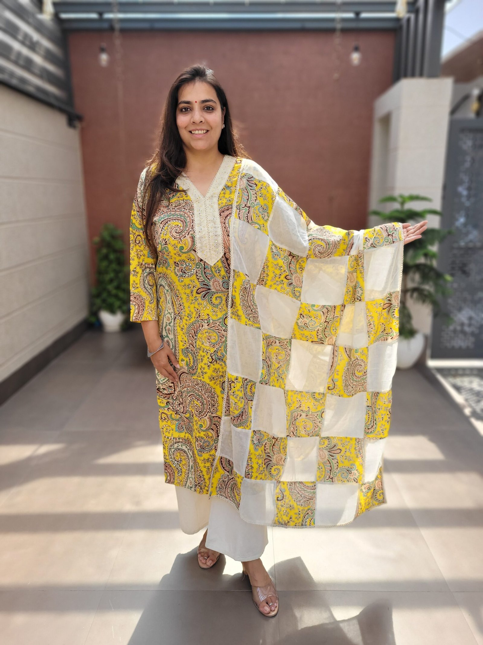 The patchwork dupatta adds a creative touch, making this set ideal for festive wear, casual ethnic outings, and elegant daytime events.