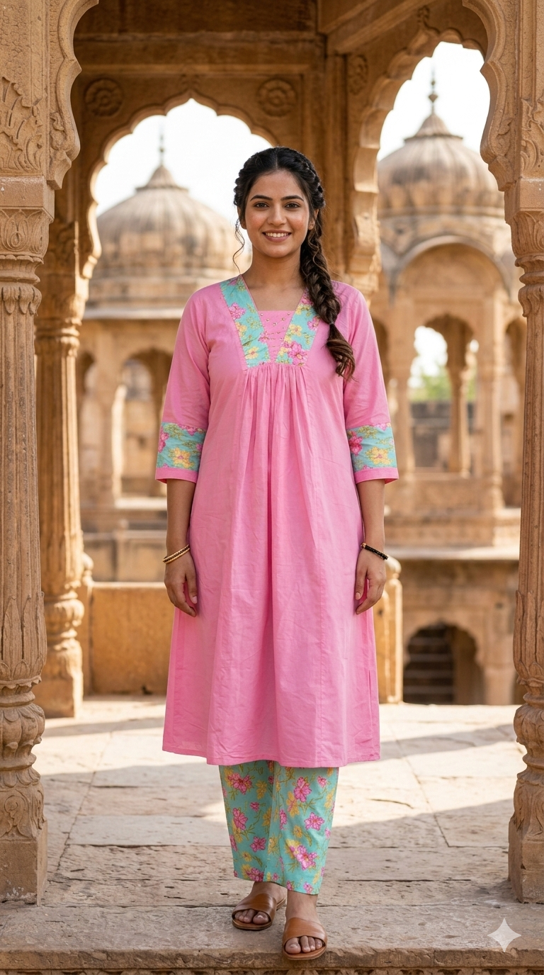 Less is more when it comes to this elegant cotton 2-piece set featuring a beautifully tailored A-line kurta. Light sequins work adds just the right amount of shimmer—perfect for festive mornings, casual evenings, or classy day-outs.