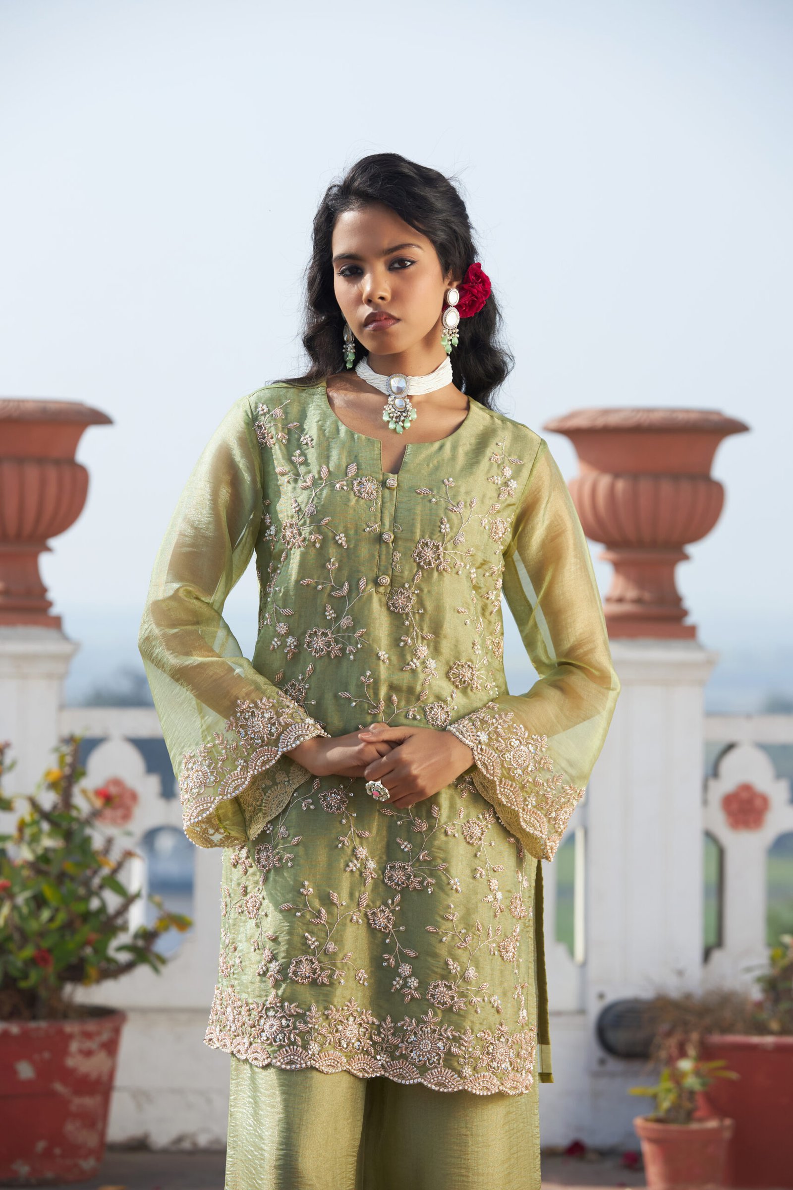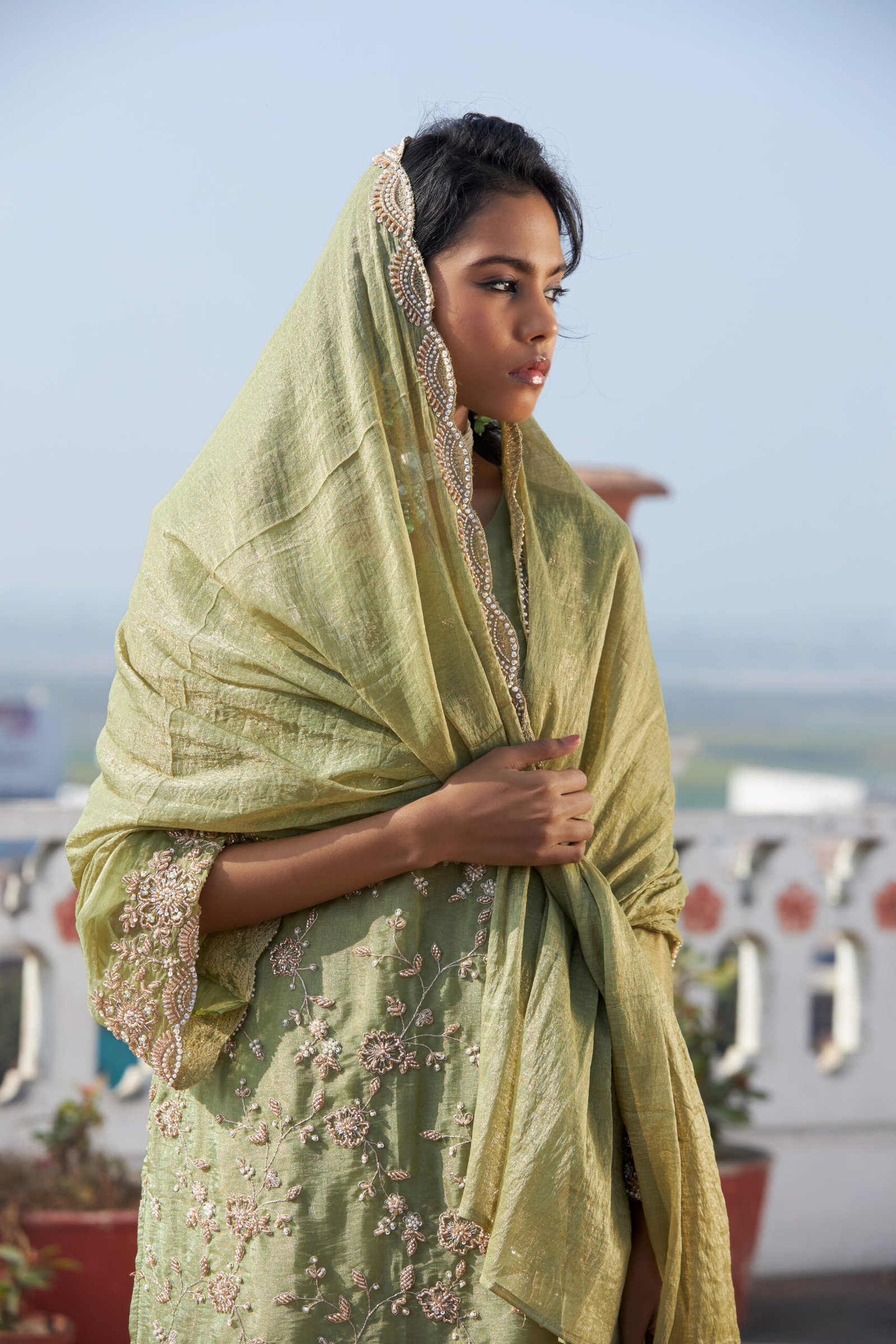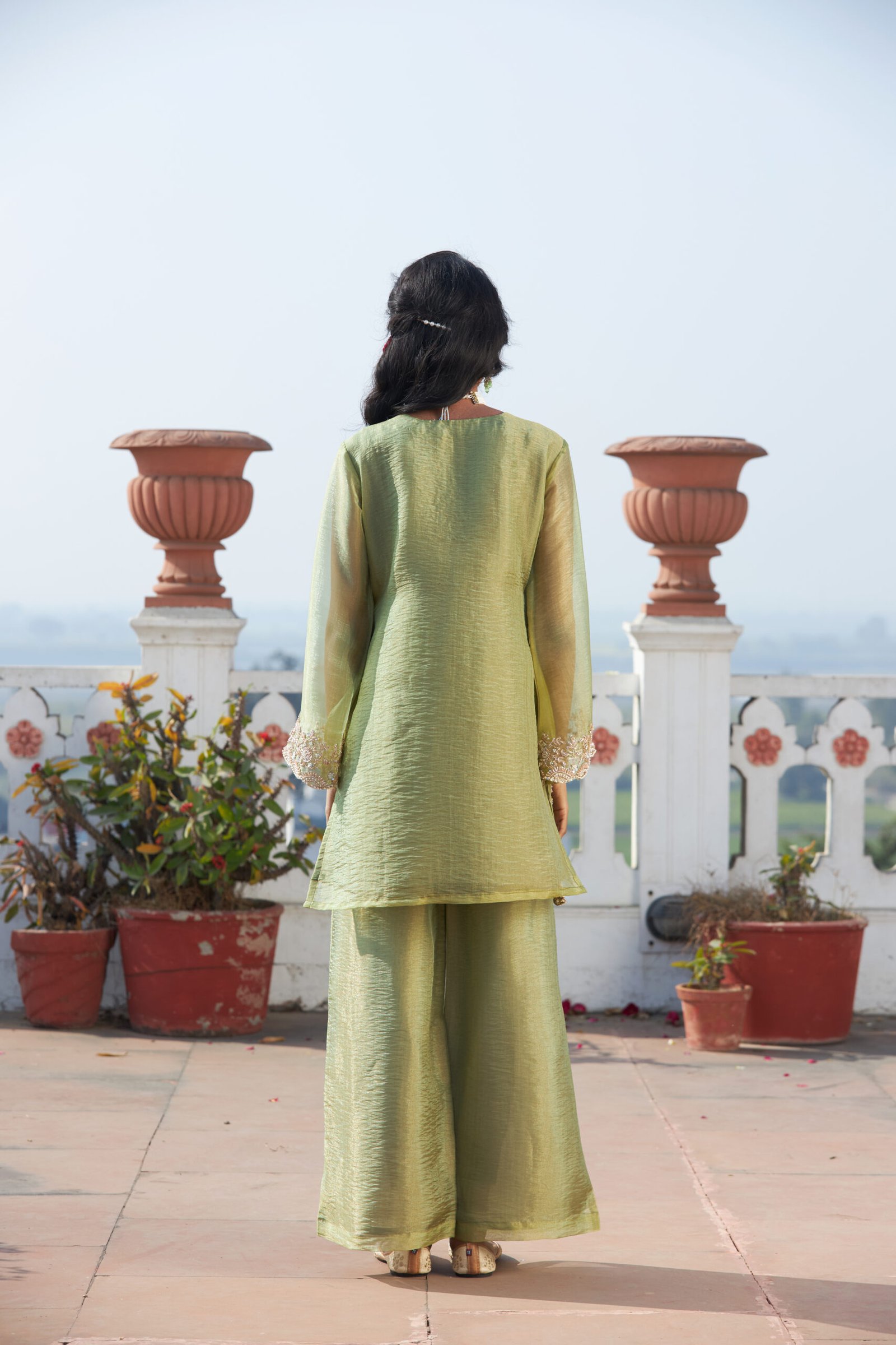 Care Tips: Dry clean recommended to maintain shimmer fabric and handwork.