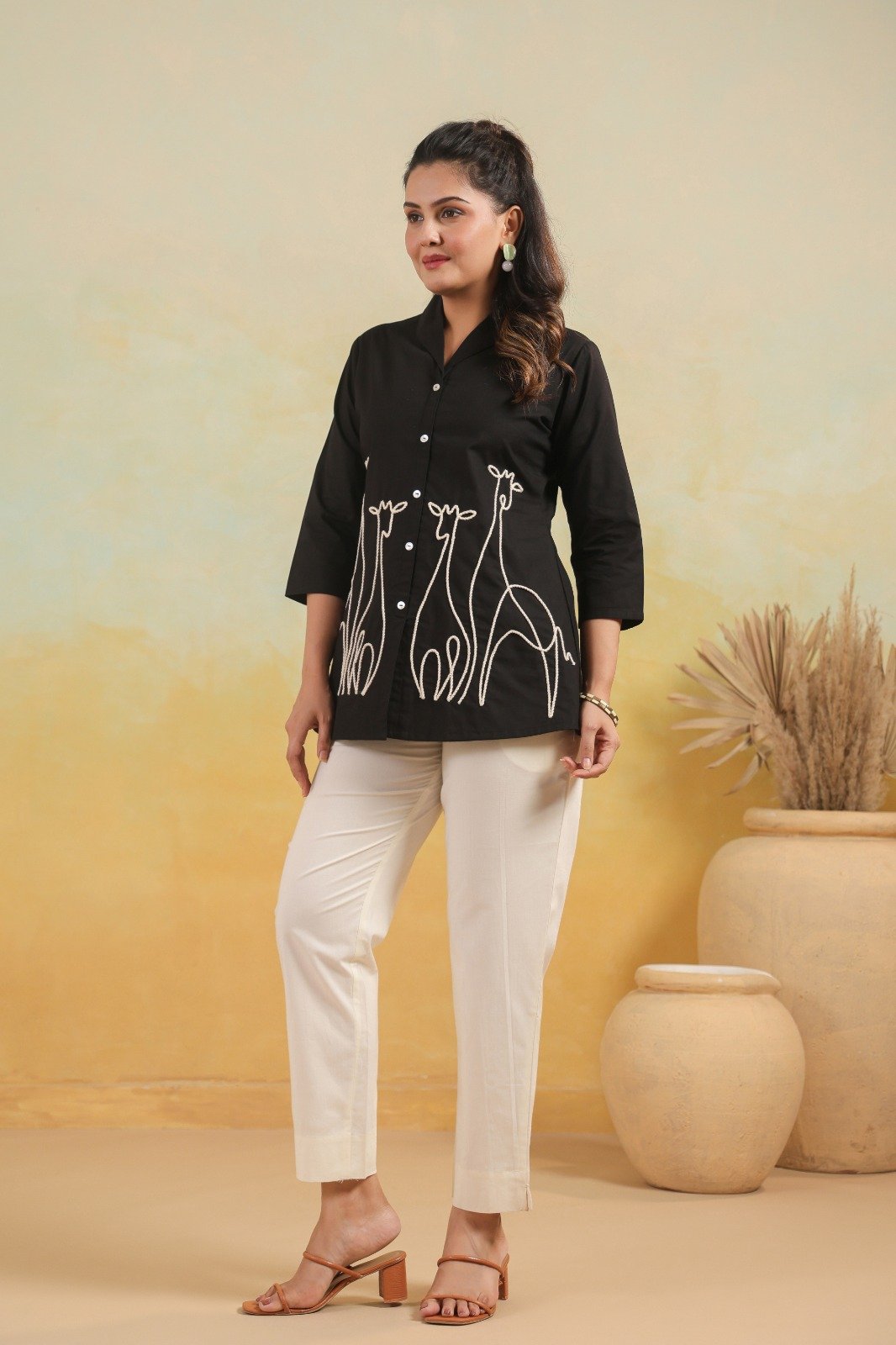 The TU-080 Shirt Style Tunic is designed for modern comfort with a refined ethnic touch. Crafted from pure cotton, this tunic features a classic shirt-style pattern enhanced with delicate Dori work, adding subtle elegance to its minimal design.