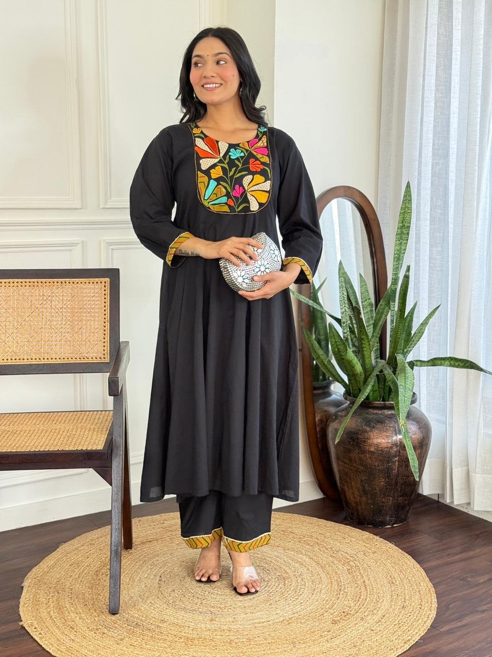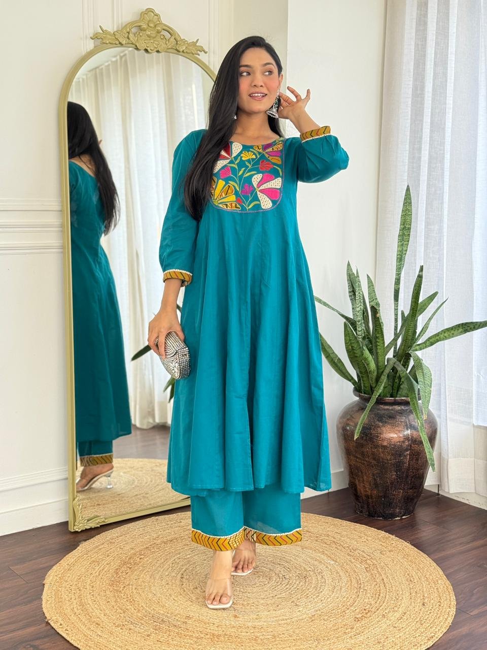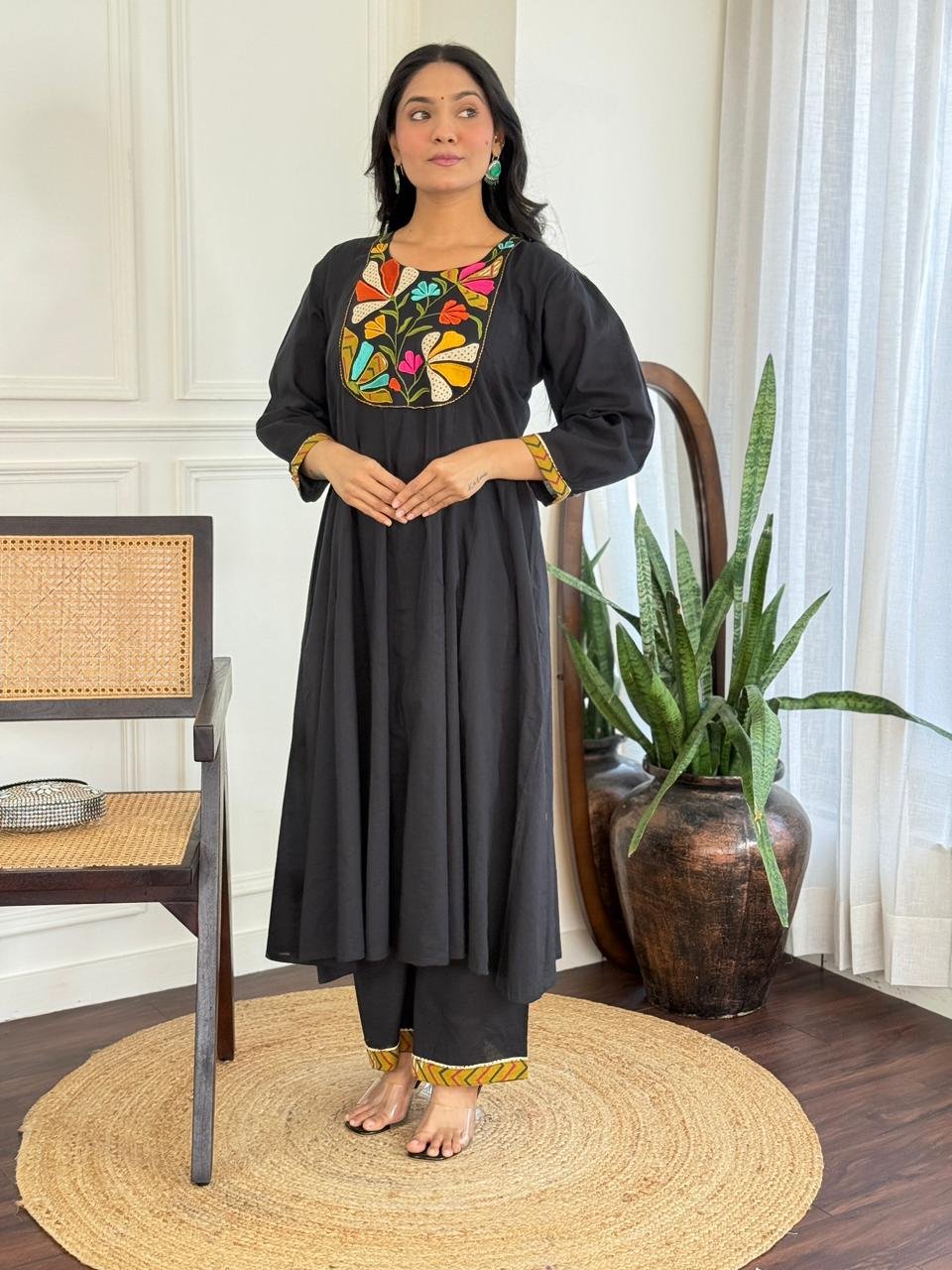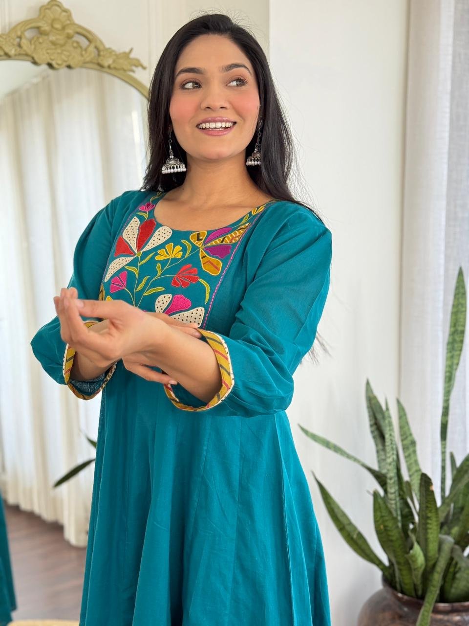 The kurta features a beautifully embroidered yoke and a distinctive shoulder-to-daman times pattern, enhanced by a 20-kali flare that adds flow and elegance. Available in Teal and Black, this ensemble is ideal for festive daytime events, family functions, and refined casual wear.