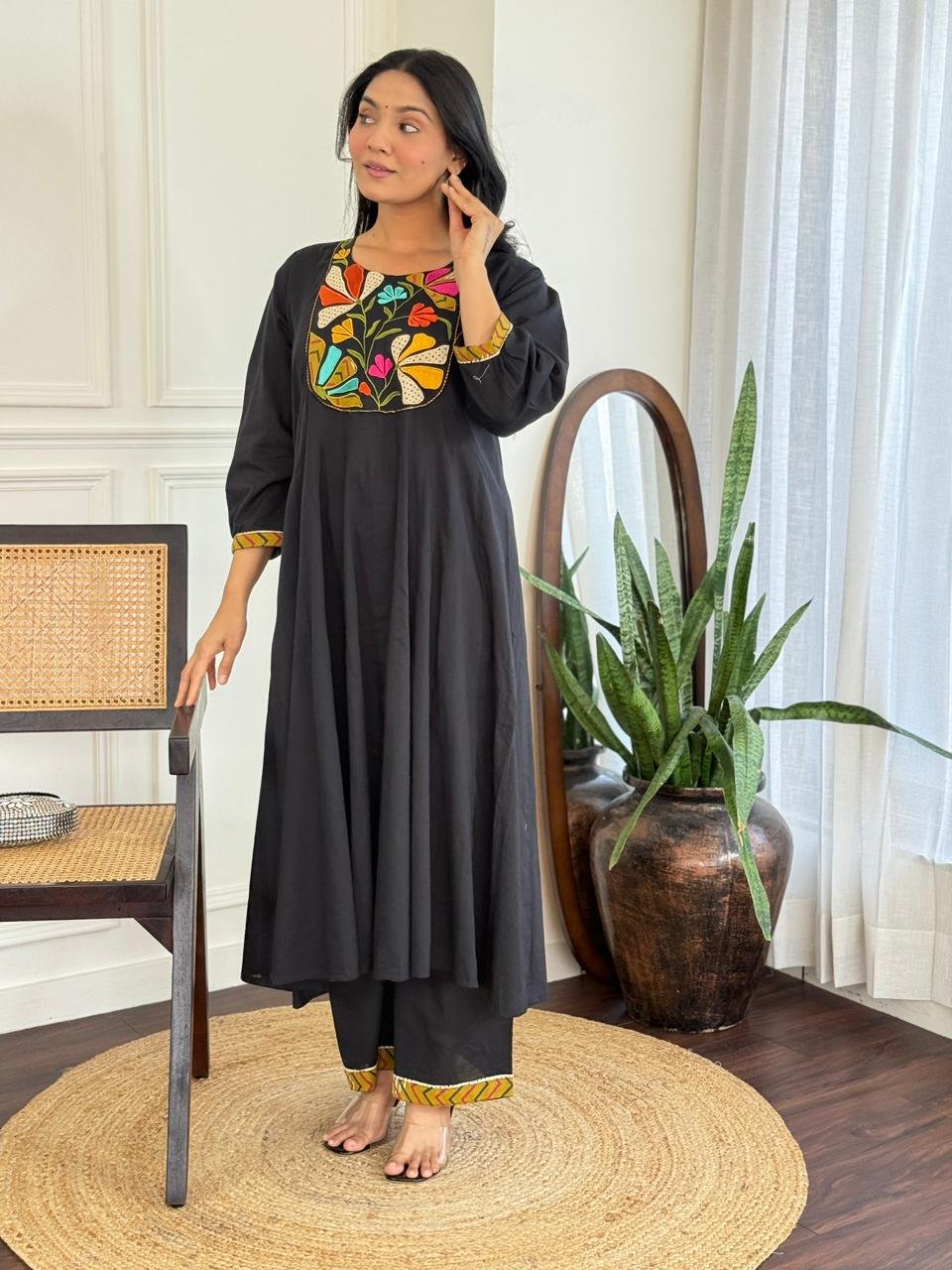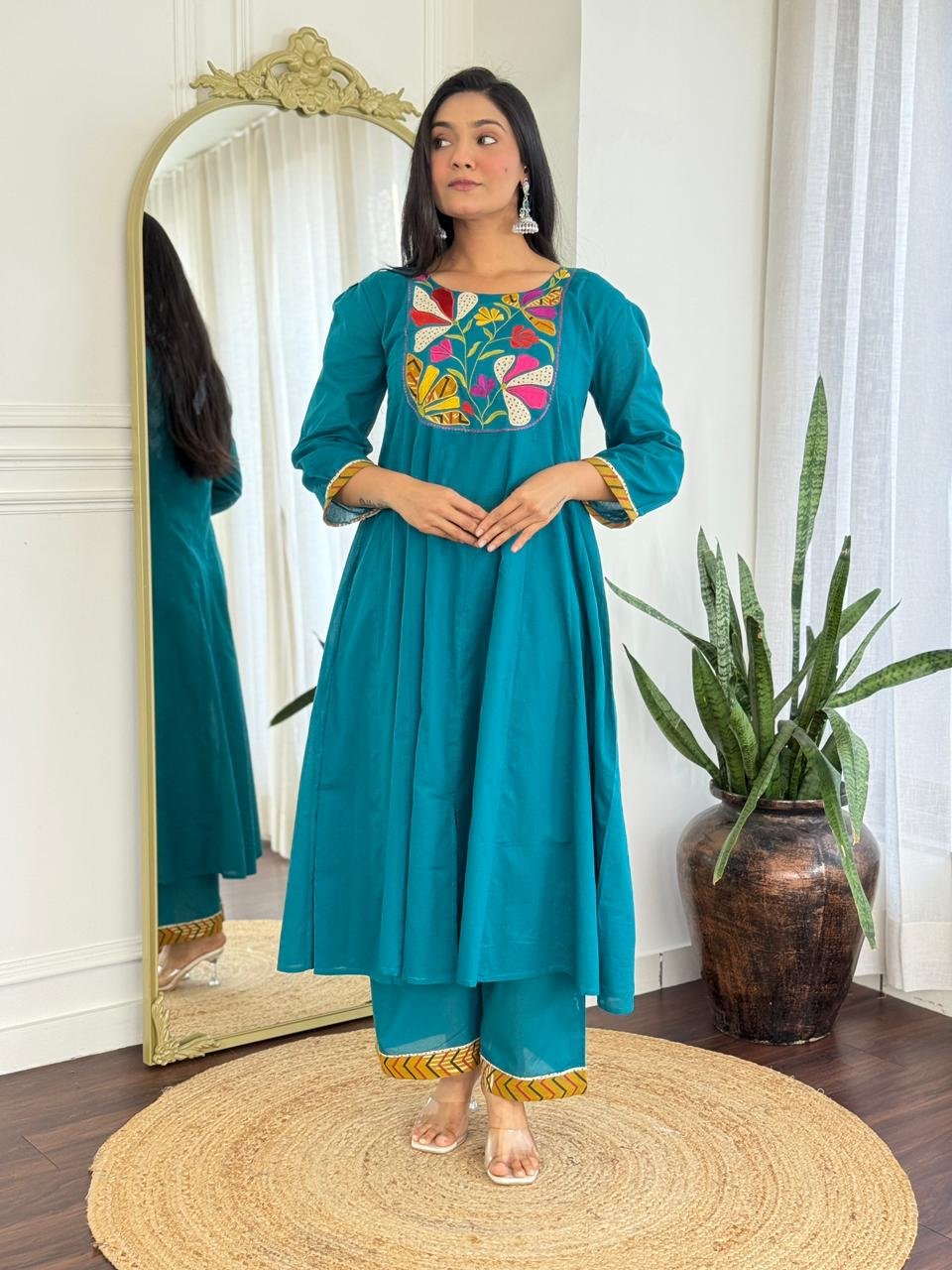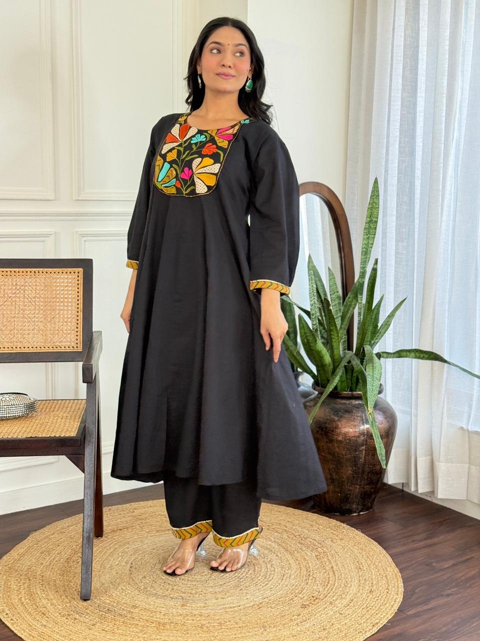 The kurta features a beautifully embroidered yoke and a distinctive shoulder-to-daman times pattern, enhanced by a 20-kali flare that adds flow and elegance. Available in Teal and Black, this ensemble is ideal for festive daytime events, family functions, and refined casual wear.