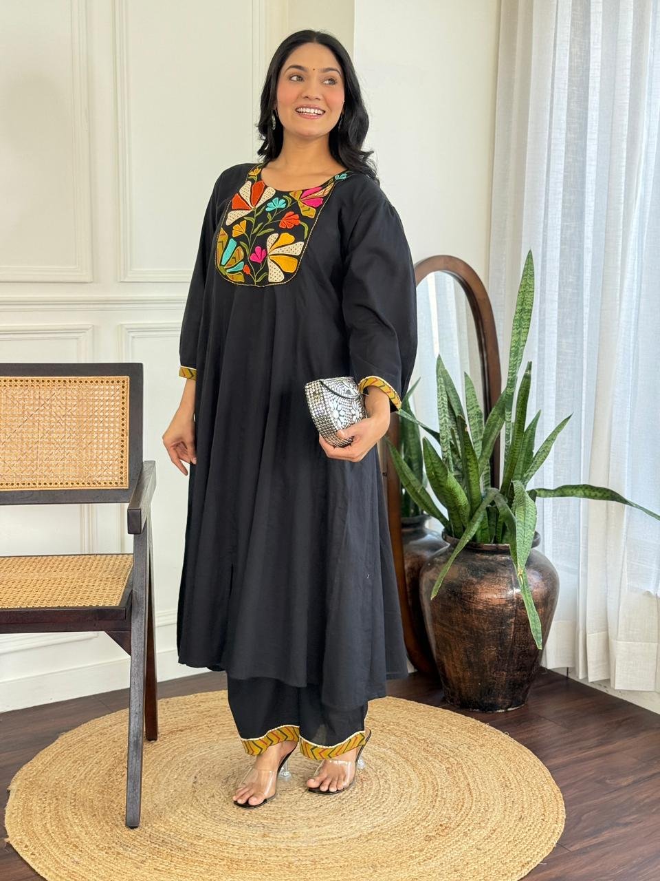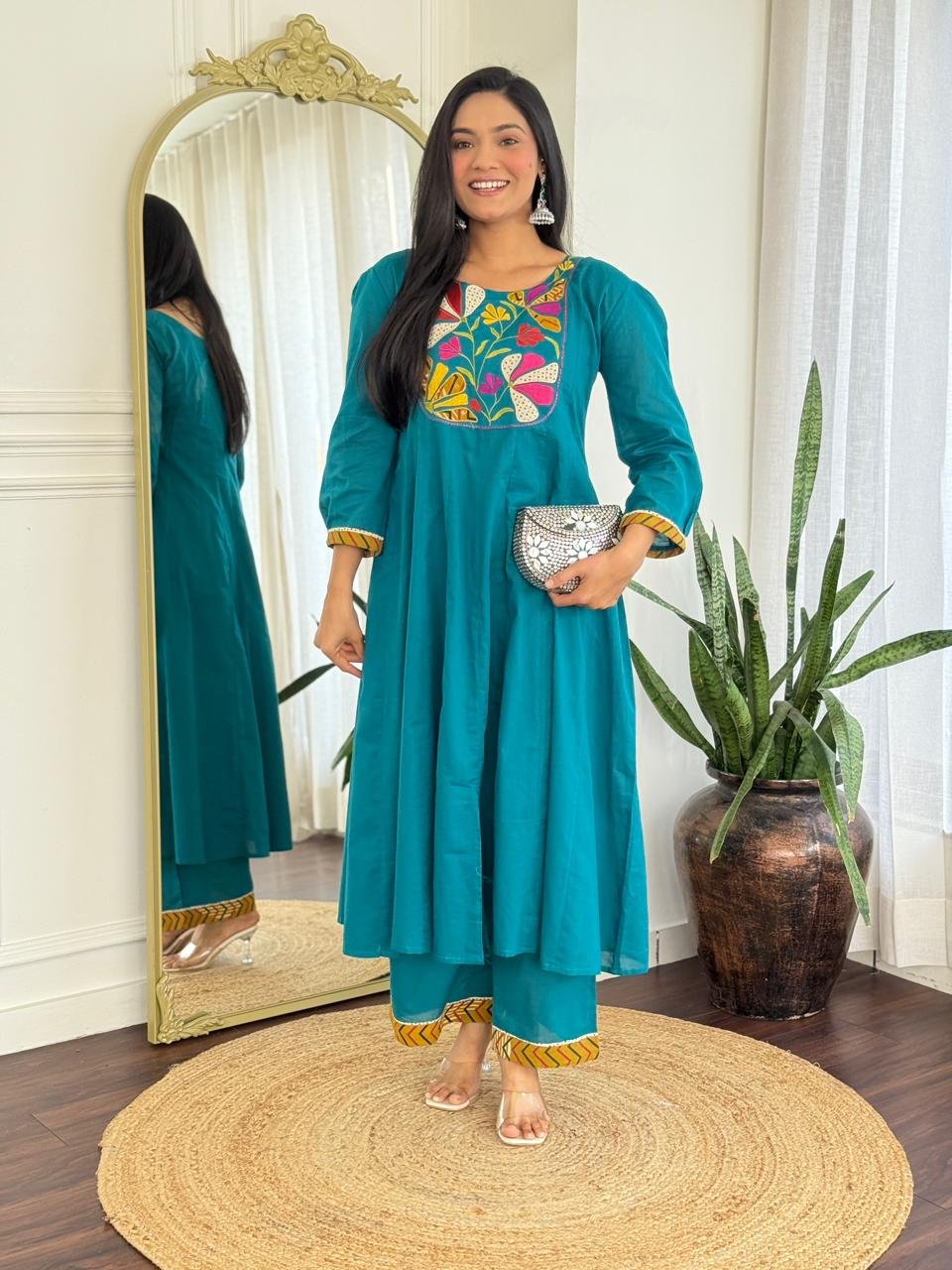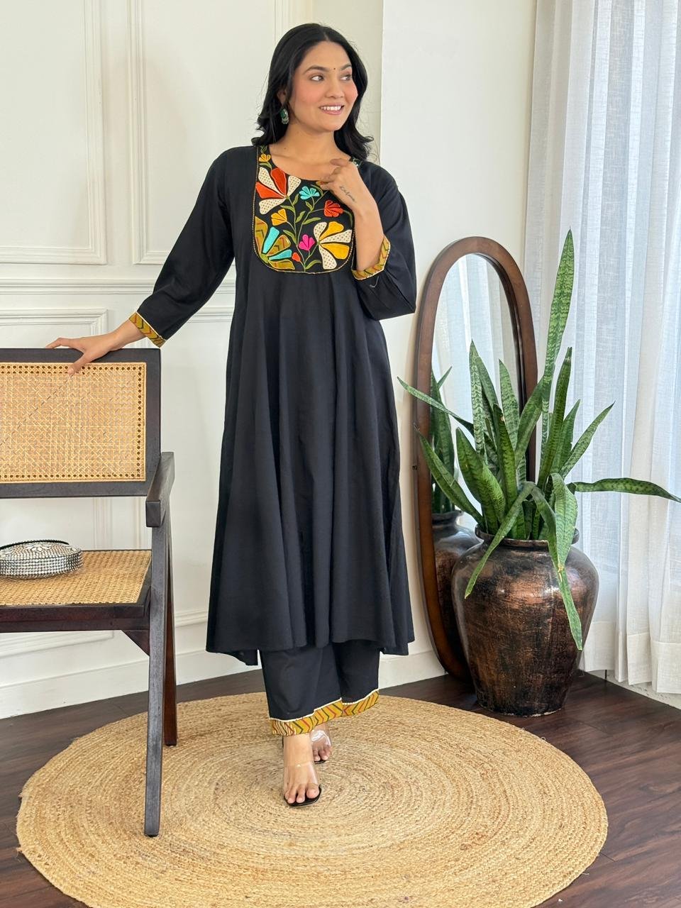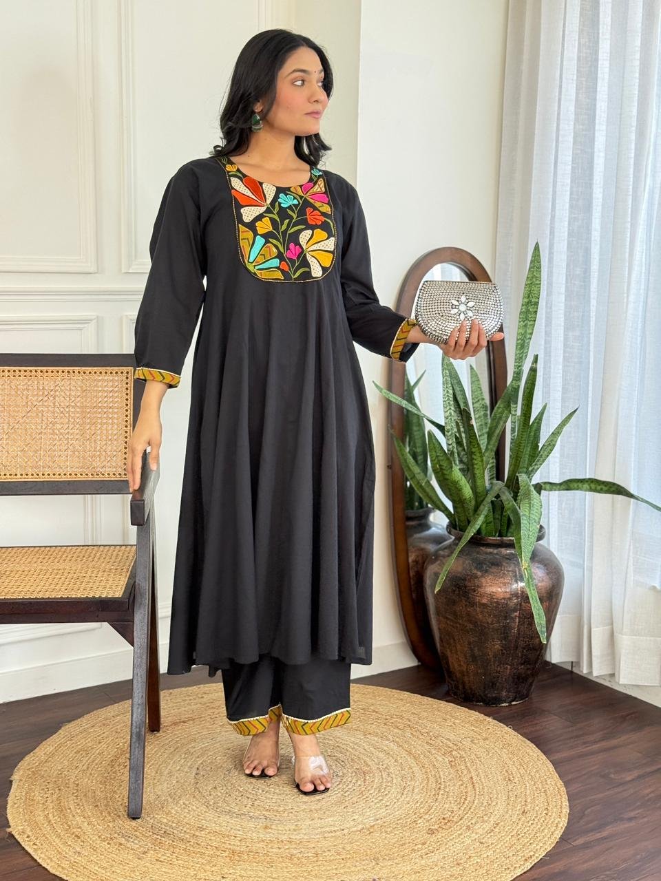 The kurta features a beautifully embroidered yoke and a distinctive shoulder-to-daman times pattern, enhanced by a 20-kali flare that adds flow and elegance. Available in Teal and Black, this ensemble is ideal for festive daytime events, family functions, and refined casual wear.