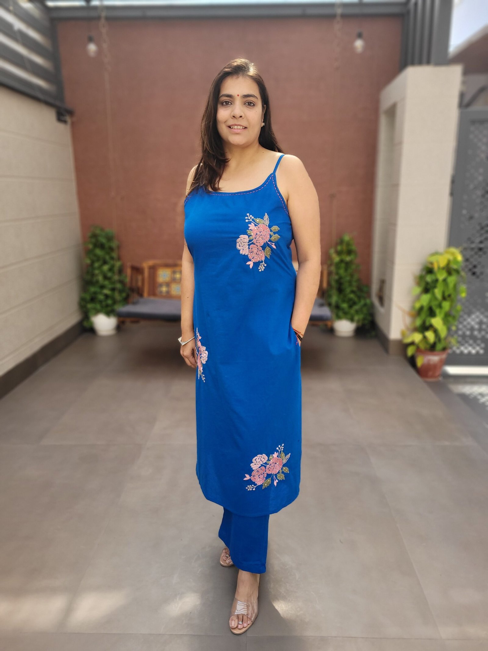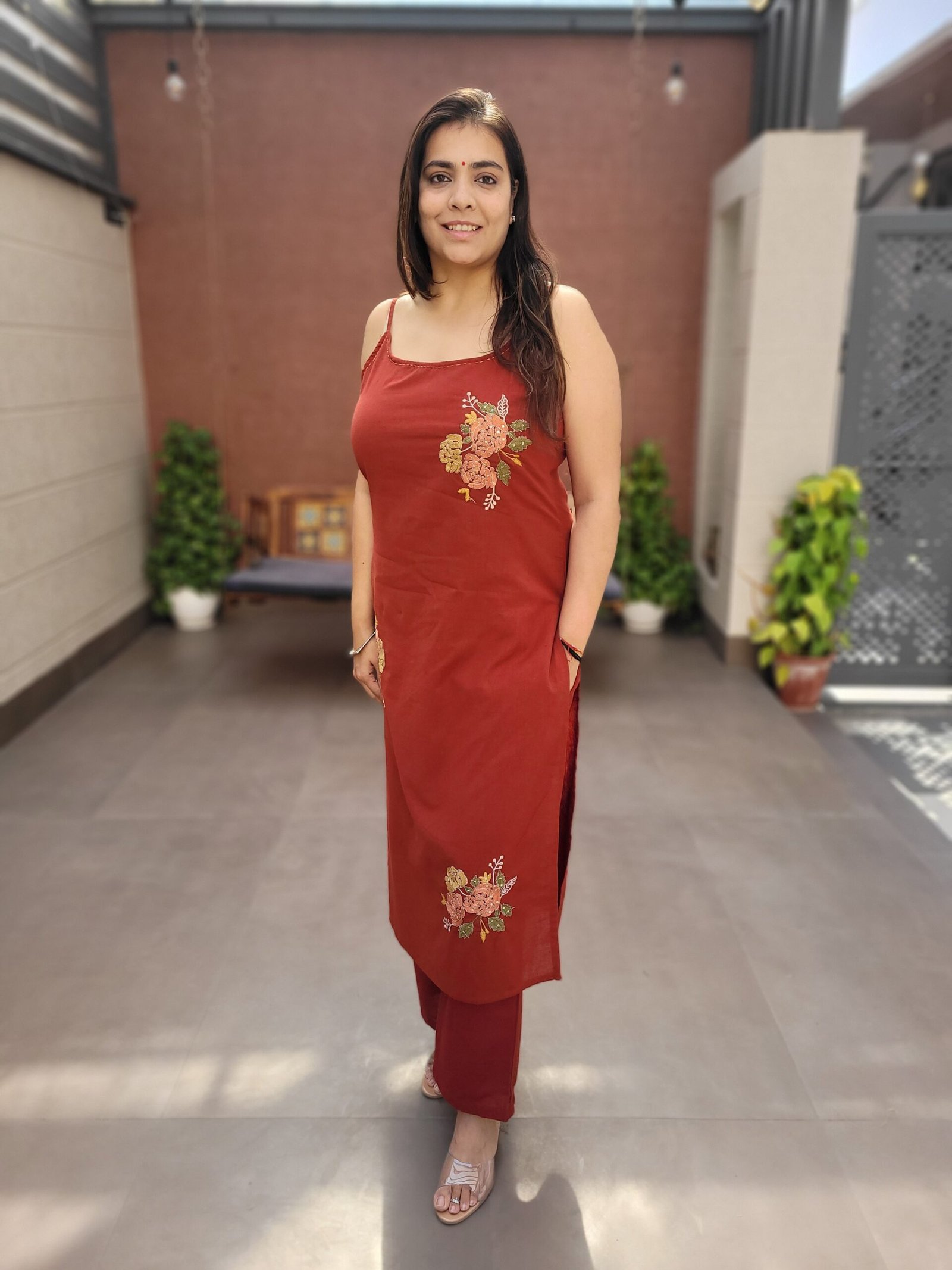 Featuring delicate spaghetti sleeves and a beautifully embroidered panel, the kurta offers a sleek, contemporary silhouette while keeping the look elegant and refined. The lightweight fabric ensures ease of movement, making it perfect for casual outings, vacations, brunch dates, or relaxed daywear.