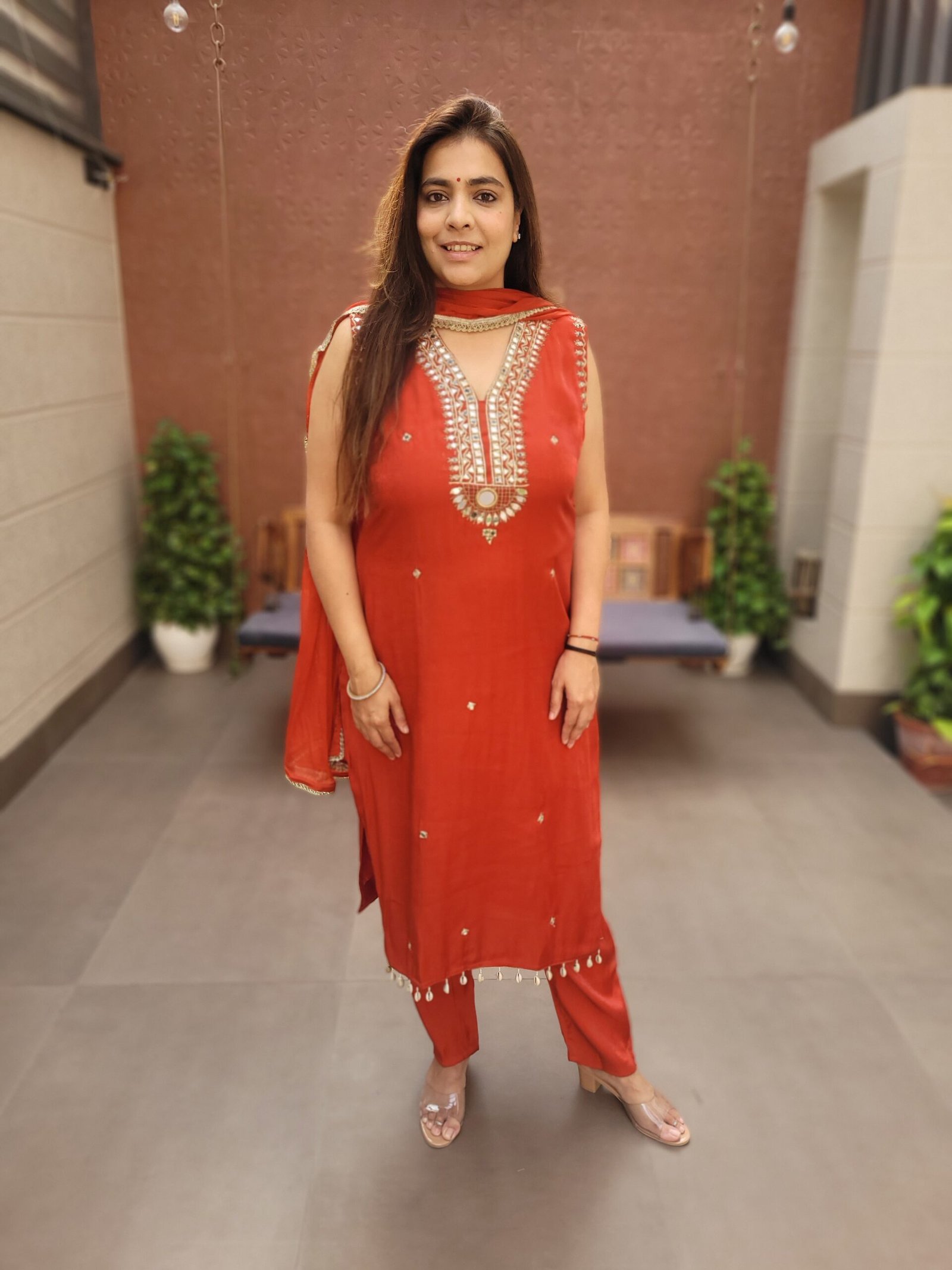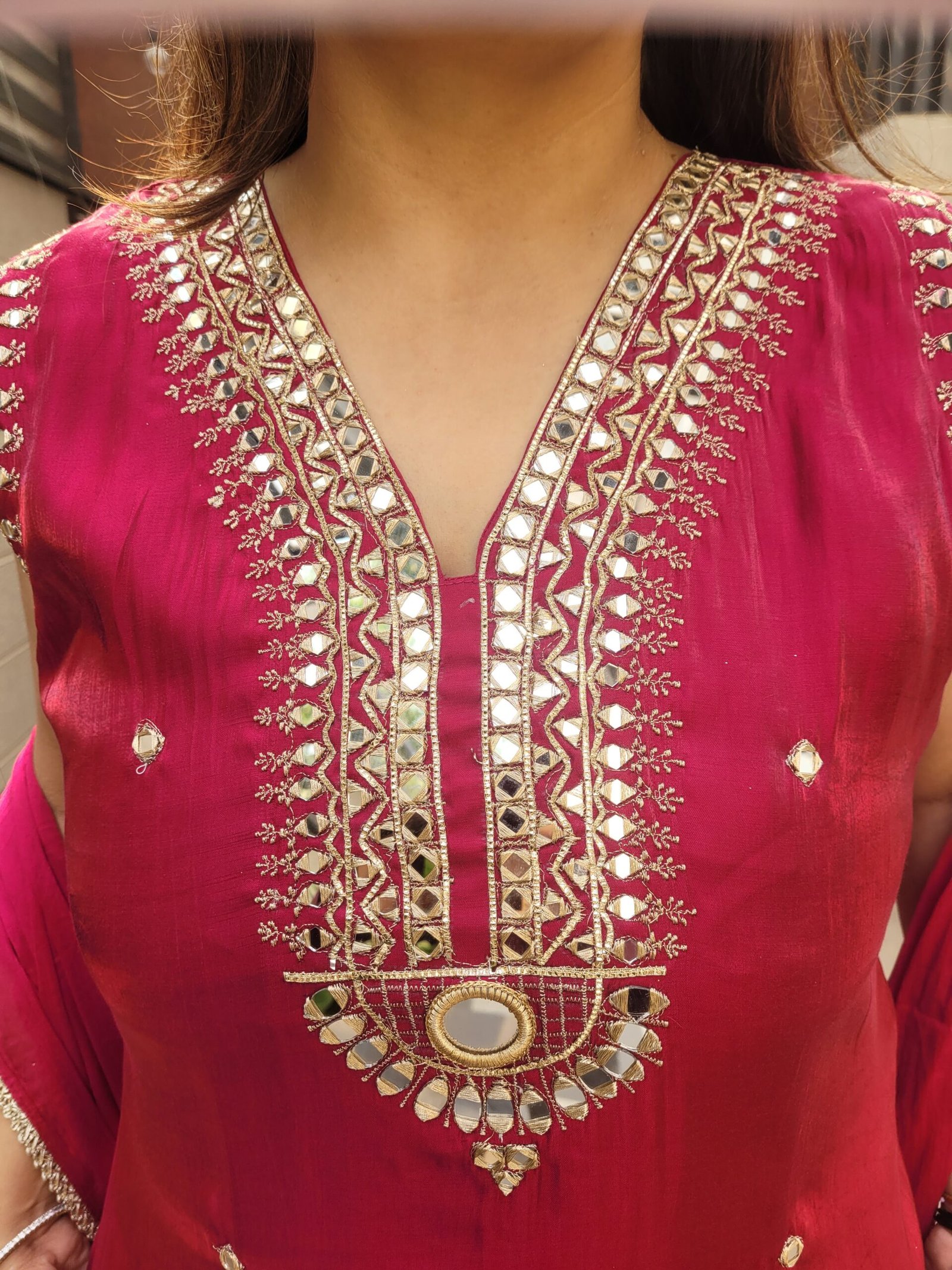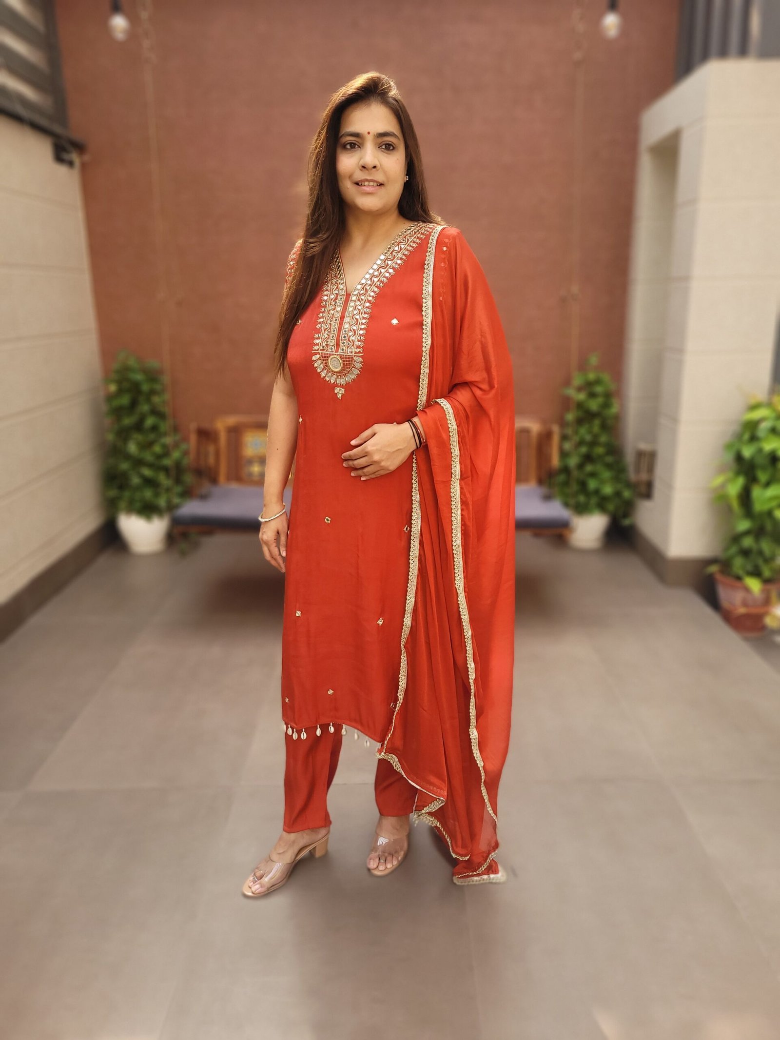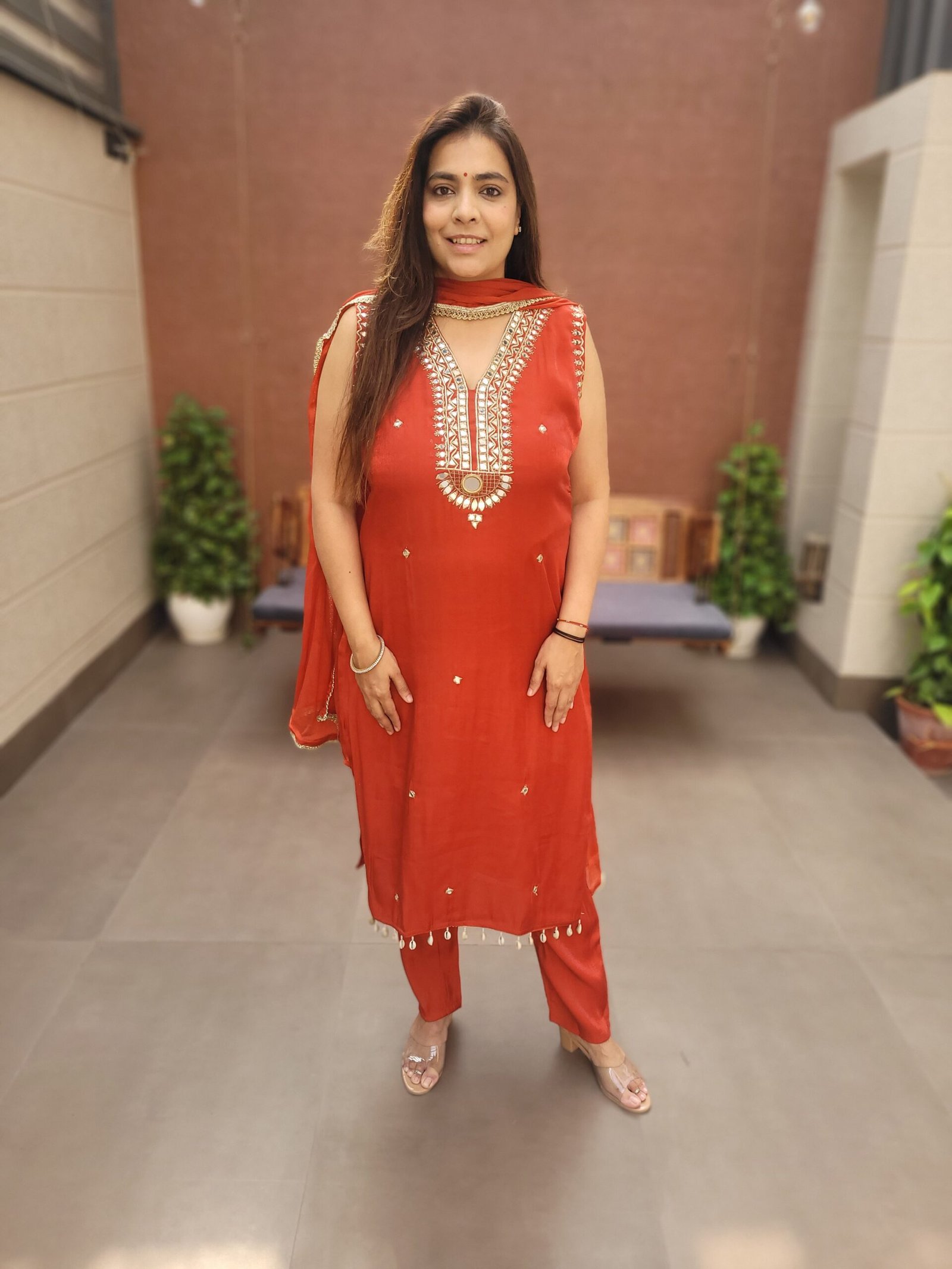 DU-312 is designed for contemporary festive elegance, combining Roman fabric with traditional mirror and zari detailing.