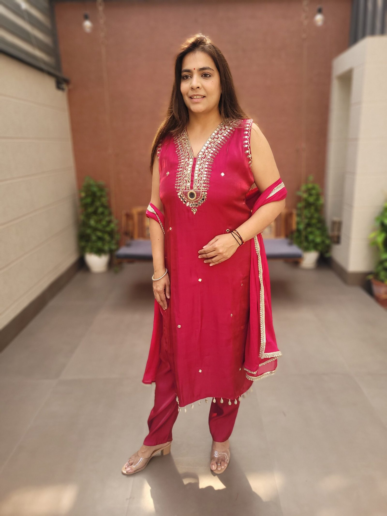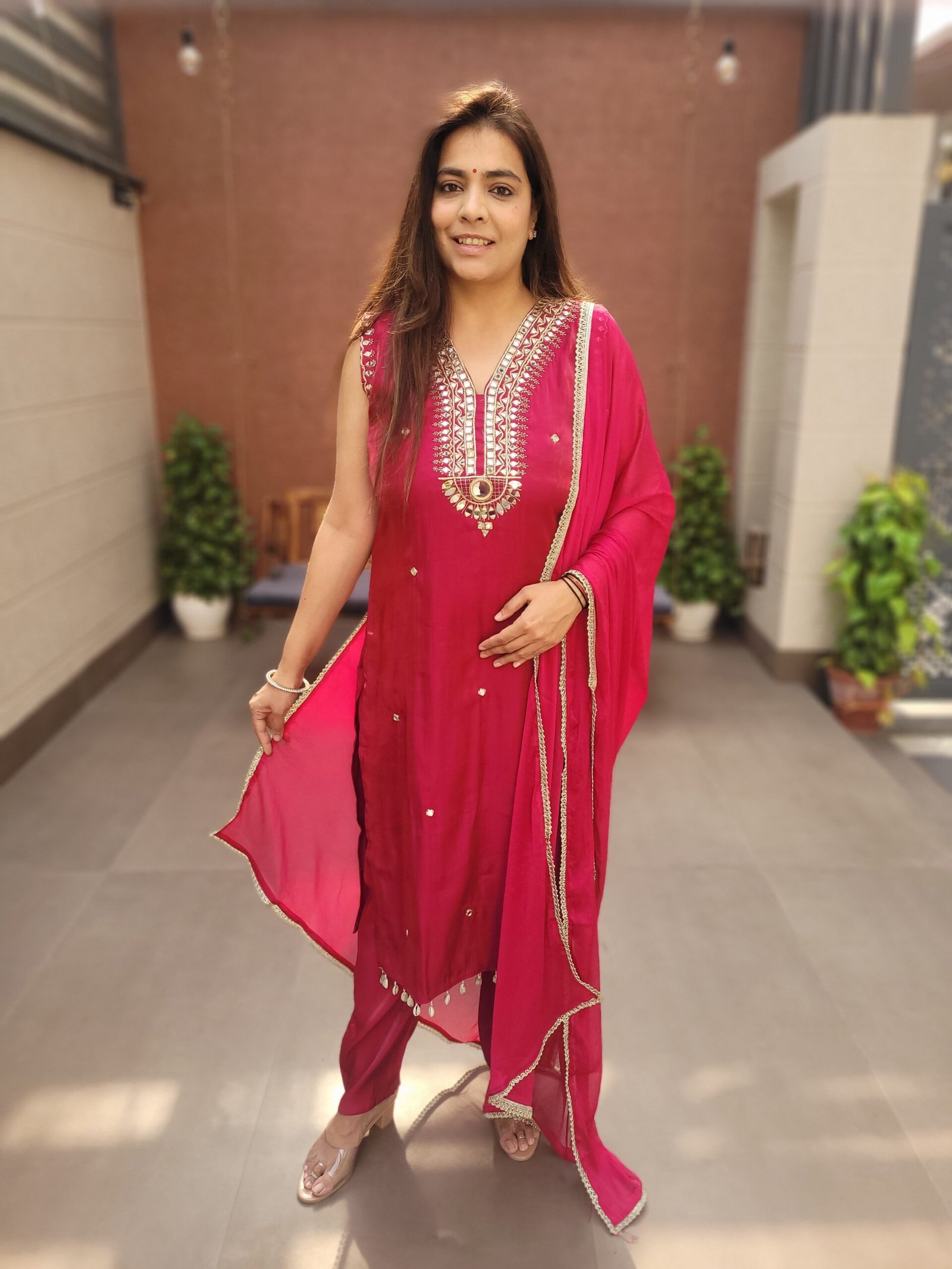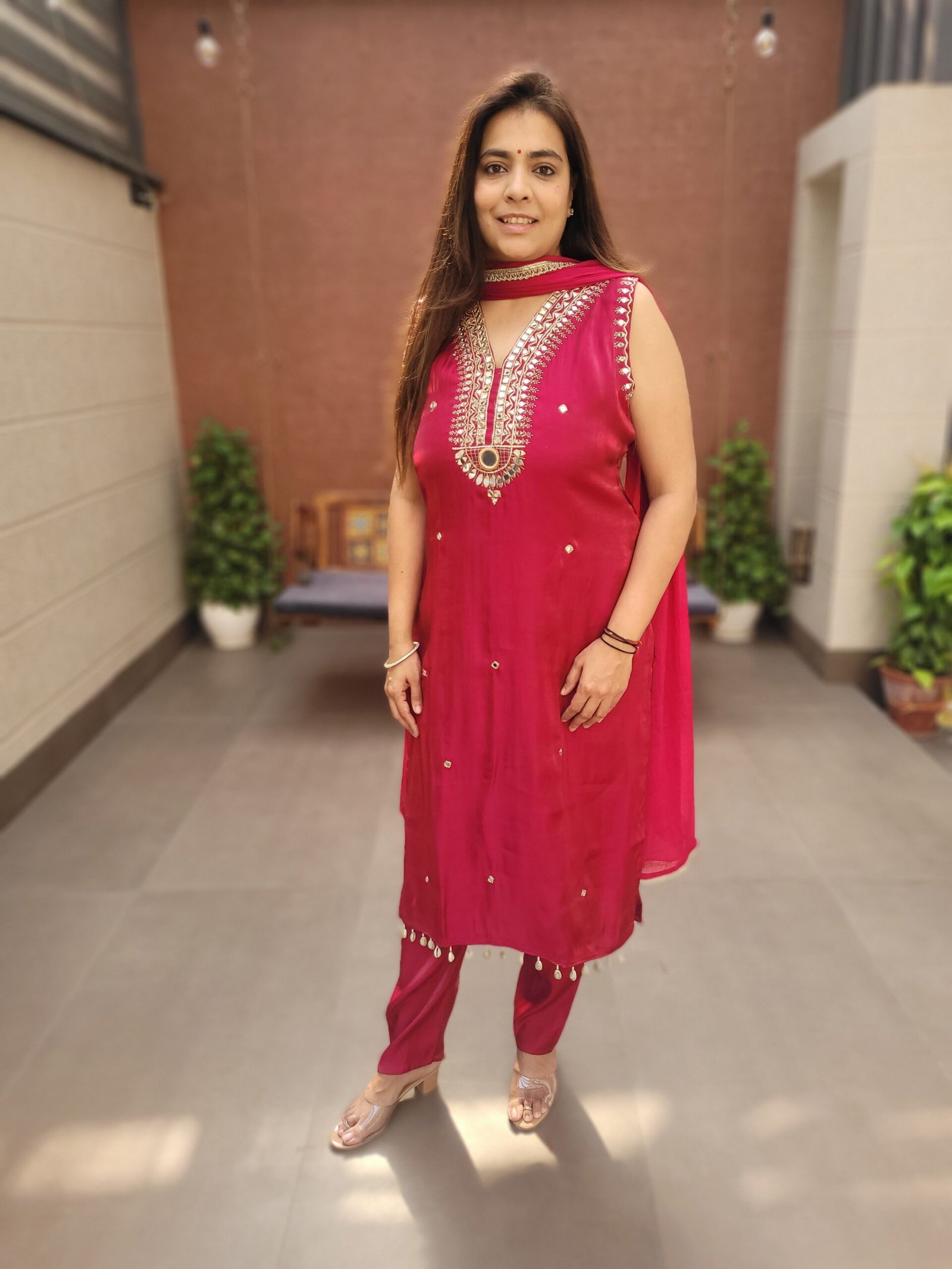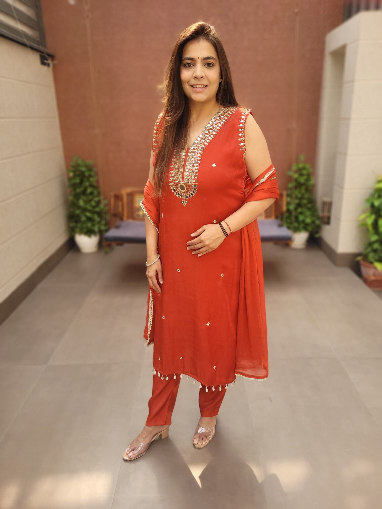 DU-312 is designed for contemporary festive elegance, combining Roman fabric with traditional mirror and zari detailing.