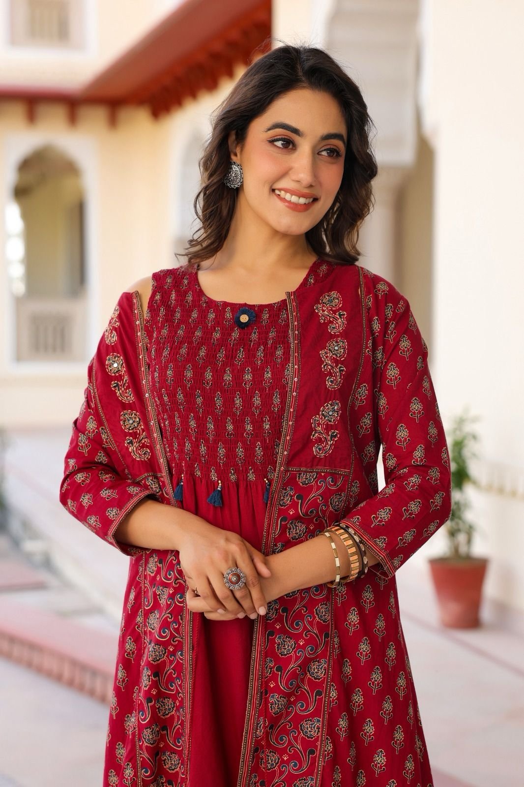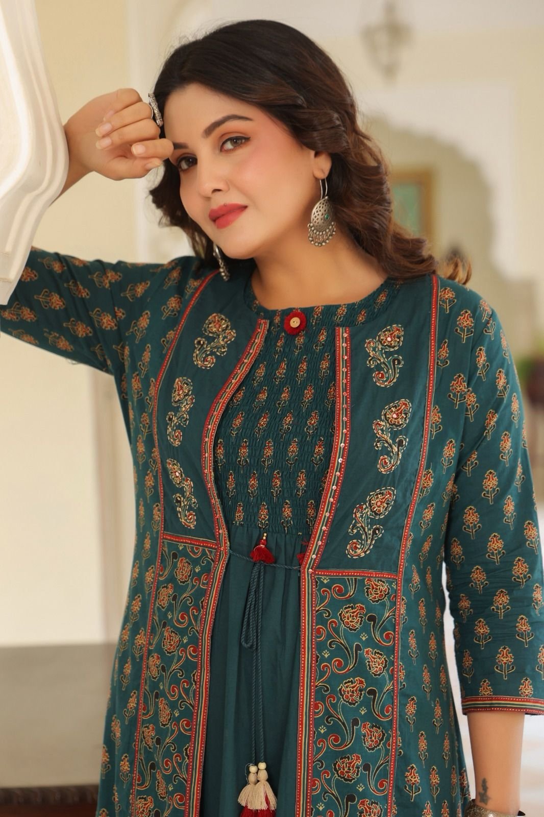 The highlight of the ensemble is the Ajrakh printed shrug with delicate handwork, which adds a beautiful handcrafted touch to the outfit. The smoking-style dress provides a flattering and comfortable silhouette, making it both elegant and trendy.