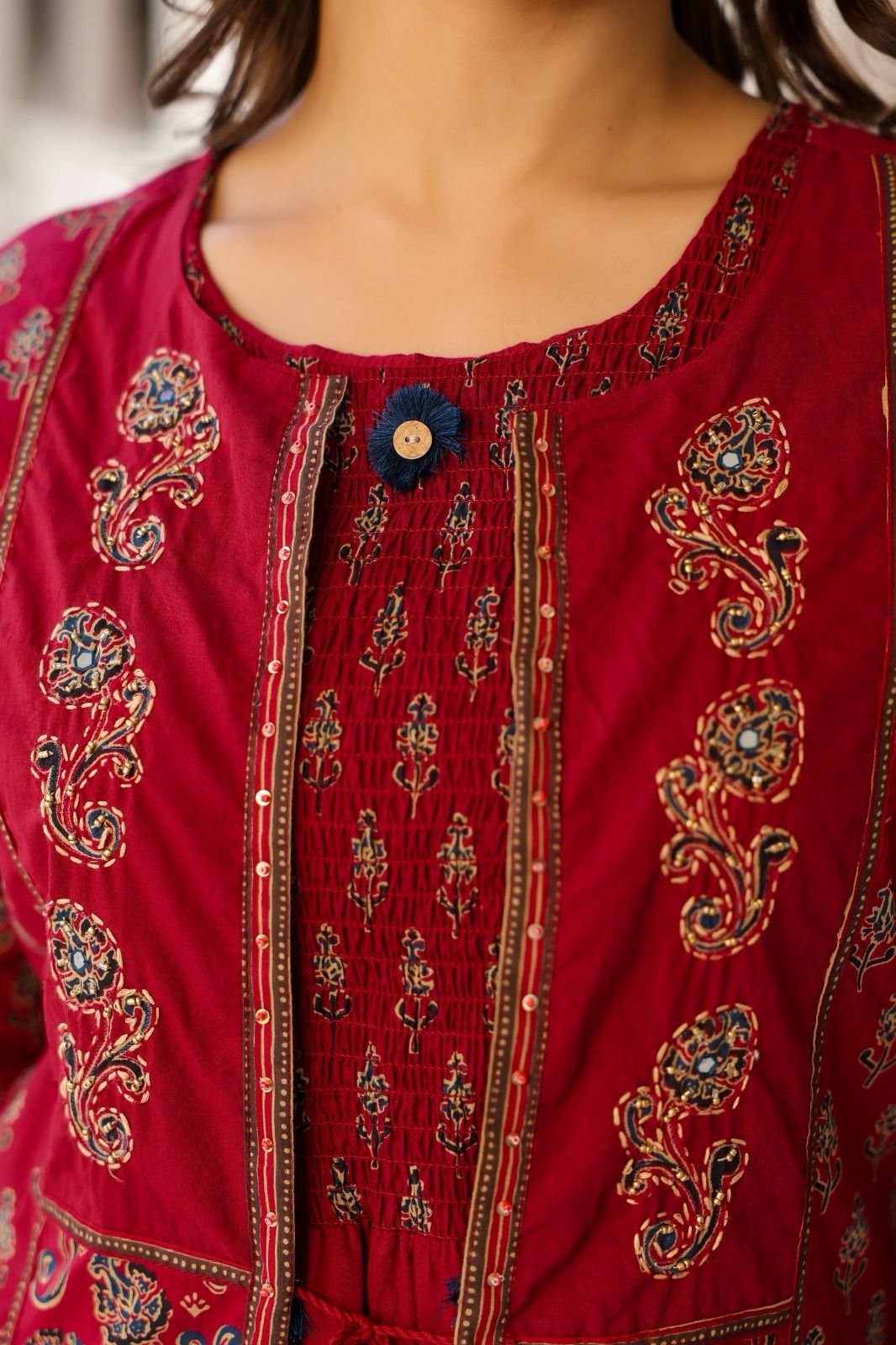 Care Tips: Gentle hand wash recommended to preserve the print and handwork.