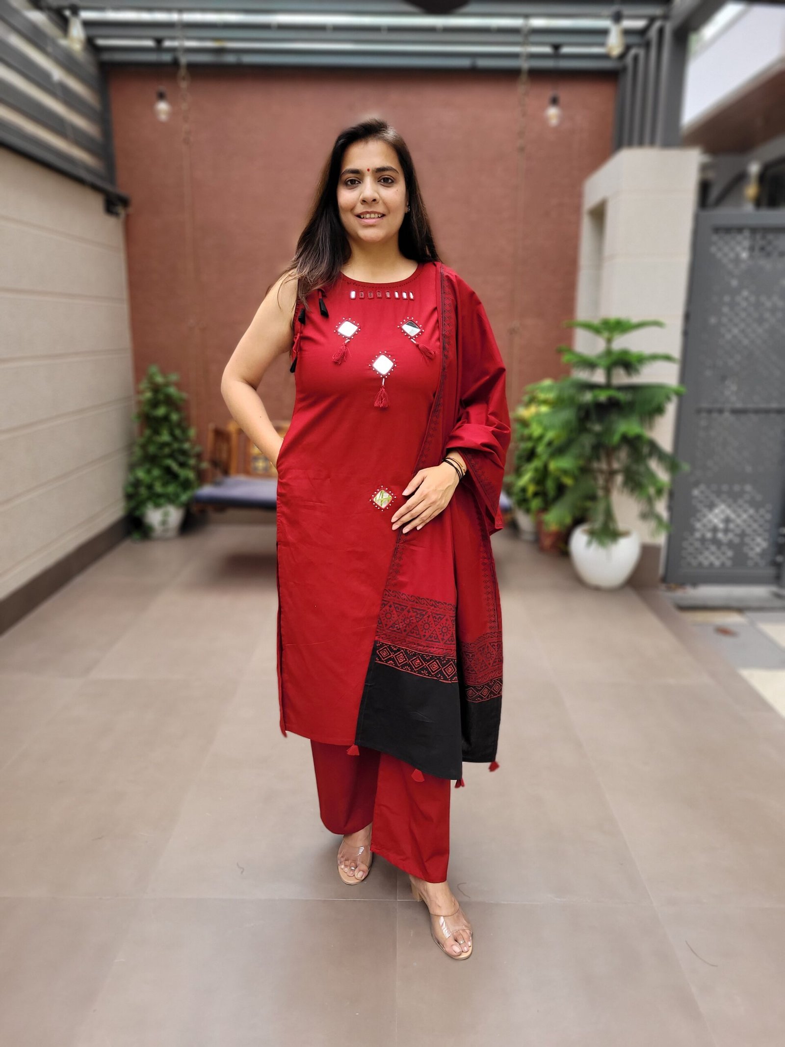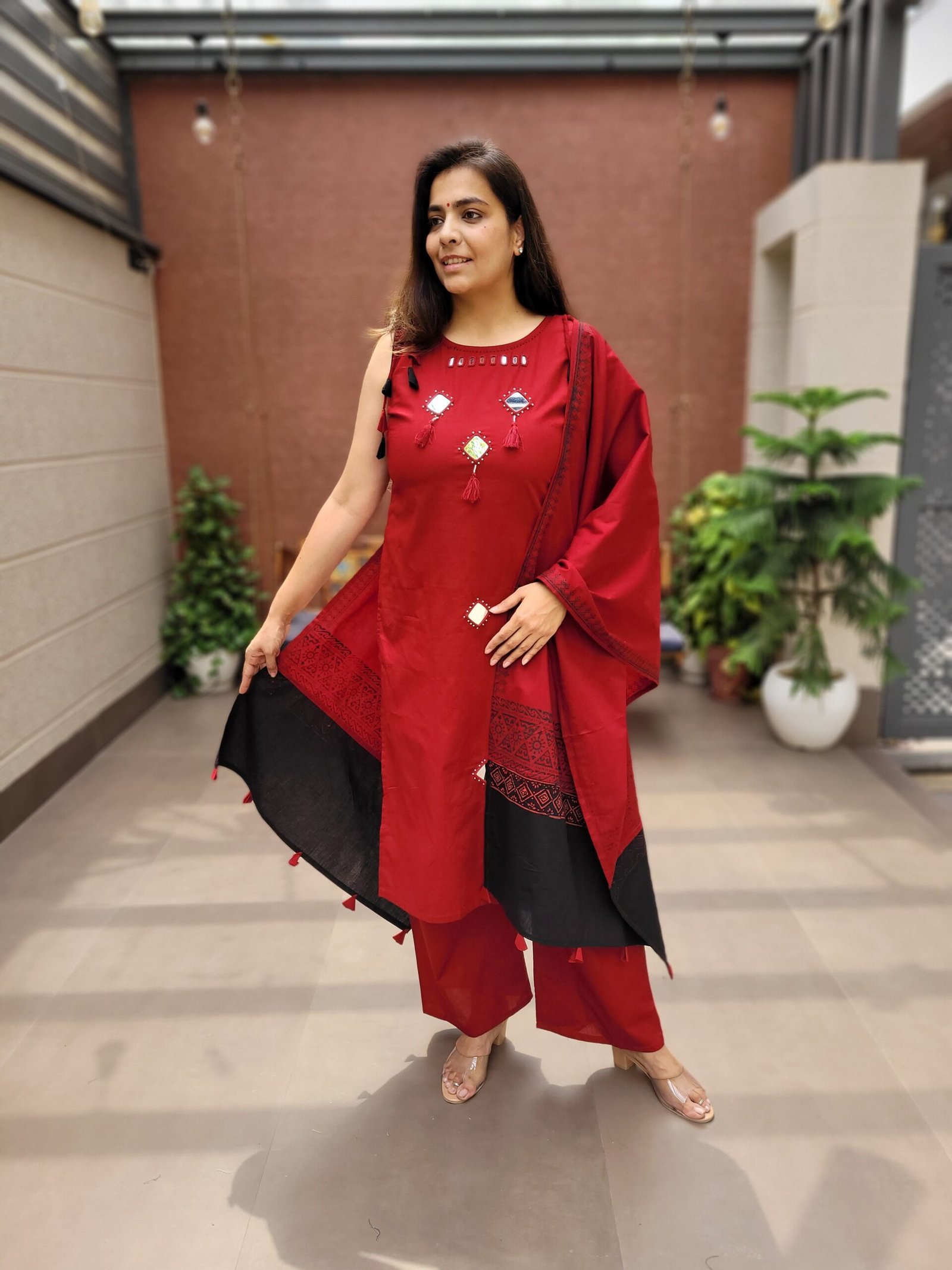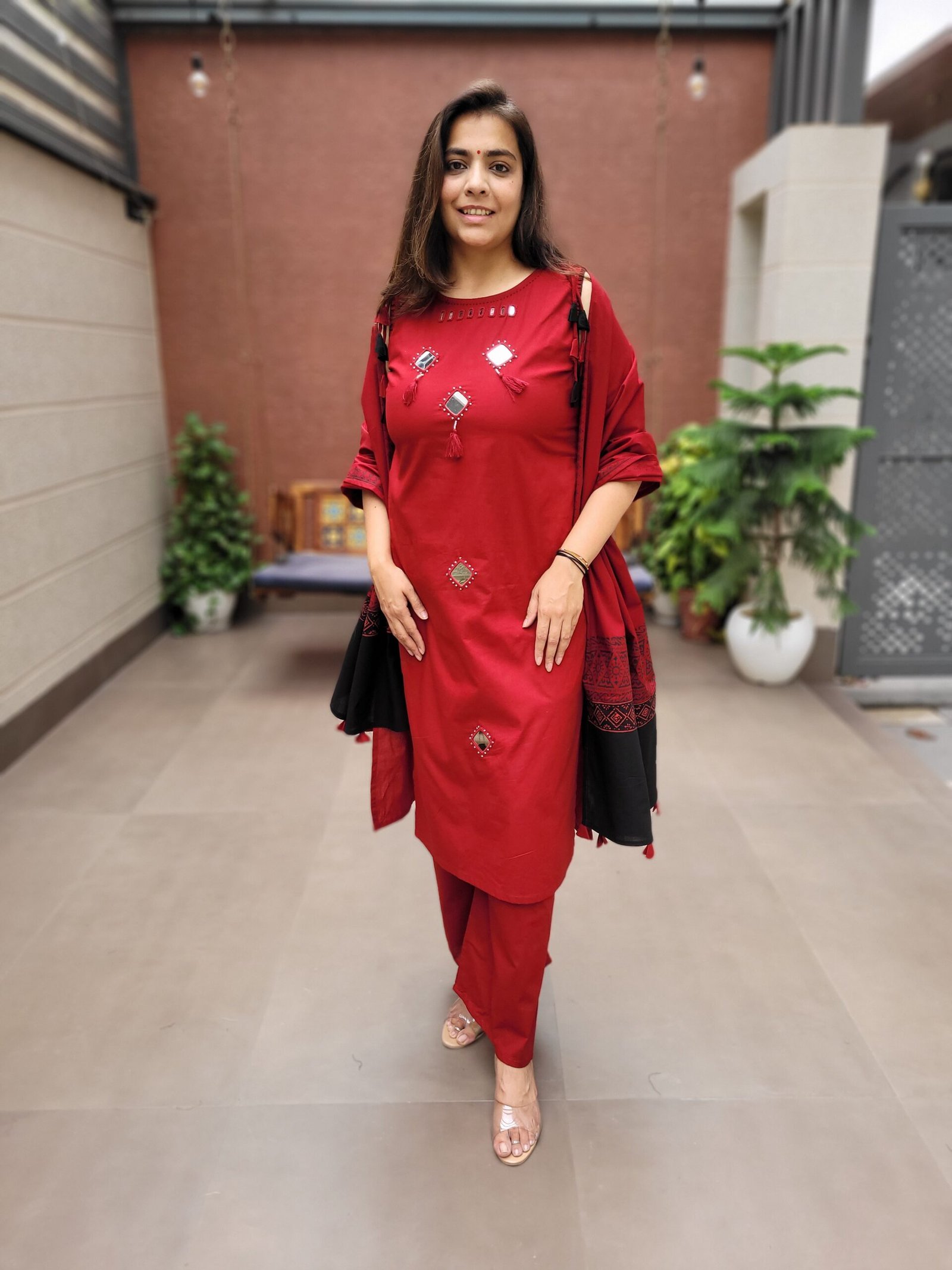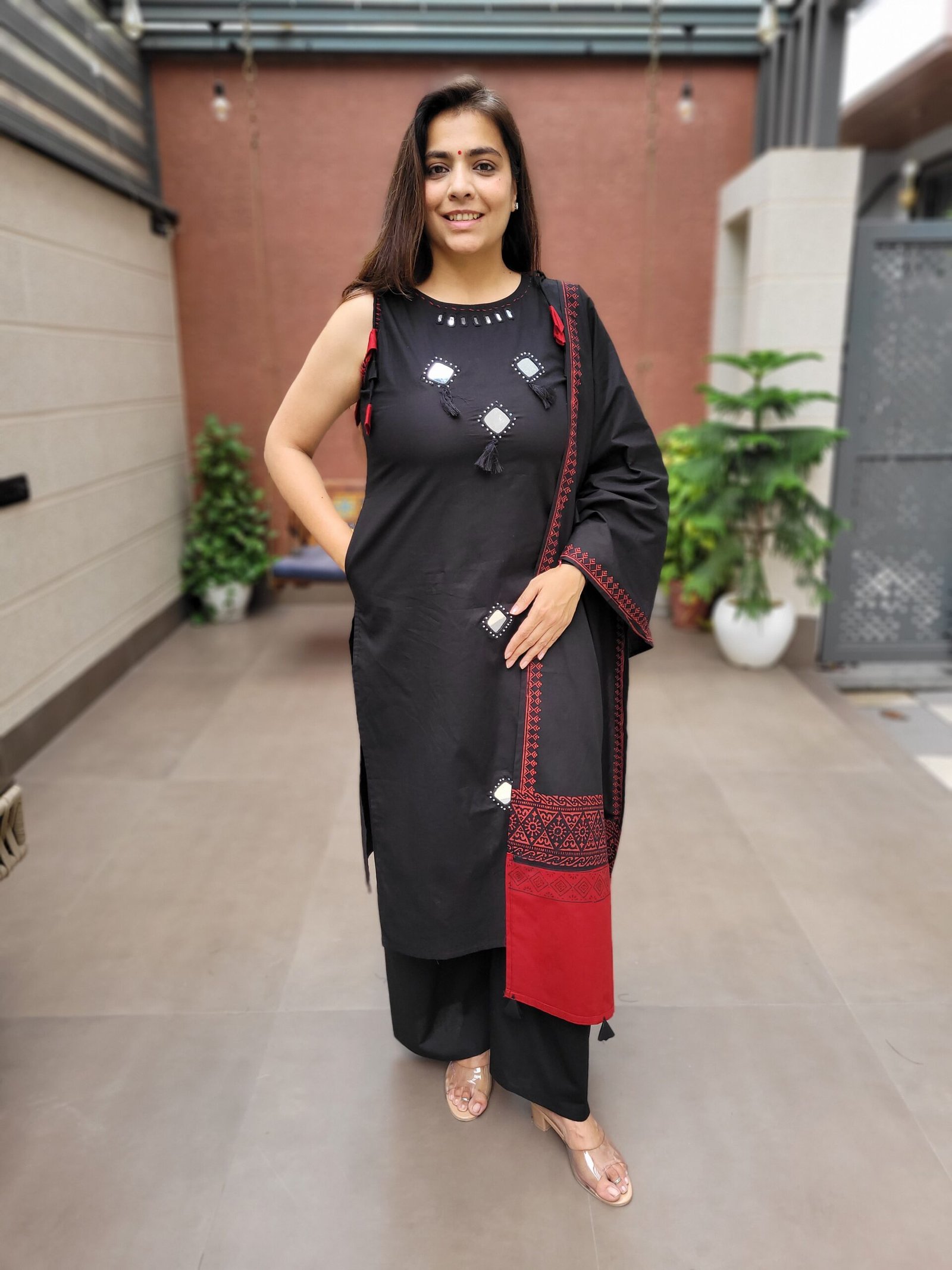 The kurta features handwork with original mirror work, adding festive charm. The attached sleeves option allows flexible styling, making it ideal for parties, casual gatherings, and festive occasions.