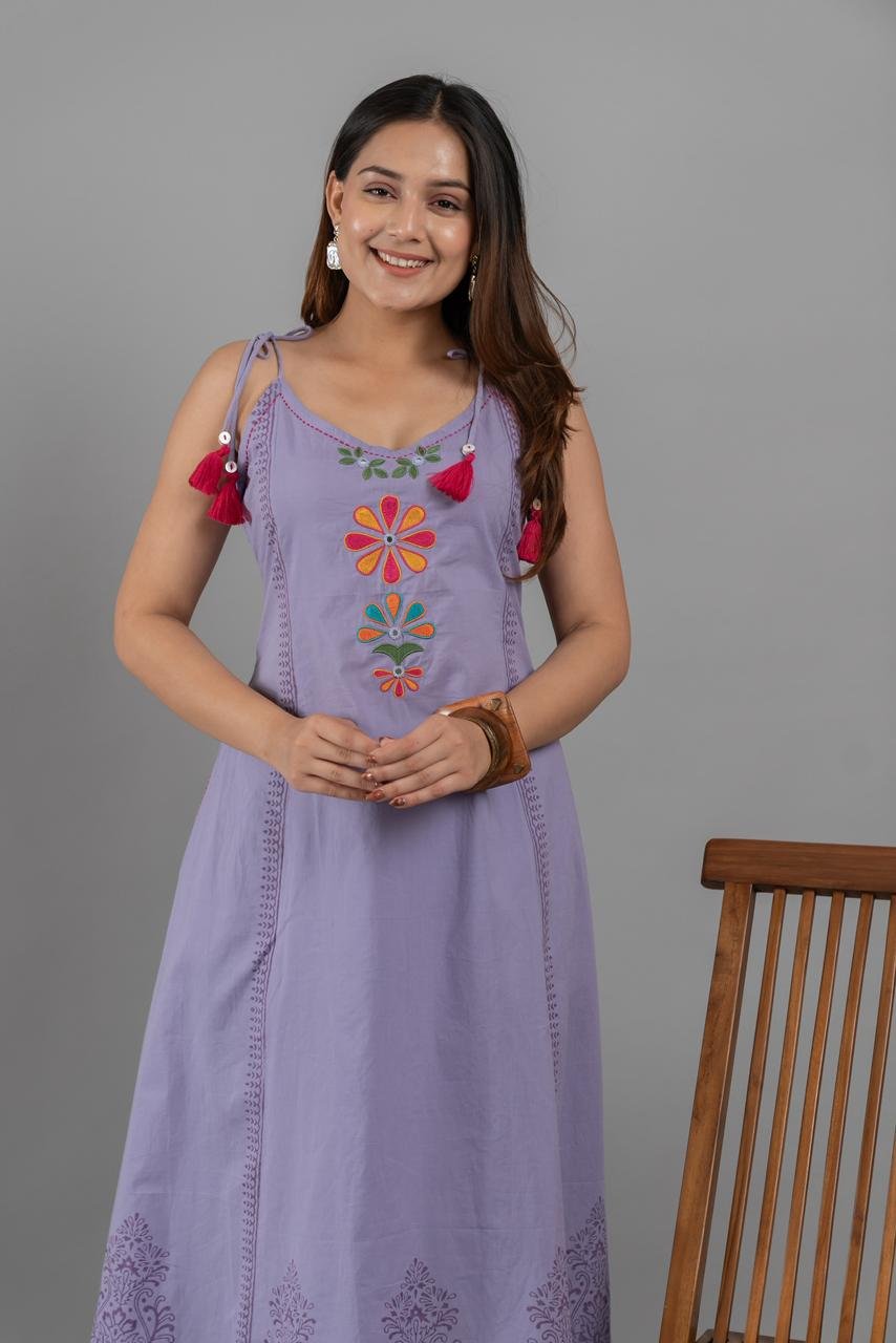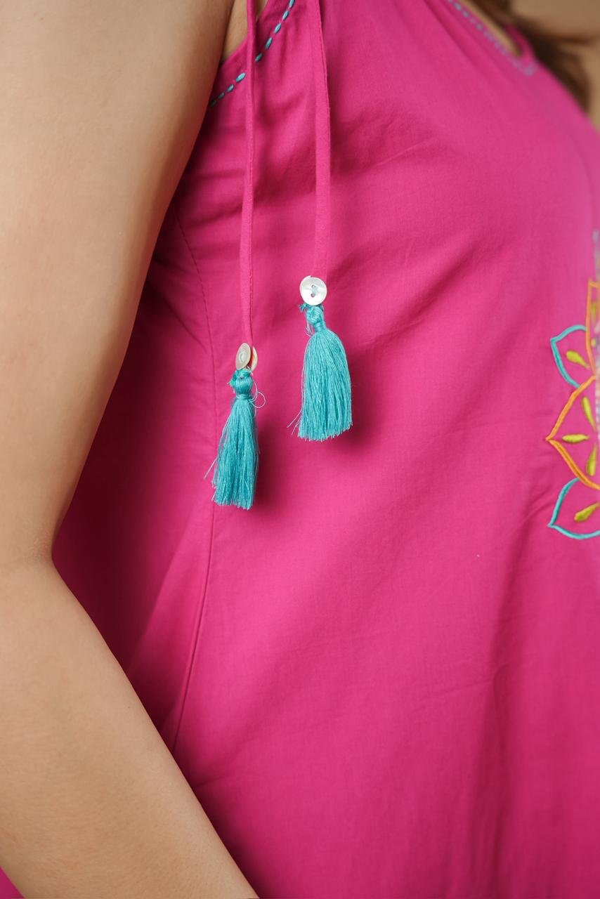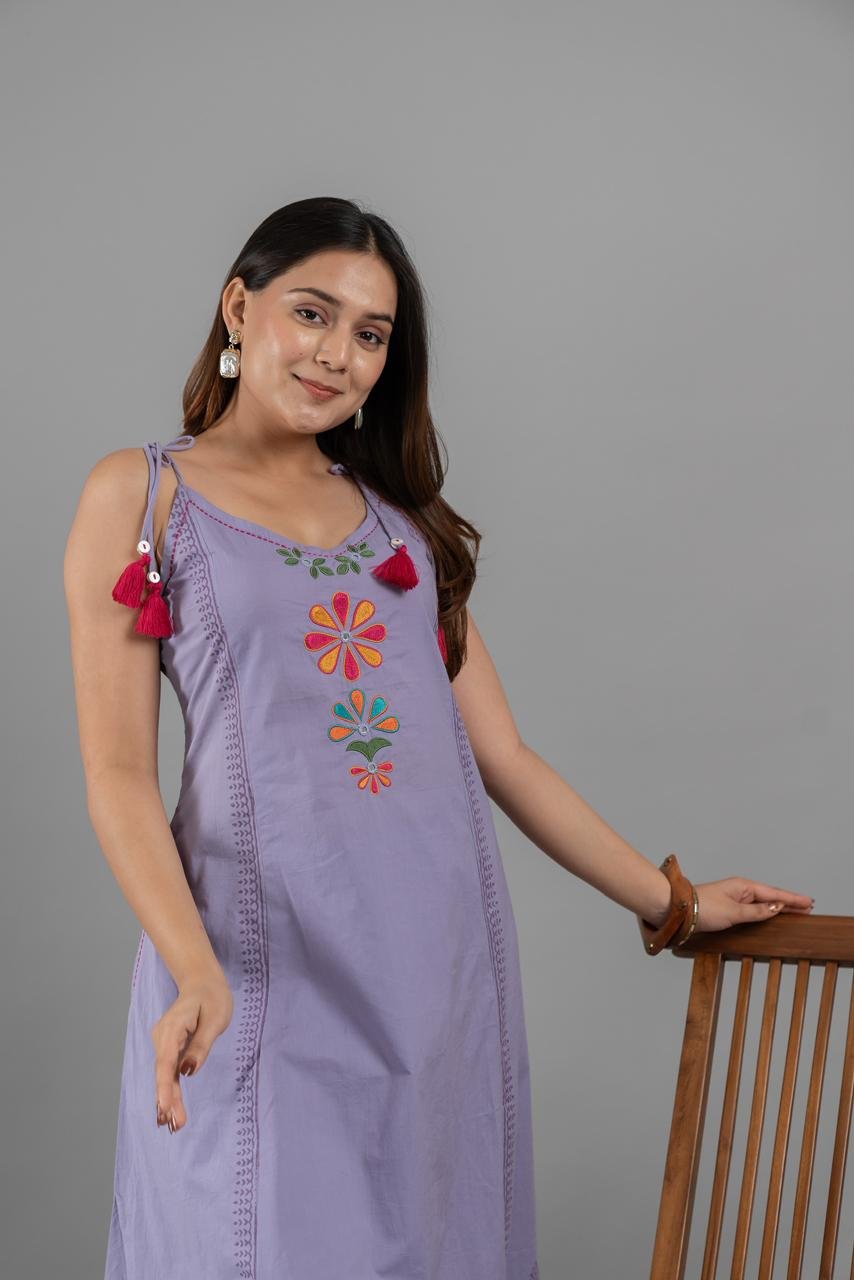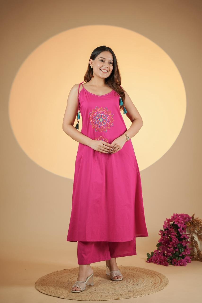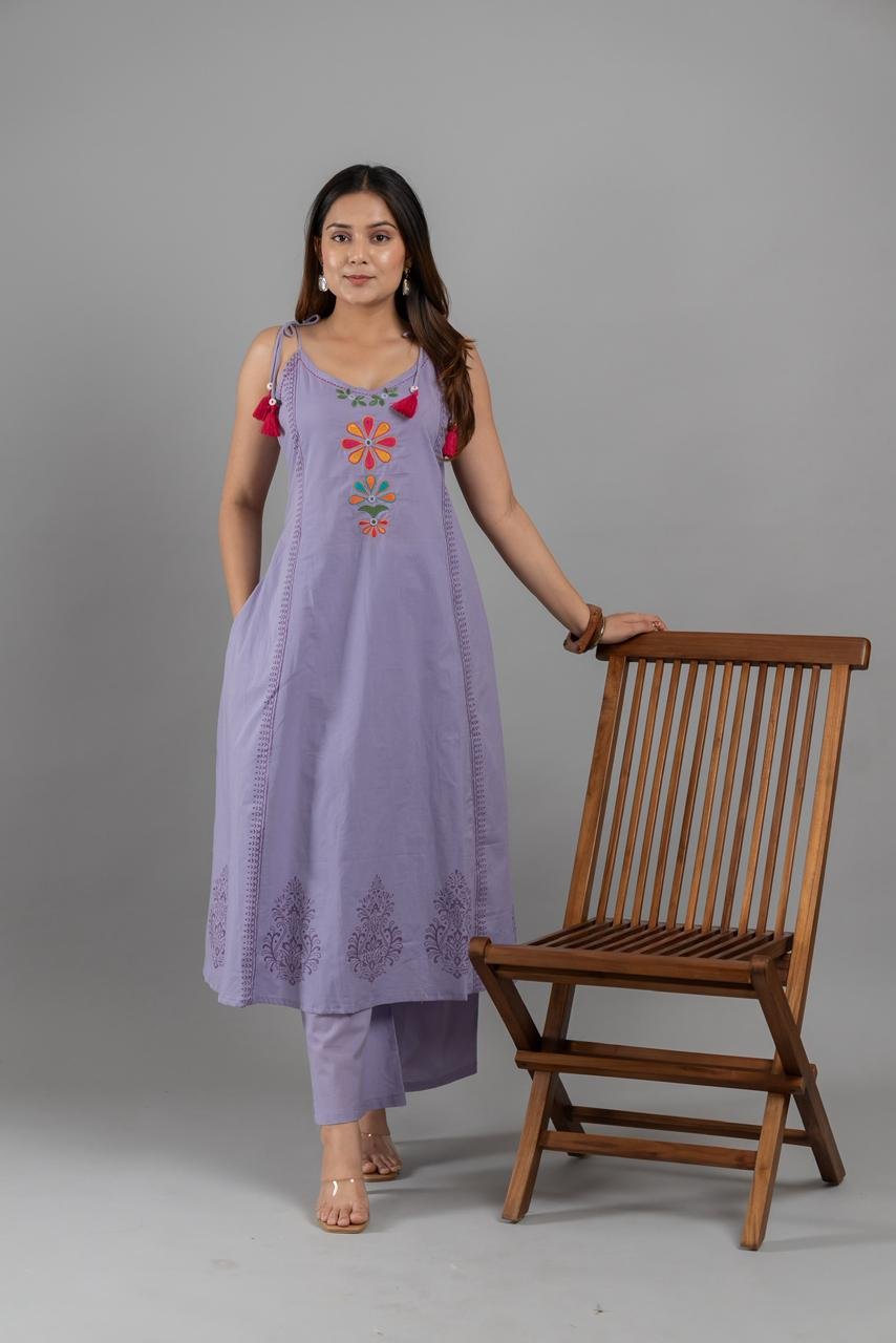 The A-line kurta with spaghetti-style design adds a trendy touch, while the elegant embroidery enhances the overall appeal. The outfit also features double side pockets, combining fashion with practicality.