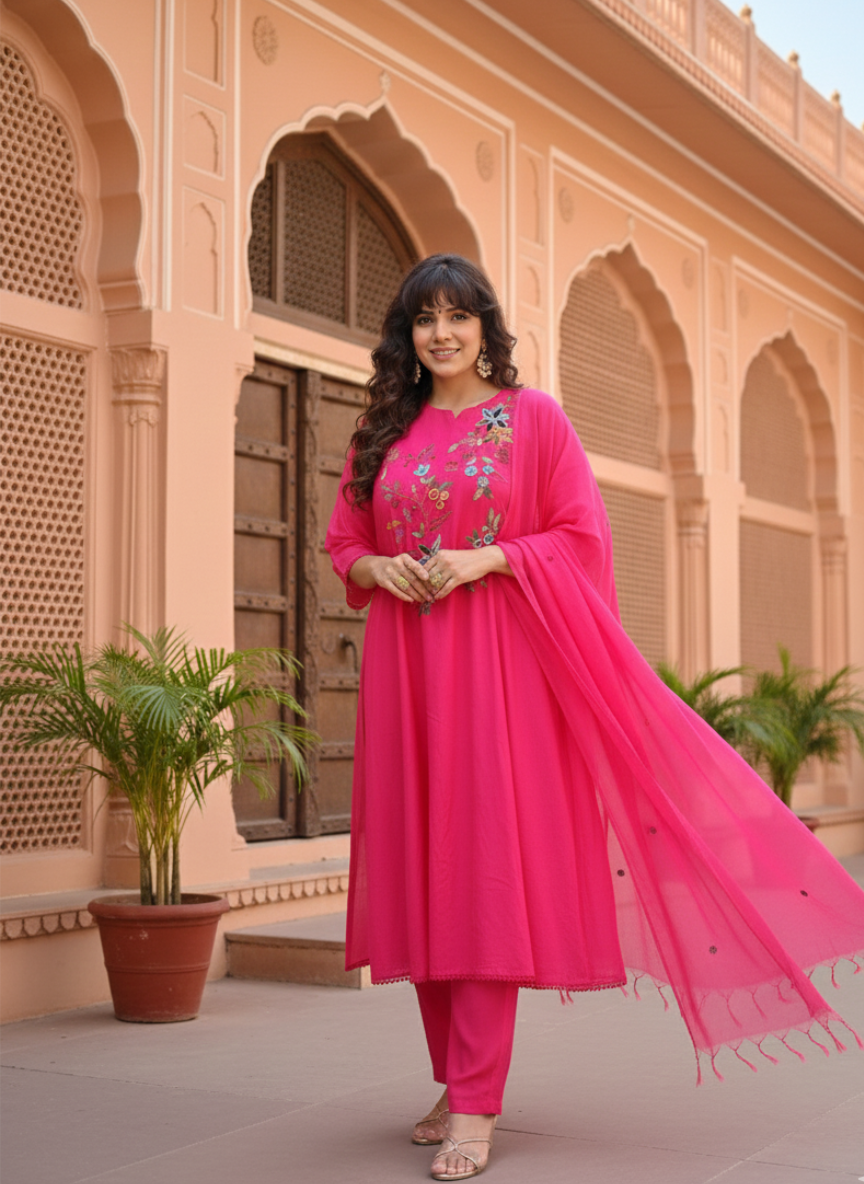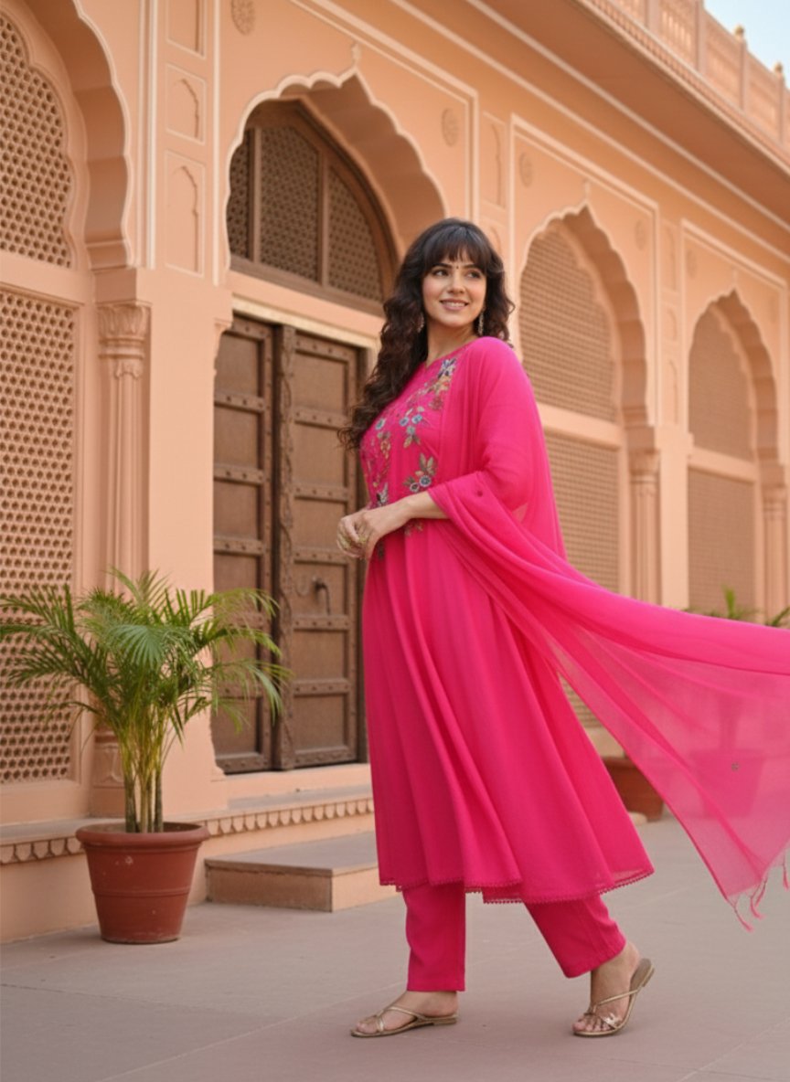 Available in sizes 38 to 44, this 3-piece suit set comes in two vibrant shades – Rani and Liril – making it perfect for weddings, festive gatherings, and special occasions where traditional elegance is desired.