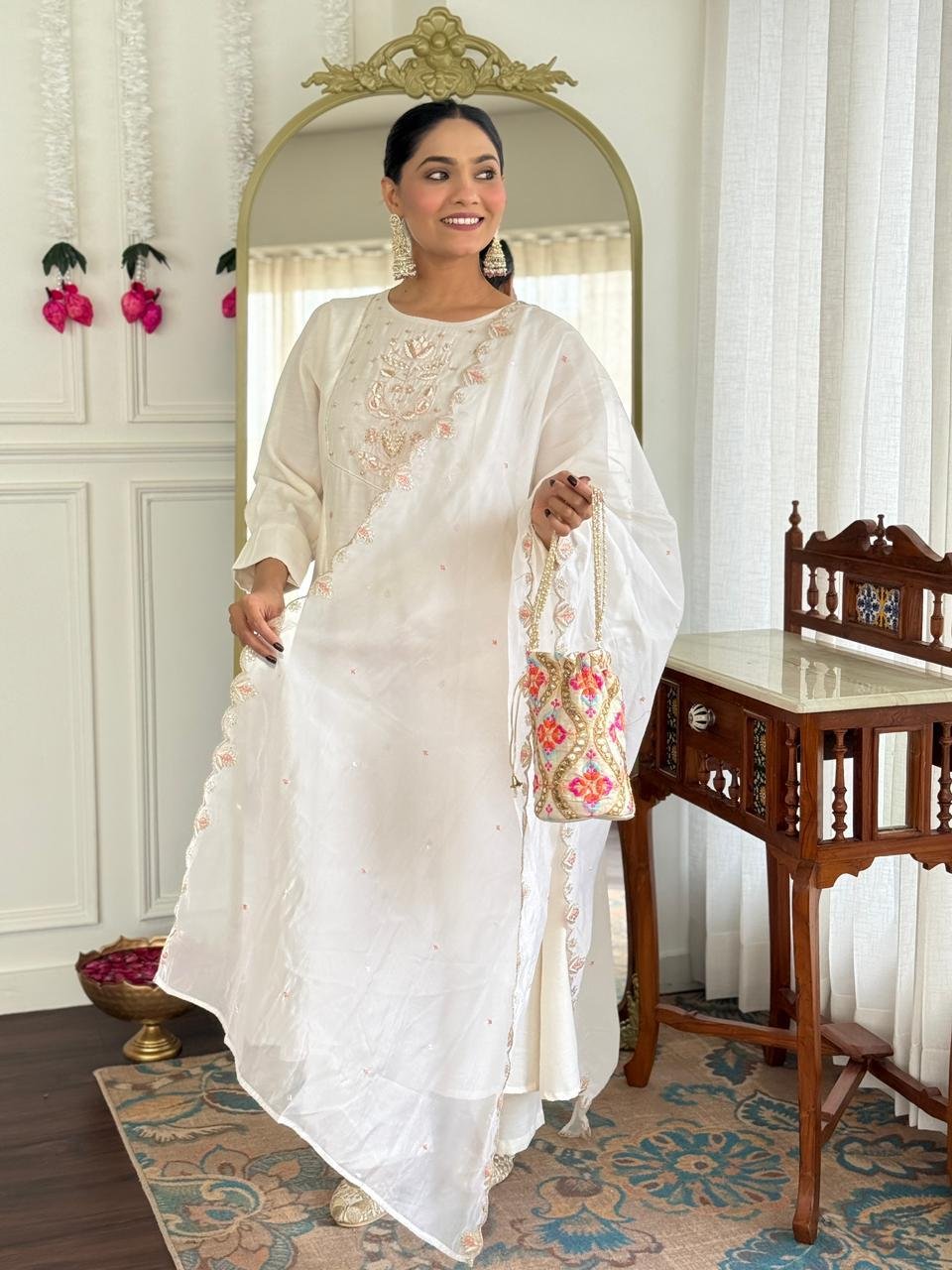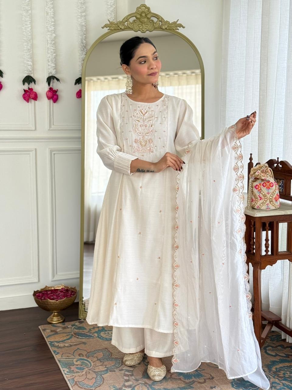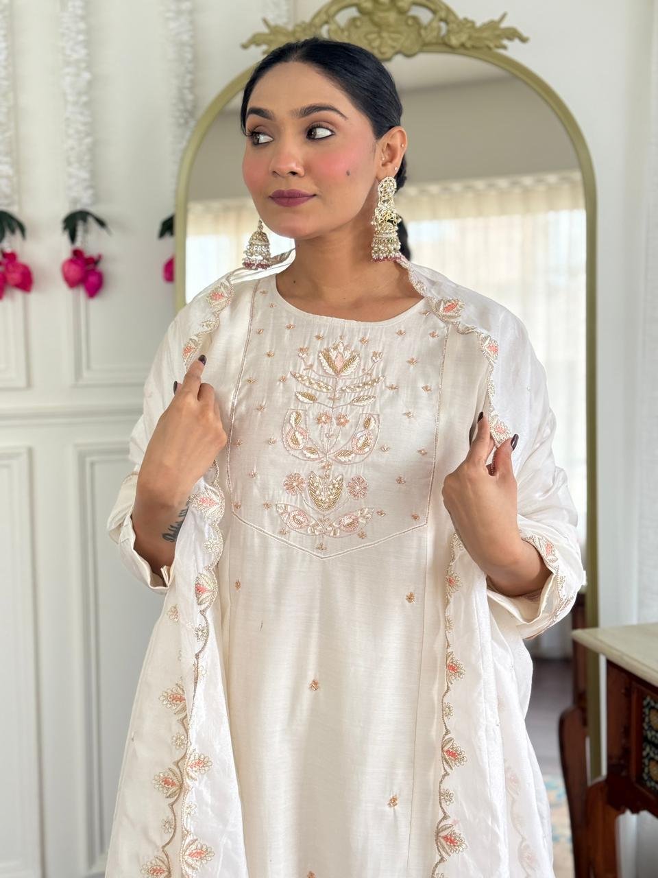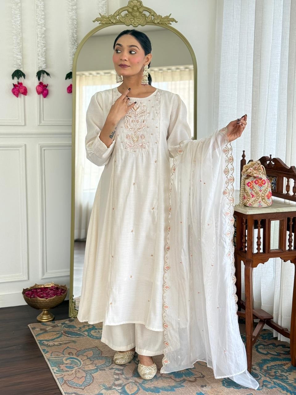 The DU-429 Stylish 3PC Suit Set is crafted from soft, breathable Roman fabric, offering a luxurious feel and comfortable fit. The princess kali style top features exquisite Khatt work, paired with Roman plazzo pants with cover stitching and an elegant organza dupatta with cut work for a complete, graceful ensemble.