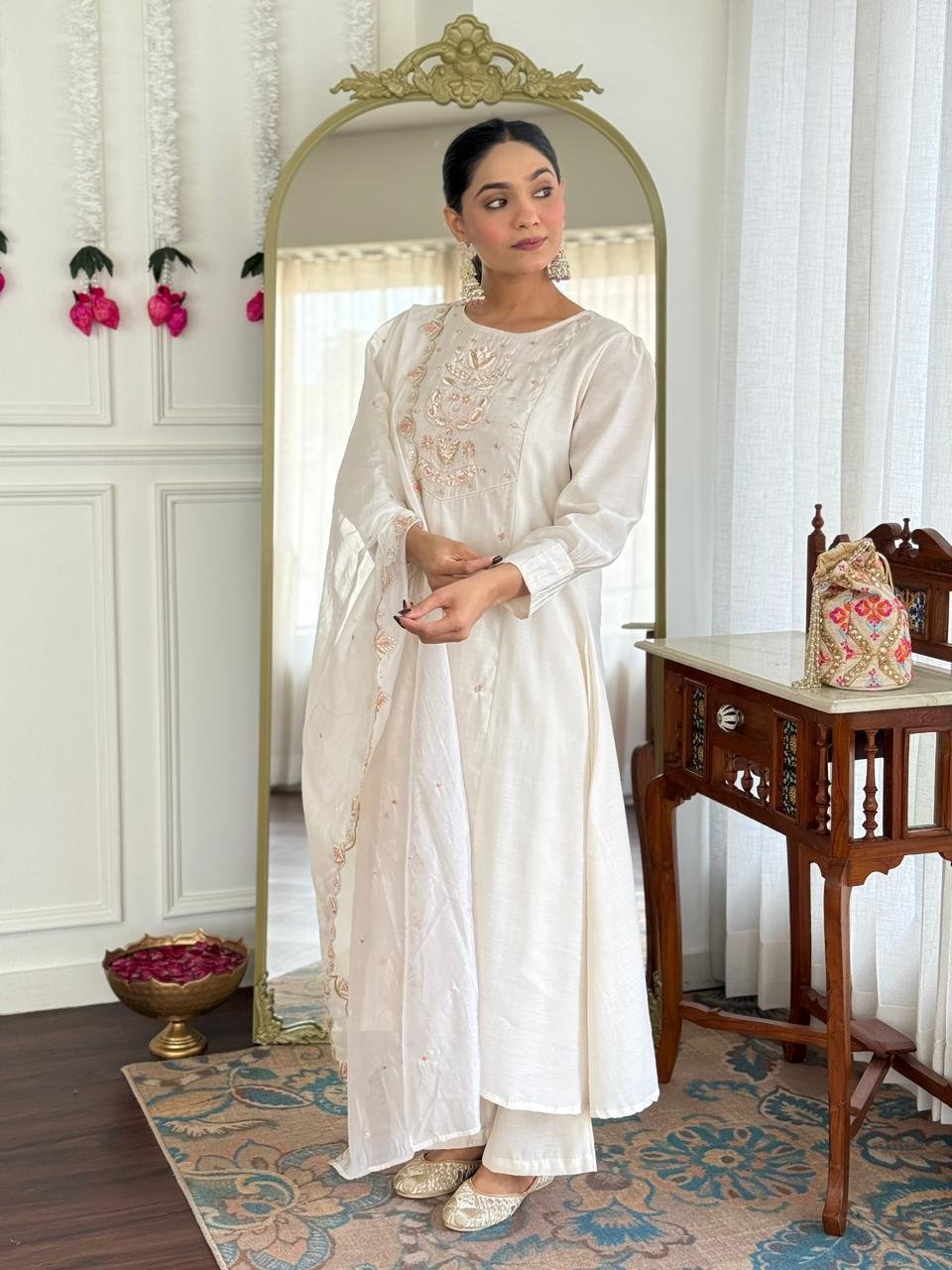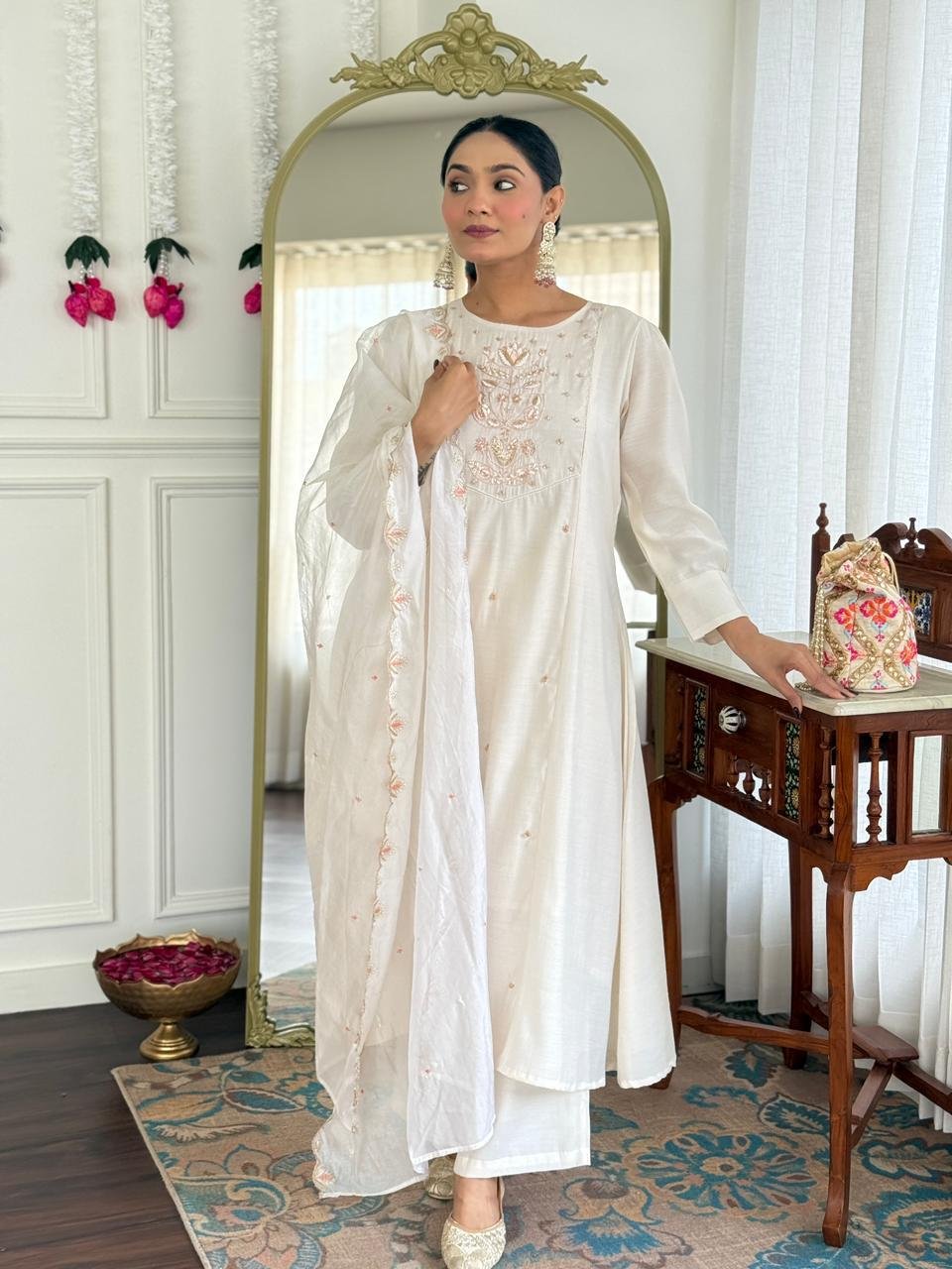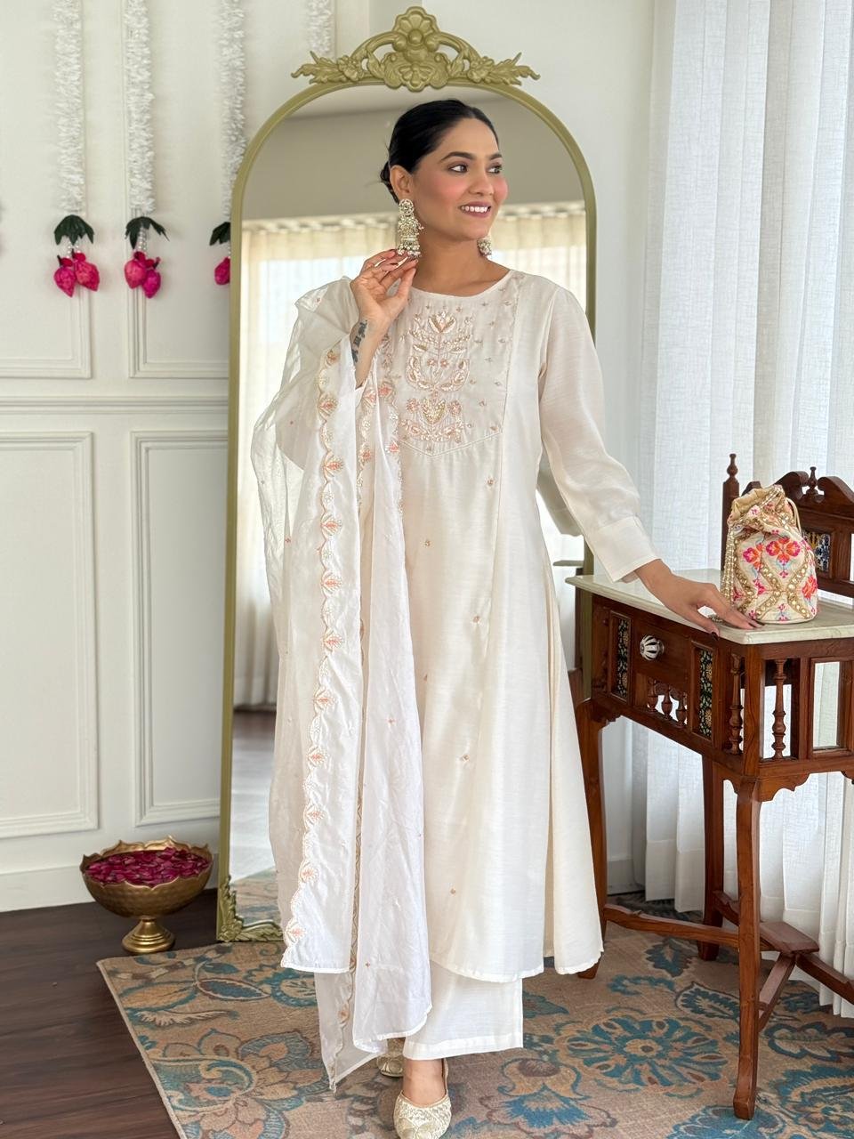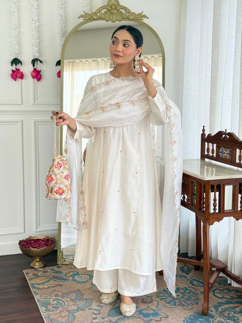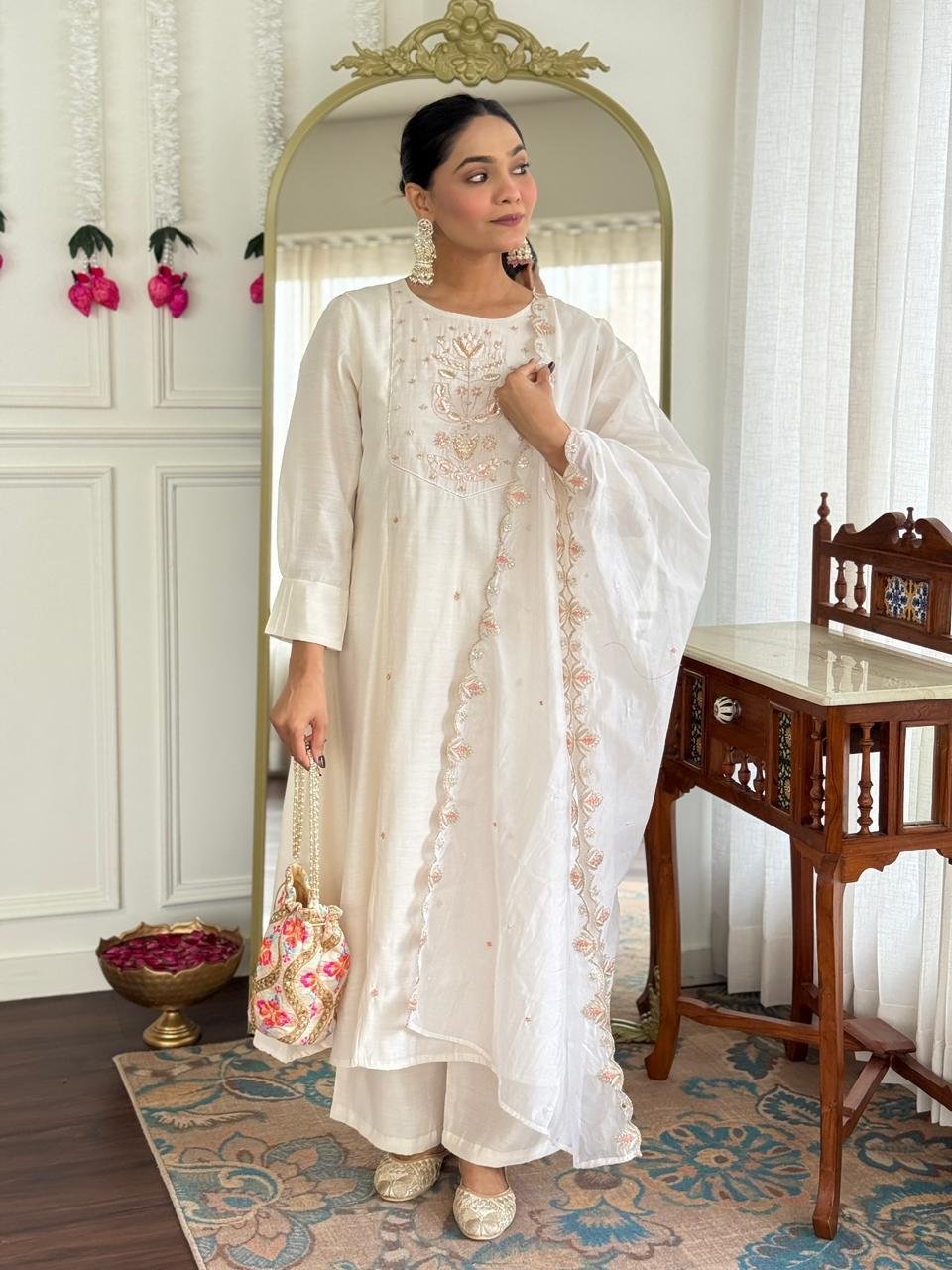 The DU-429 Stylish 3PC Suit Set is crafted from soft, breathable Roman fabric, offering a luxurious feel and comfortable fit. The princess kali style top features exquisite Khatt work, paired with Roman plazzo pants with cover stitching and an elegant organza dupatta with cut work for a complete, graceful ensemble.