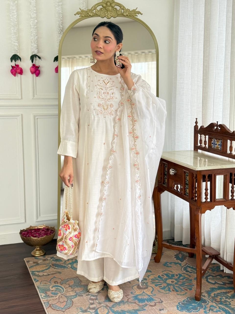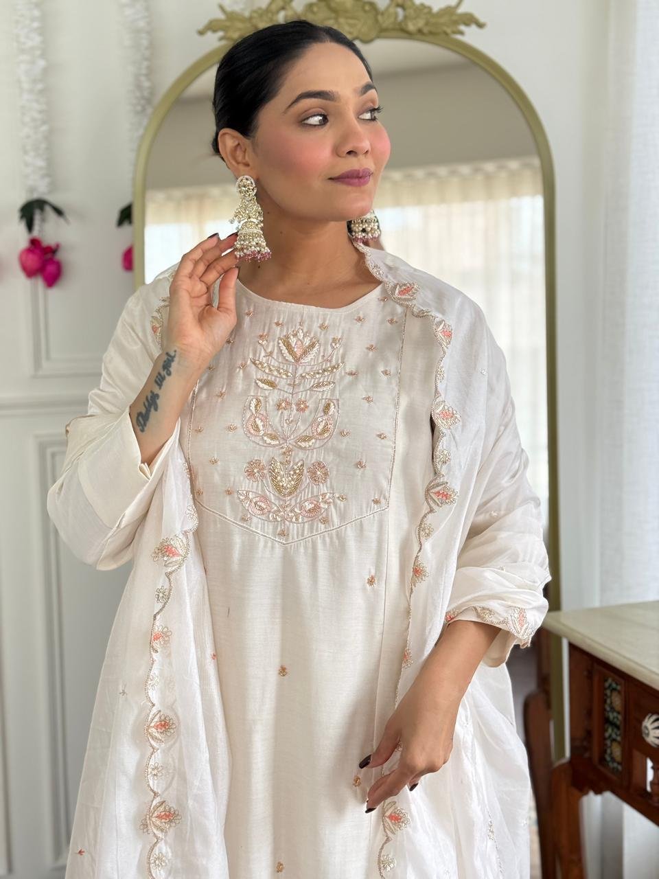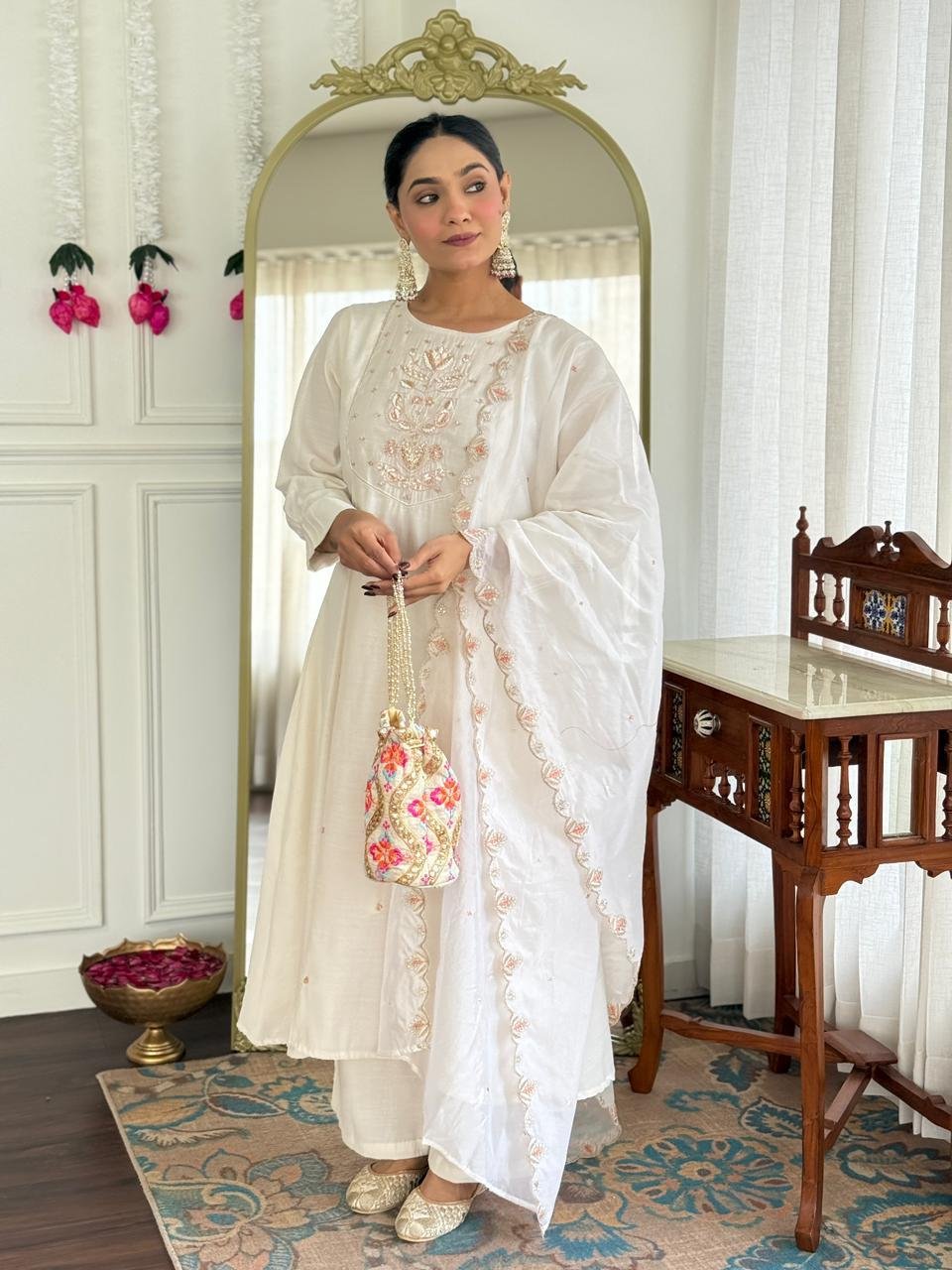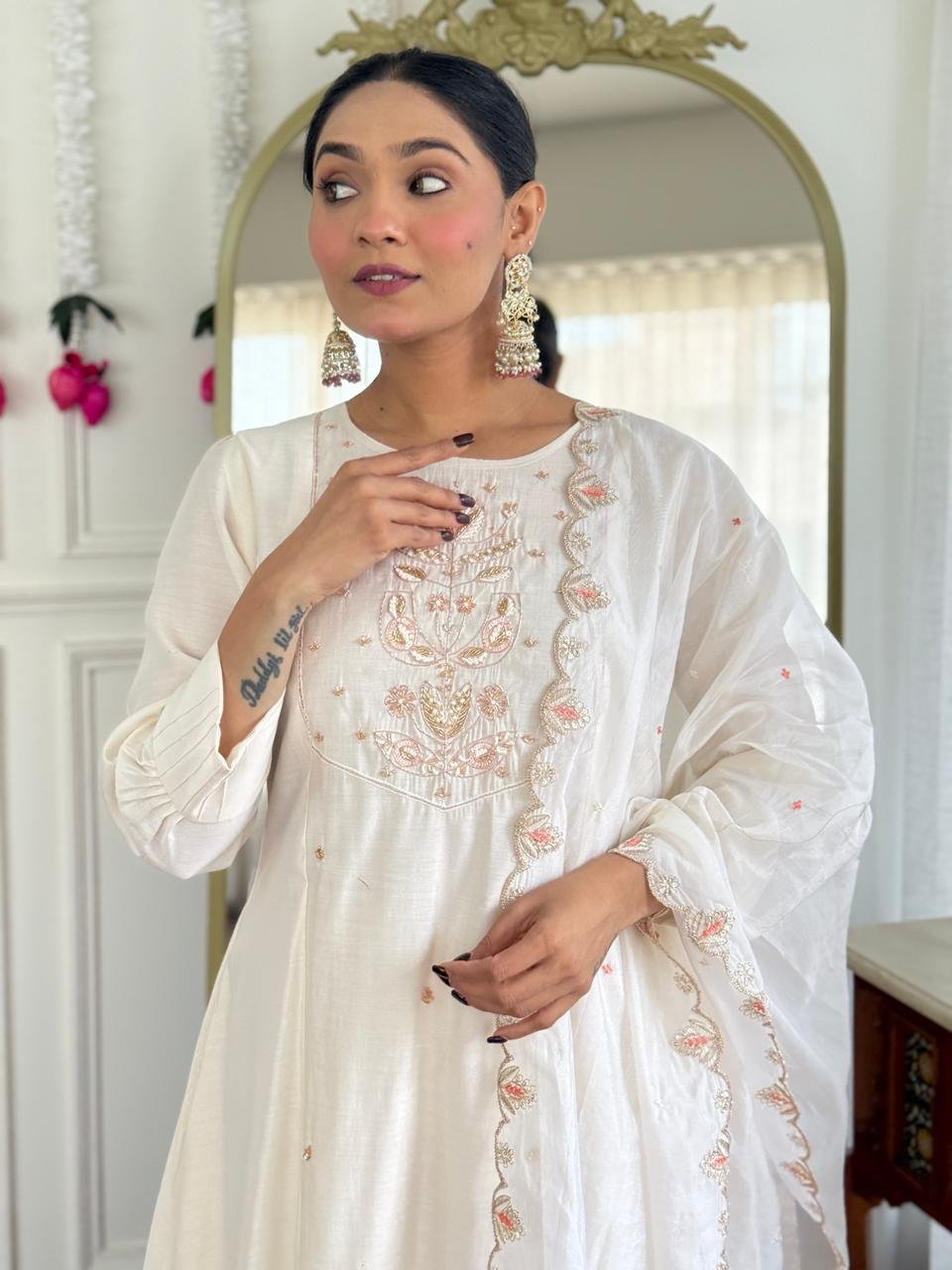 The DU-429 Stylish 3PC Suit Set is crafted from soft, breathable Roman fabric, offering a luxurious feel and comfortable fit. The princess kali style top features exquisite Khatt work, paired with Roman plazzo pants with cover stitching and an elegant organza dupatta with cut work for a complete, graceful ensemble.