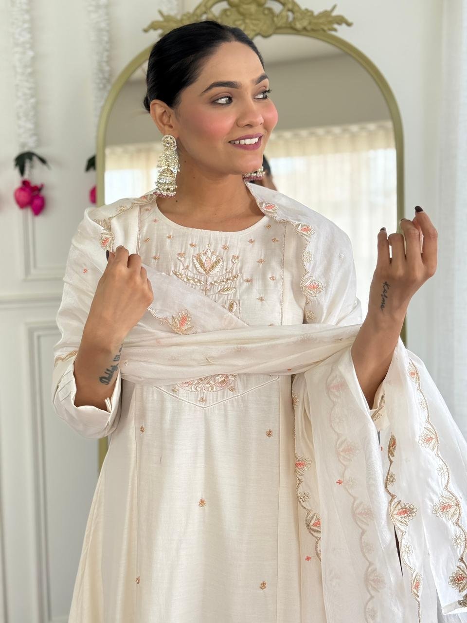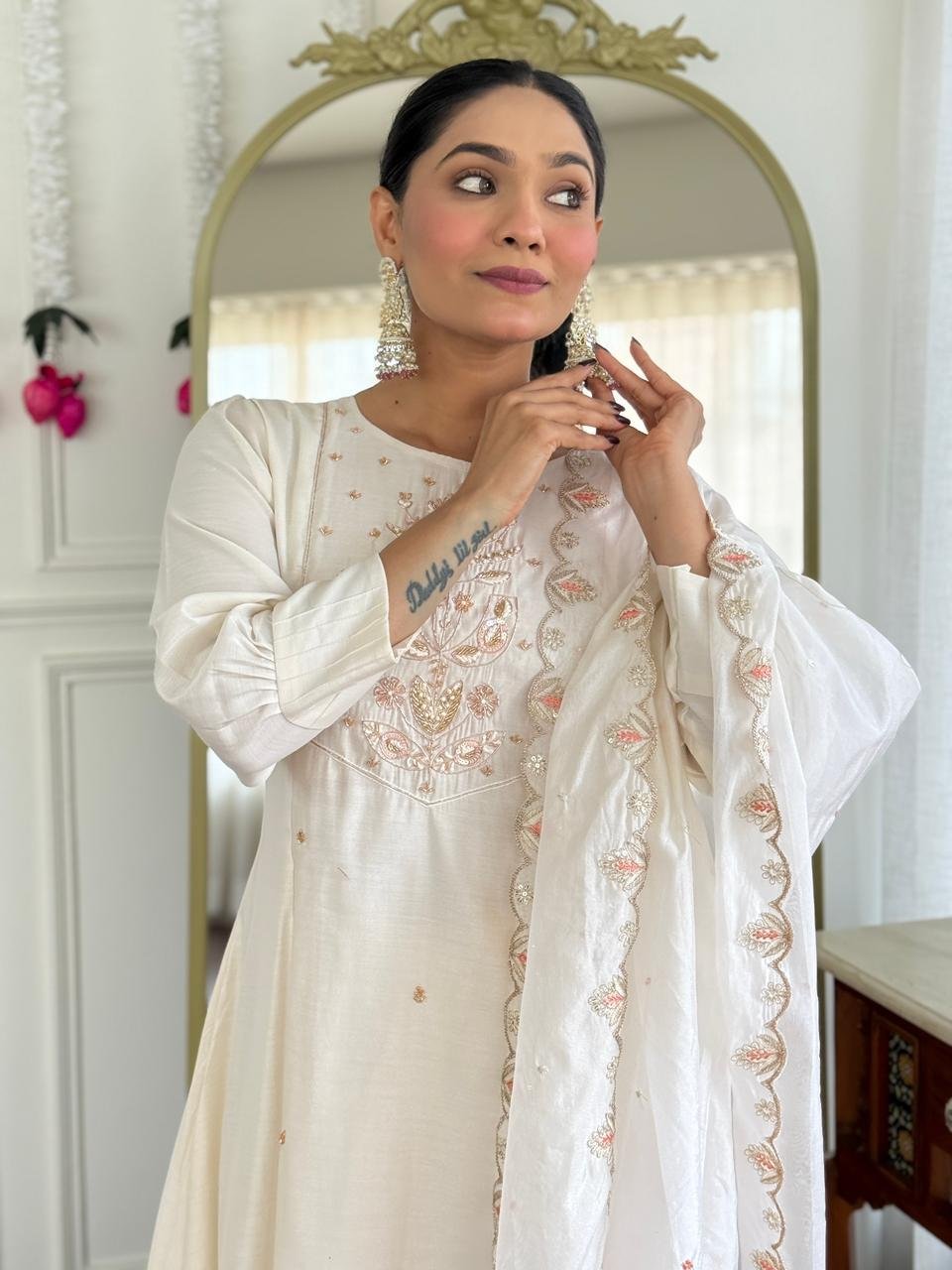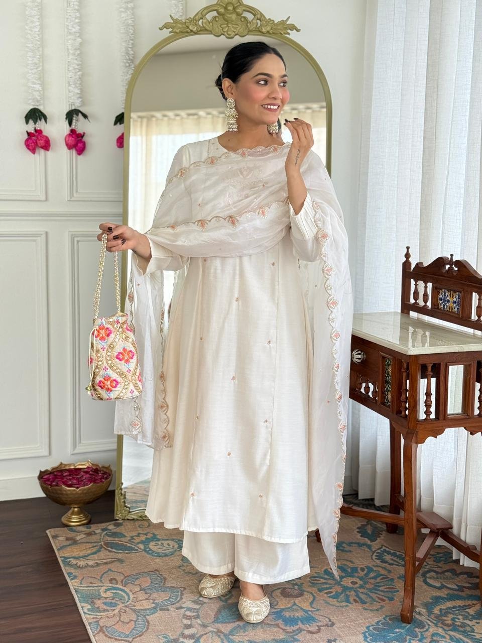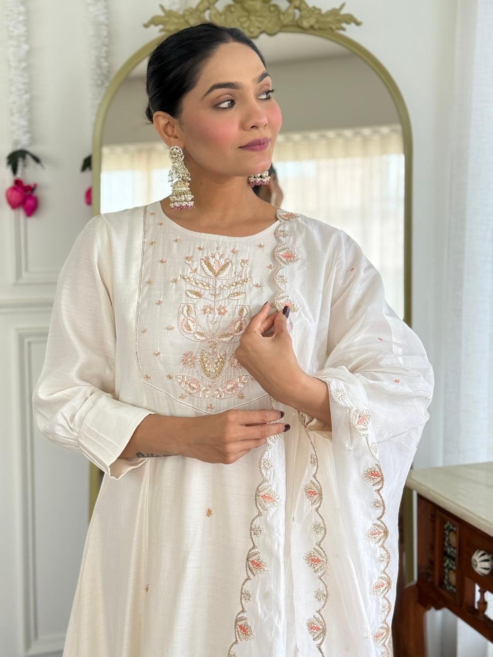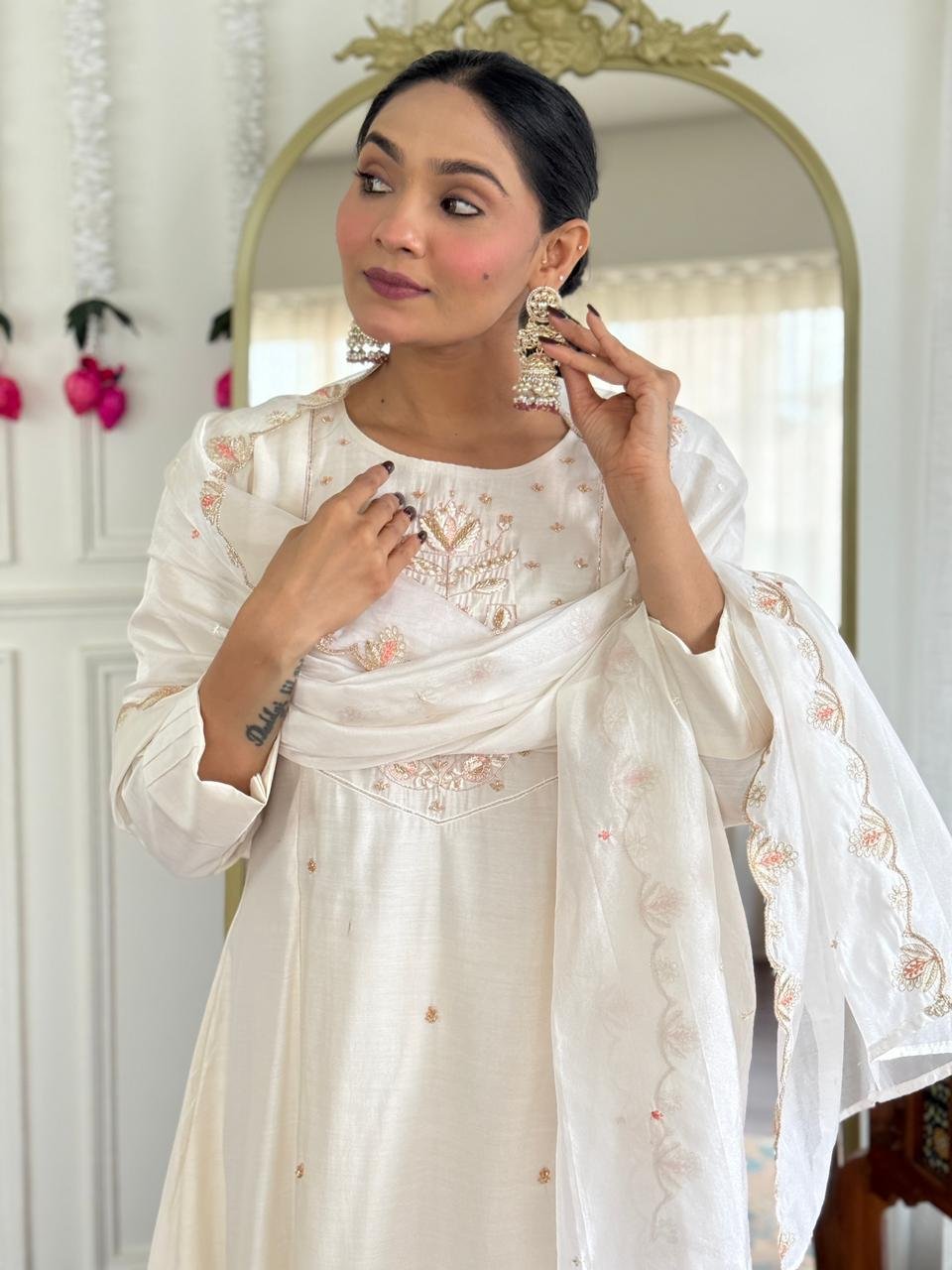 The DU-429 Stylish 3PC Suit Set is crafted from soft, breathable Roman fabric, offering a luxurious feel and comfortable fit. The princess kali style top features exquisite Khatt work, paired with Roman plazzo pants with cover stitching and an elegant organza dupatta with cut work for a complete, graceful ensemble.