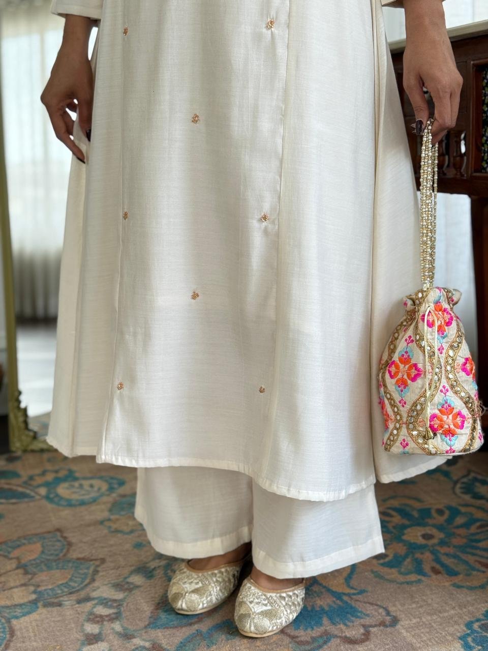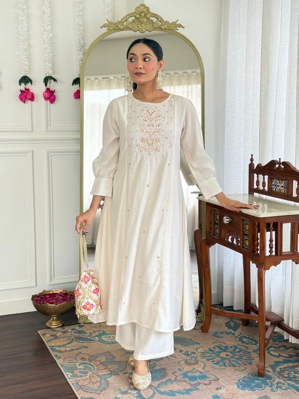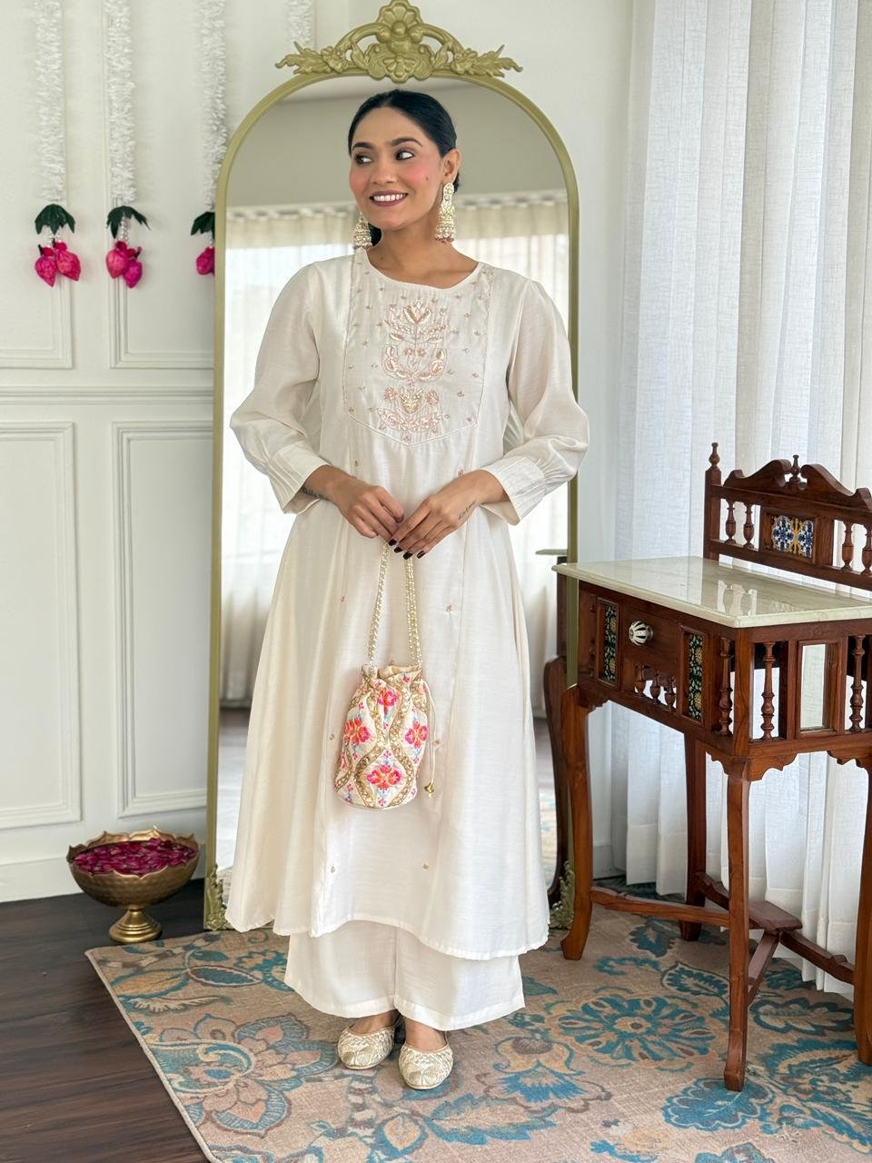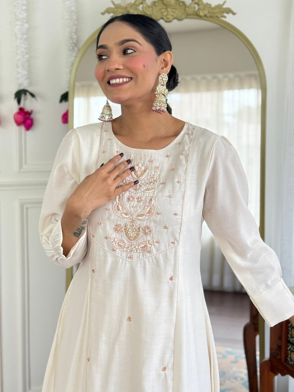 The DU-429 Stylish 3PC Suit Set is crafted from soft, breathable Roman fabric, offering a luxurious feel and comfortable fit. The princess kali style top features exquisite Khatt work, paired with Roman plazzo pants with cover stitching and an elegant organza dupatta with cut work for a complete, graceful ensemble.