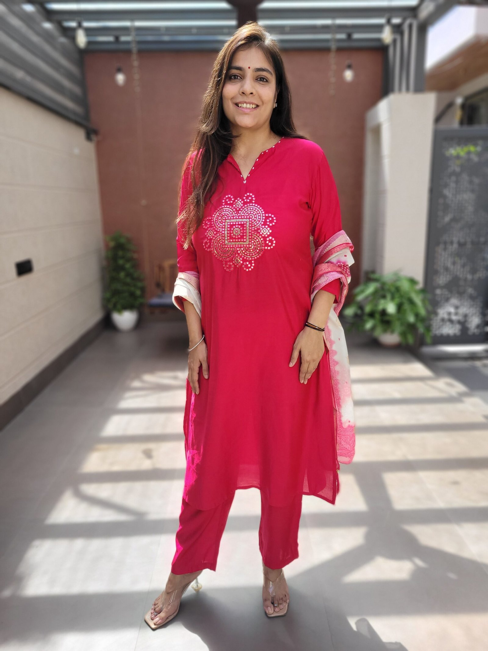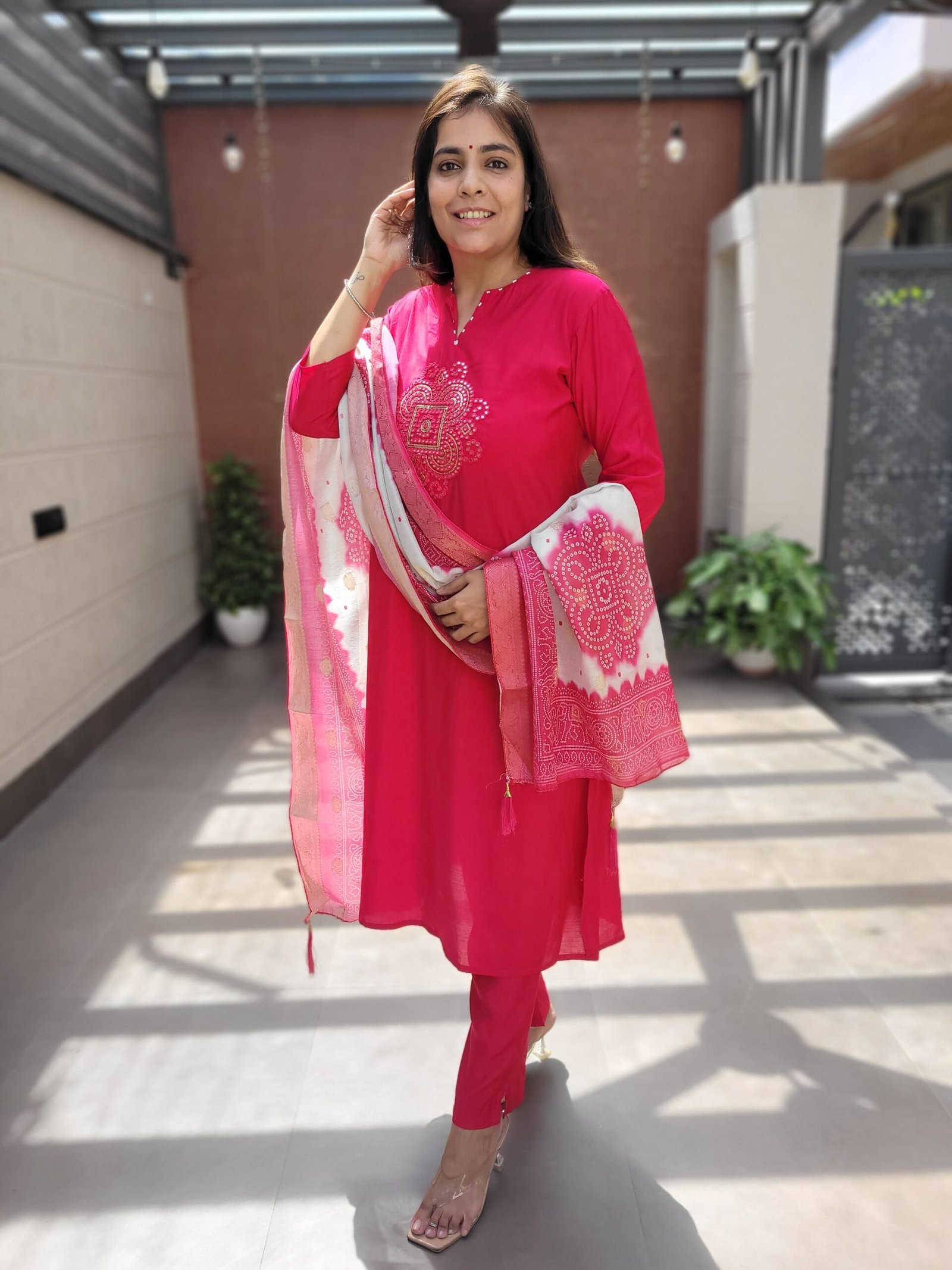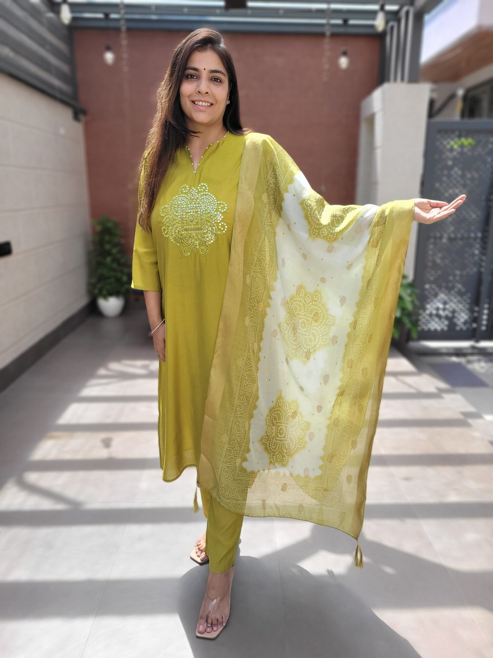 The DU-066 Stylish 3PC Suit Set is crafted from luxurious Roman silk, offering a soft, comfortable feel with a graceful drape. The kurta features intricate mirror and embroidery work, enhanced by delicate bead detailing on the neckline. The ensemble is completed with a beautiful Bandhej print jacquard dupatta, adding a touch of traditional elegance.