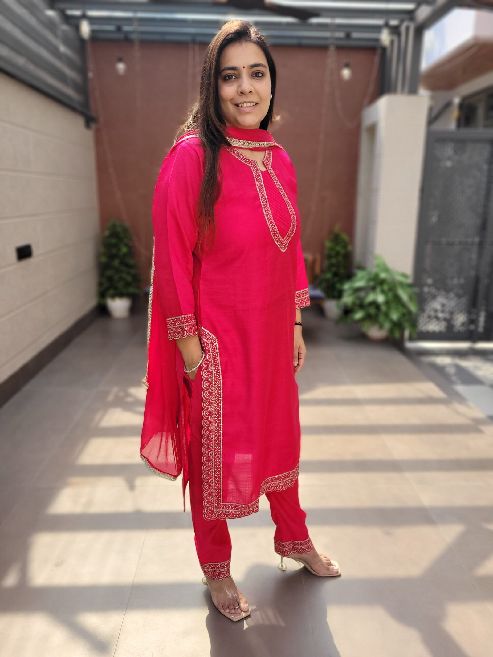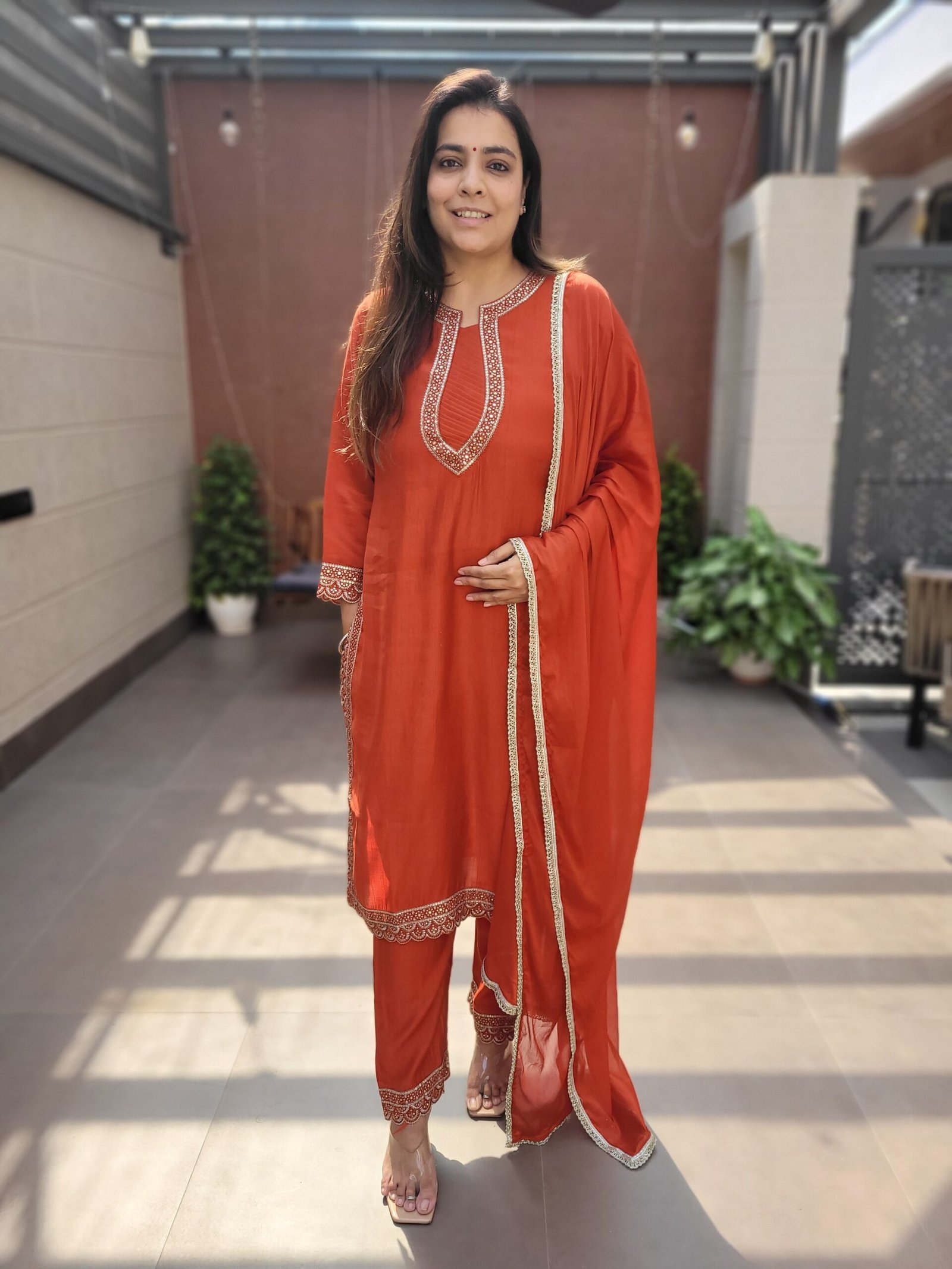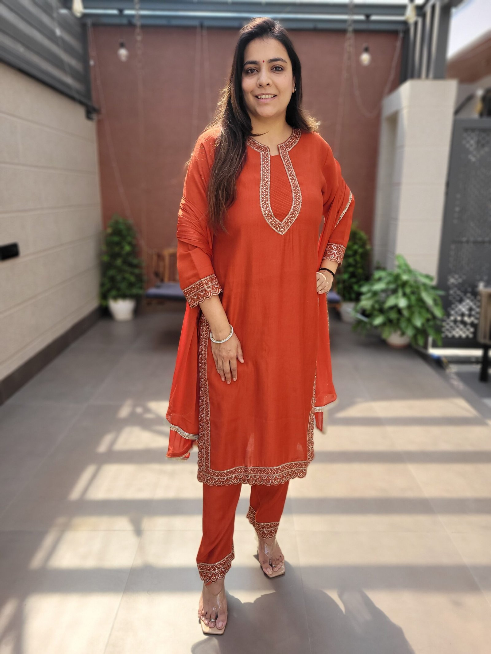 The DU-616 Stylish 3PC Suit Set is crafted from soft, breathable viscose silk slub, offering a luxurious feel and comfortable fit. The kurta features intricate zari and sequins embellishments, paired with a coordinated chinon dupatta adorned with delicate lace work and a matching bottom for a complete, graceful ensemble. Ideal for weddings, festive gatherings, and semi-formal occasions, this 3-piece set combines traditional craftsmanship with modern elegance, making it a perfect choice for stylish celebrations.