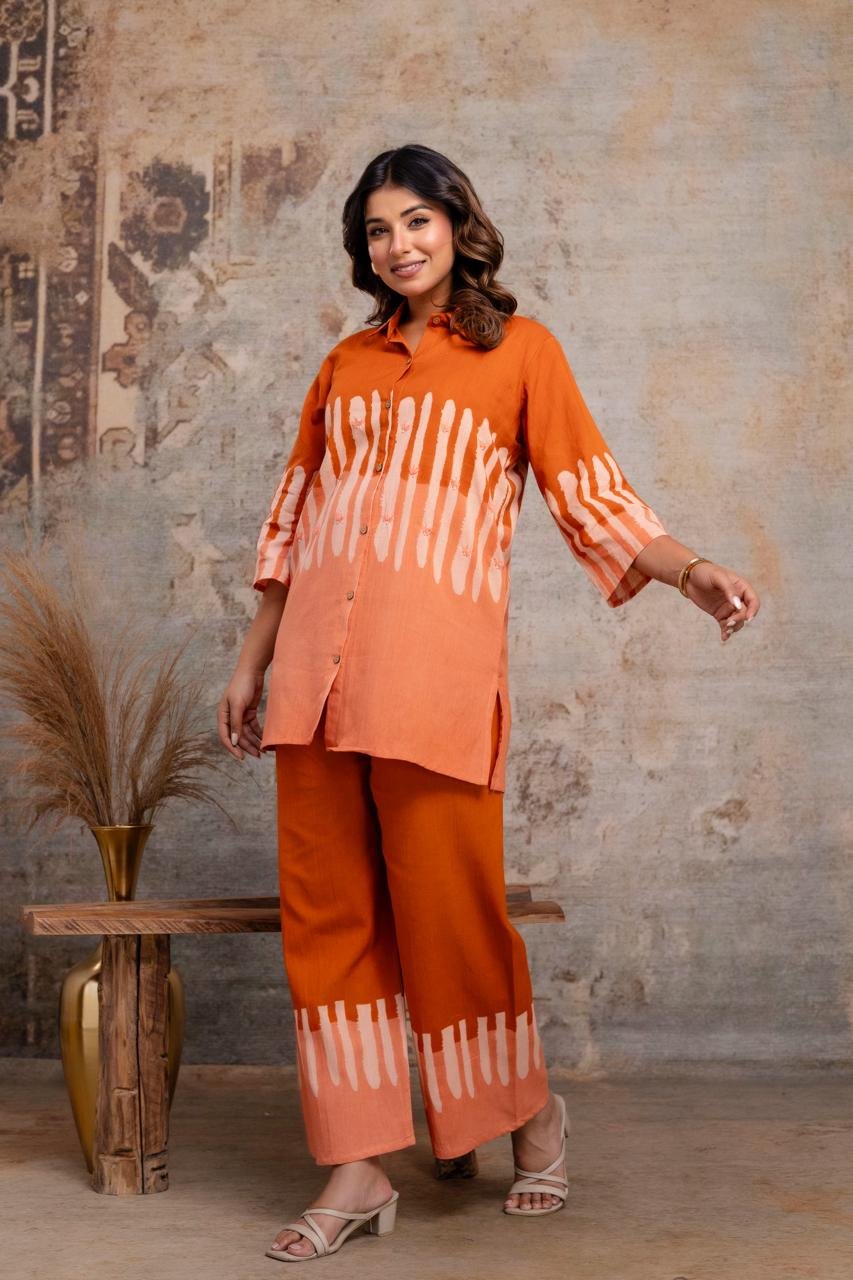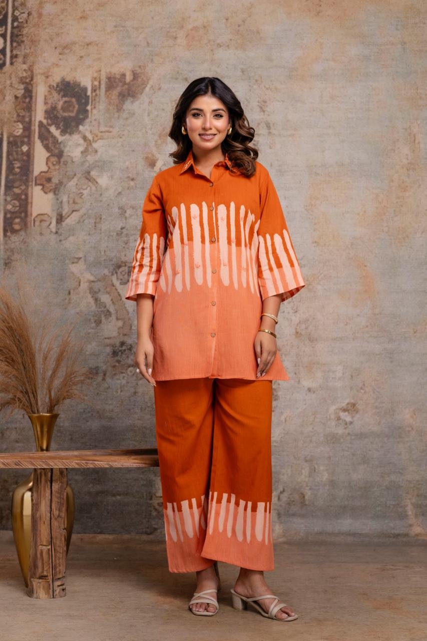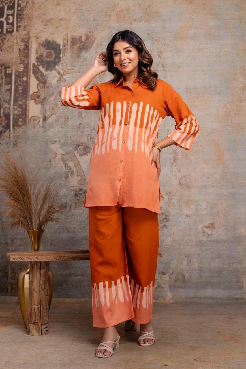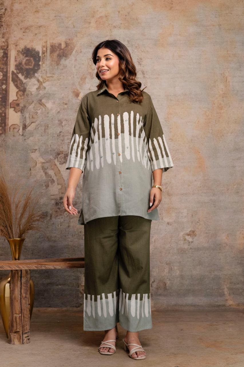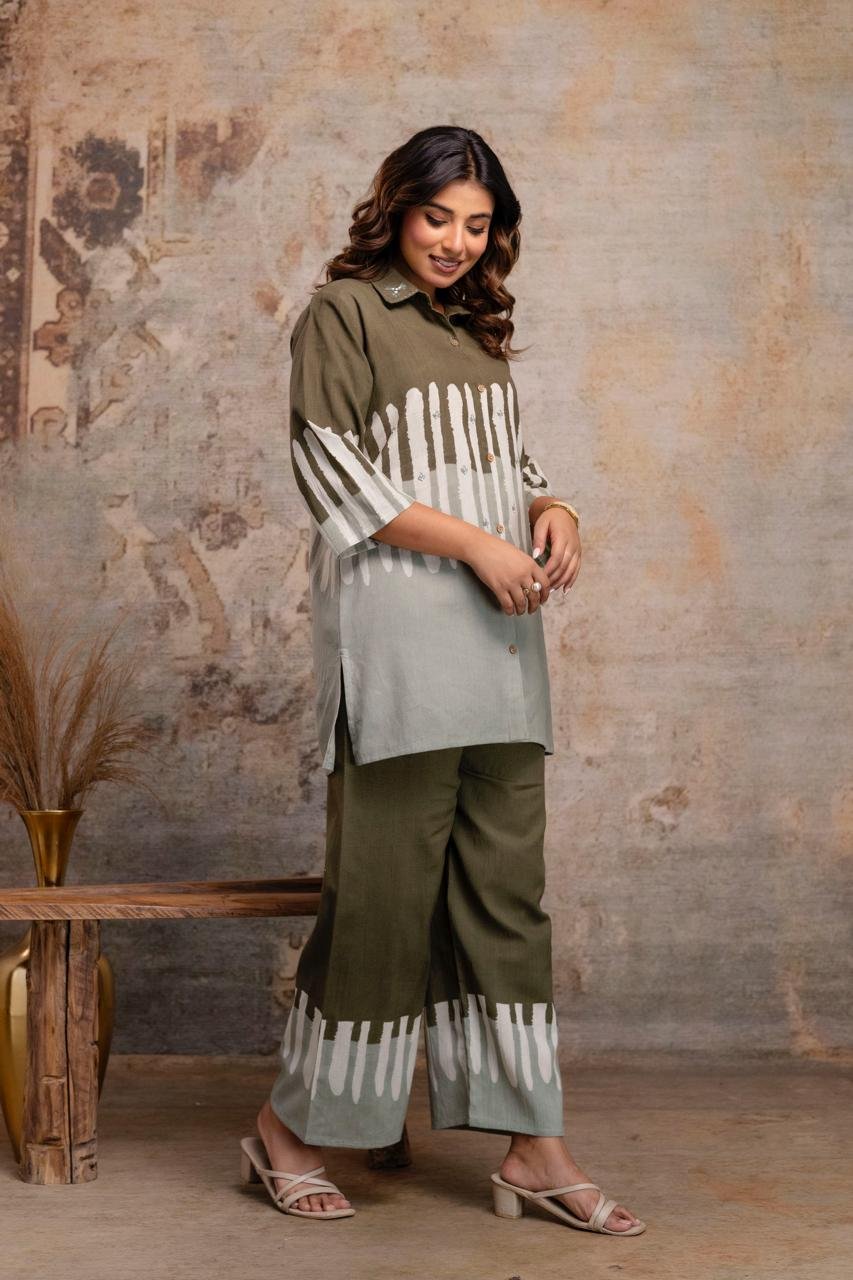 The top features a beautiful ombre print combined with delicate handwork, adding a stylish and unique touch to the design. The coordinated set creates a modern silhouette that is ideal for casual outings, day events, and fashionable everyday wear.