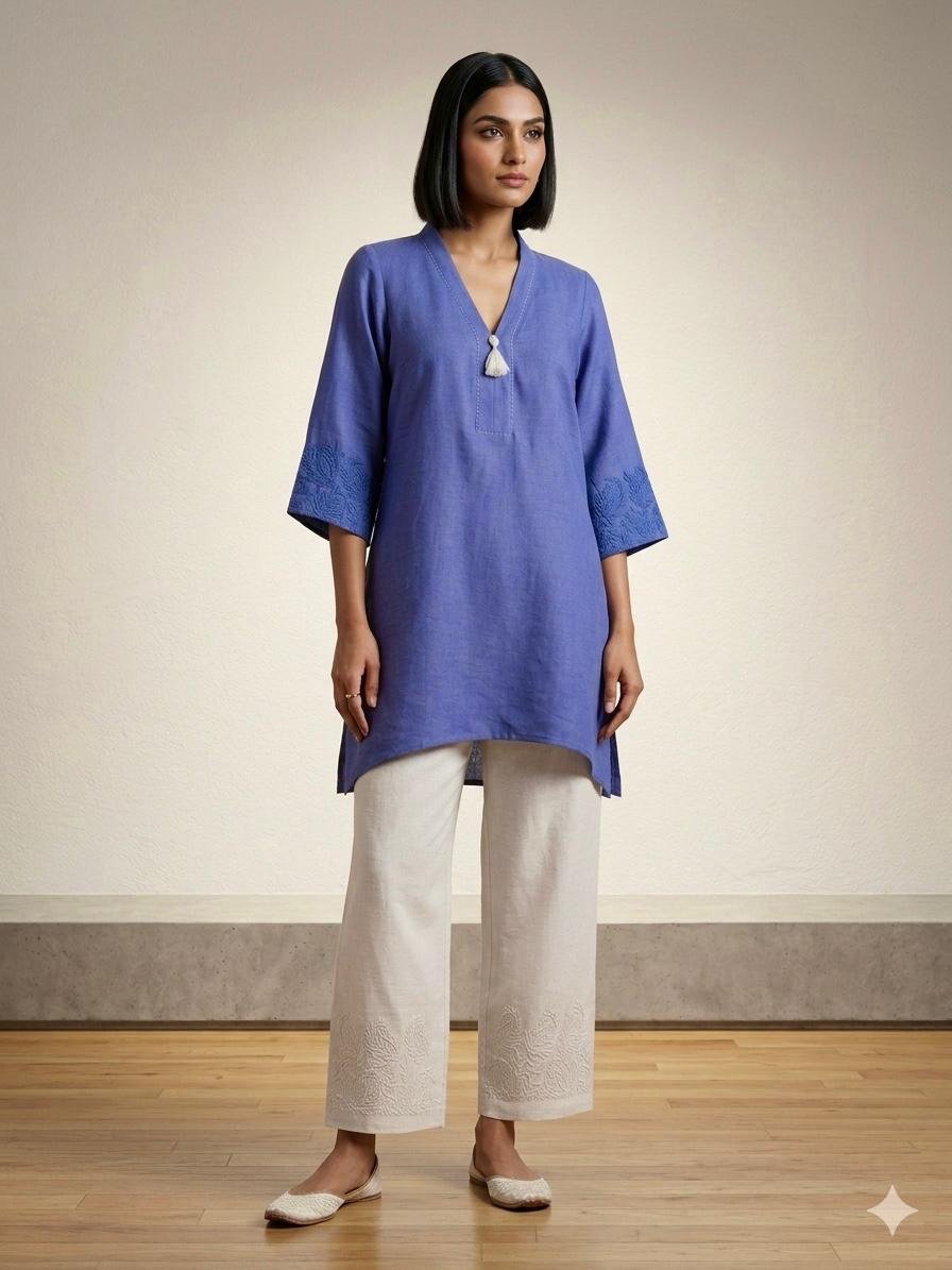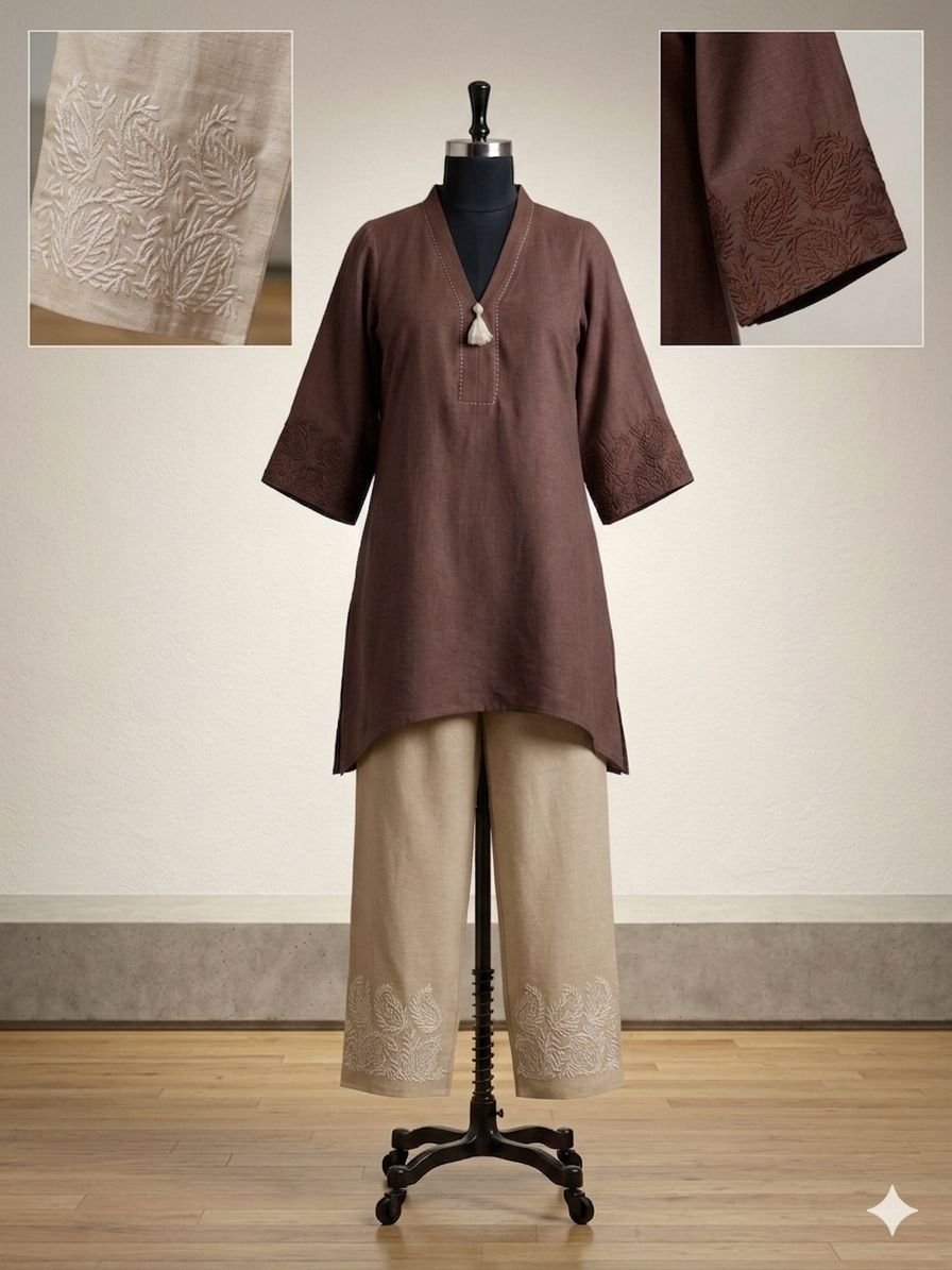 Featuring a C-cut pattern, embroidered sleeves, embroidered bottom, and Kantha work on the yoke line, this set is ideal for office wear, outings, and statement casual looks.