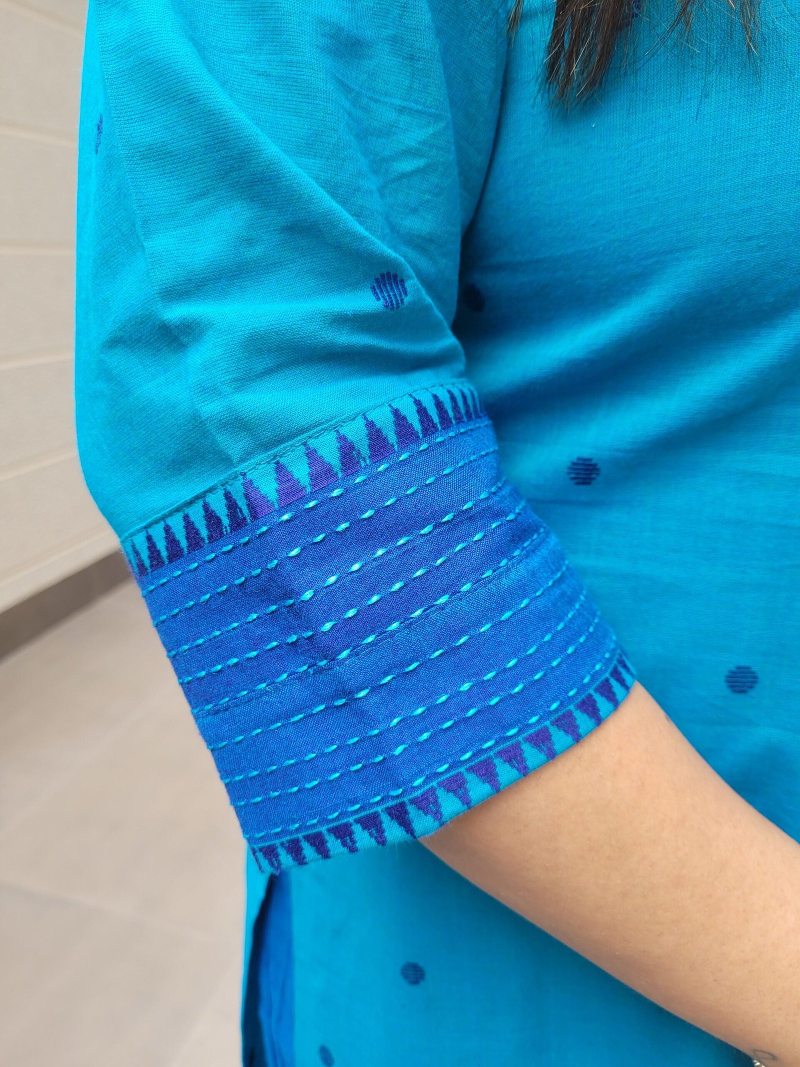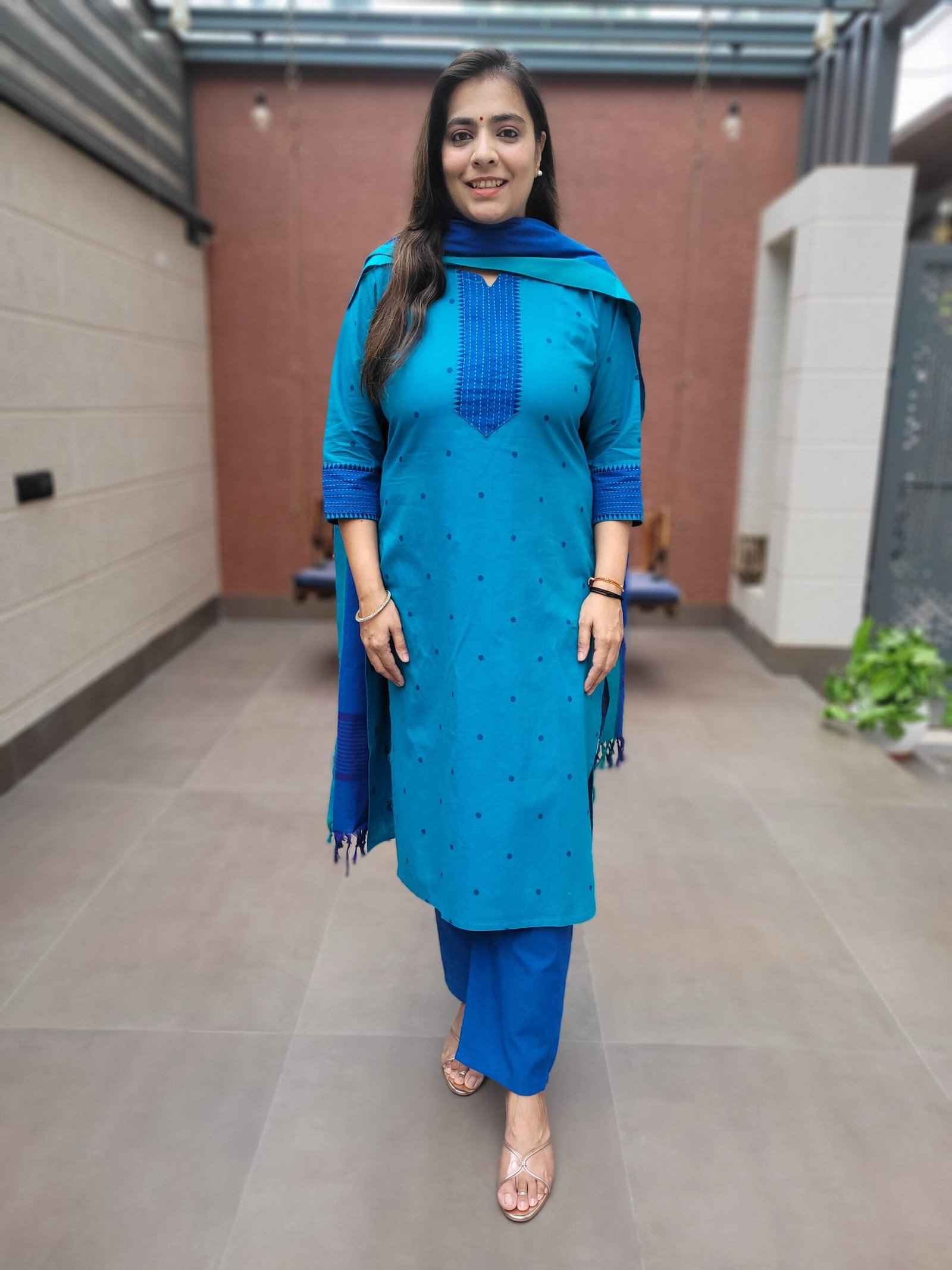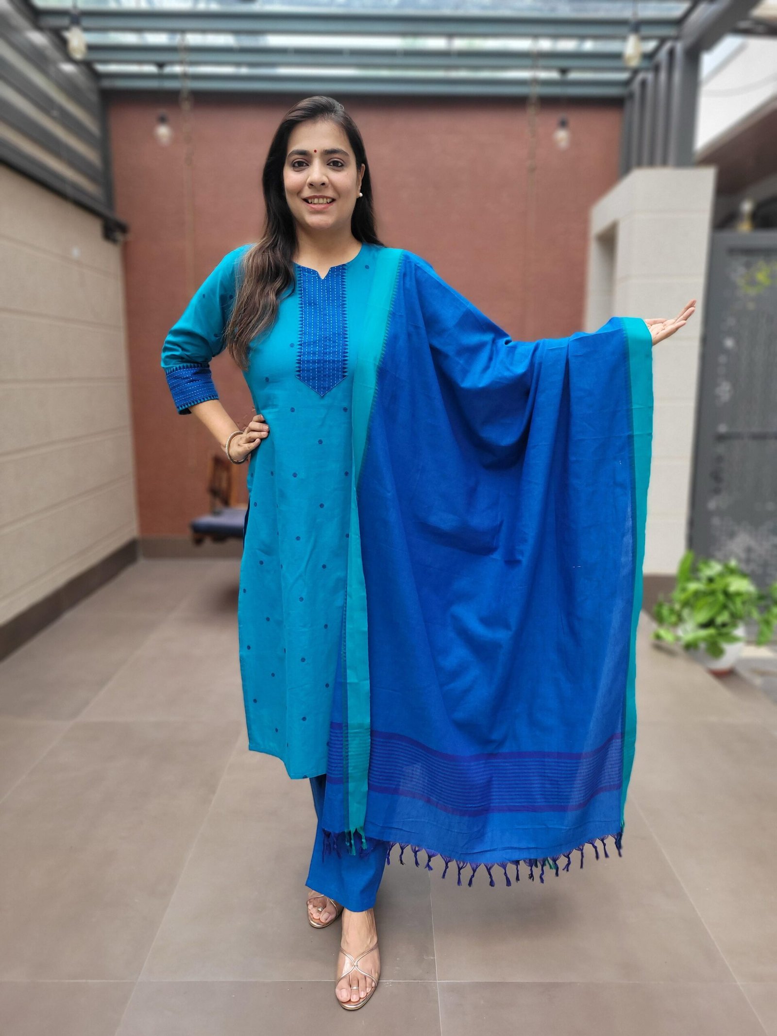 The DU-537 Stylish 3PC Suit Set is crafted from pure handloom cotton, offering breathability, comfort, and a natural feel. The set features intricate Kantha stitch work, adding a touch of artisanal charm that reflects timeless Indian craftsmanship.