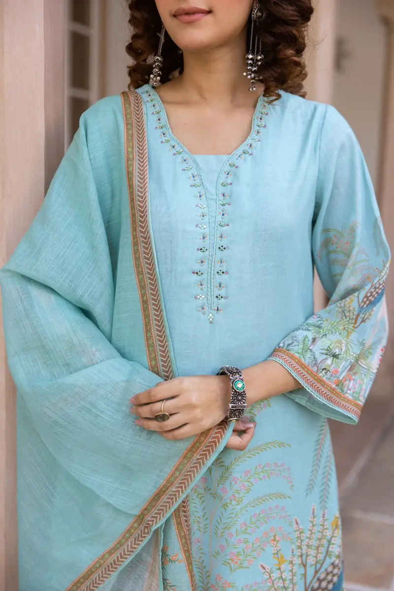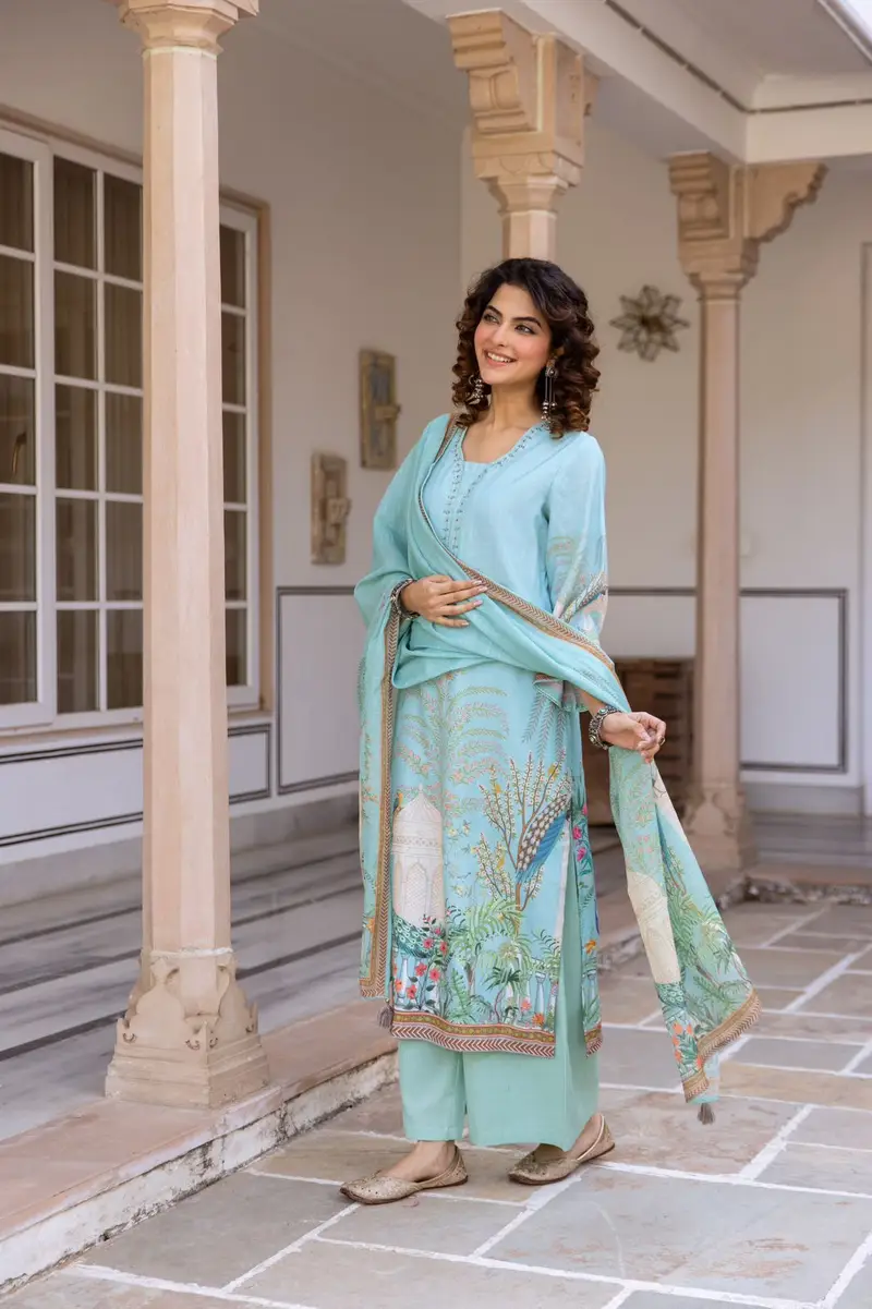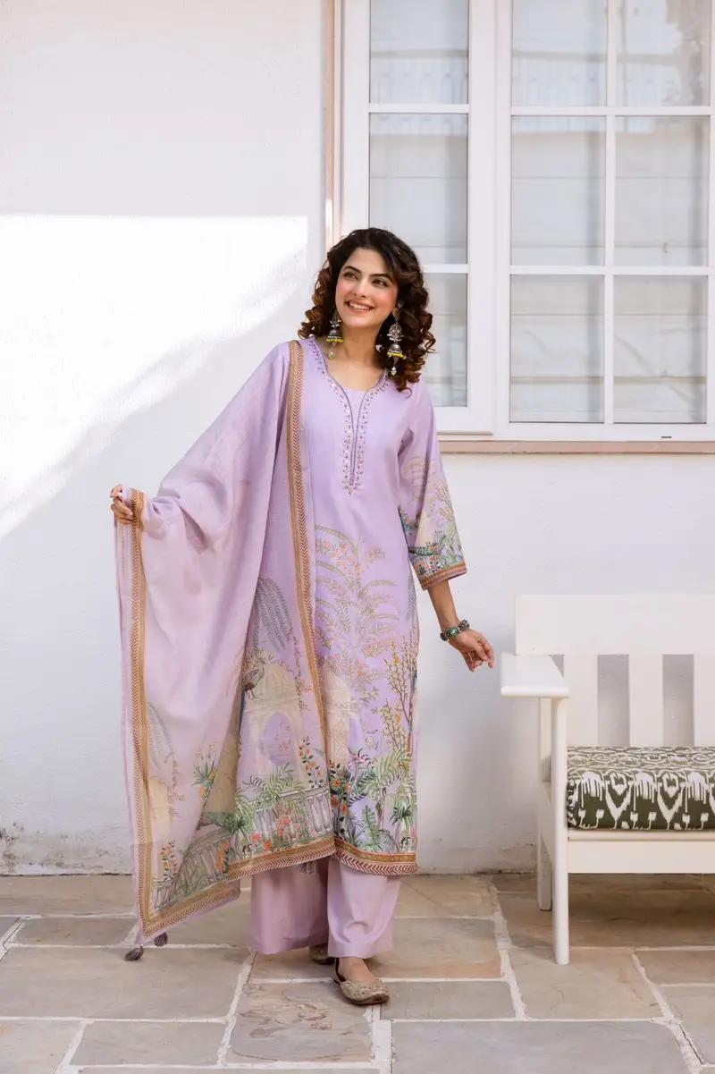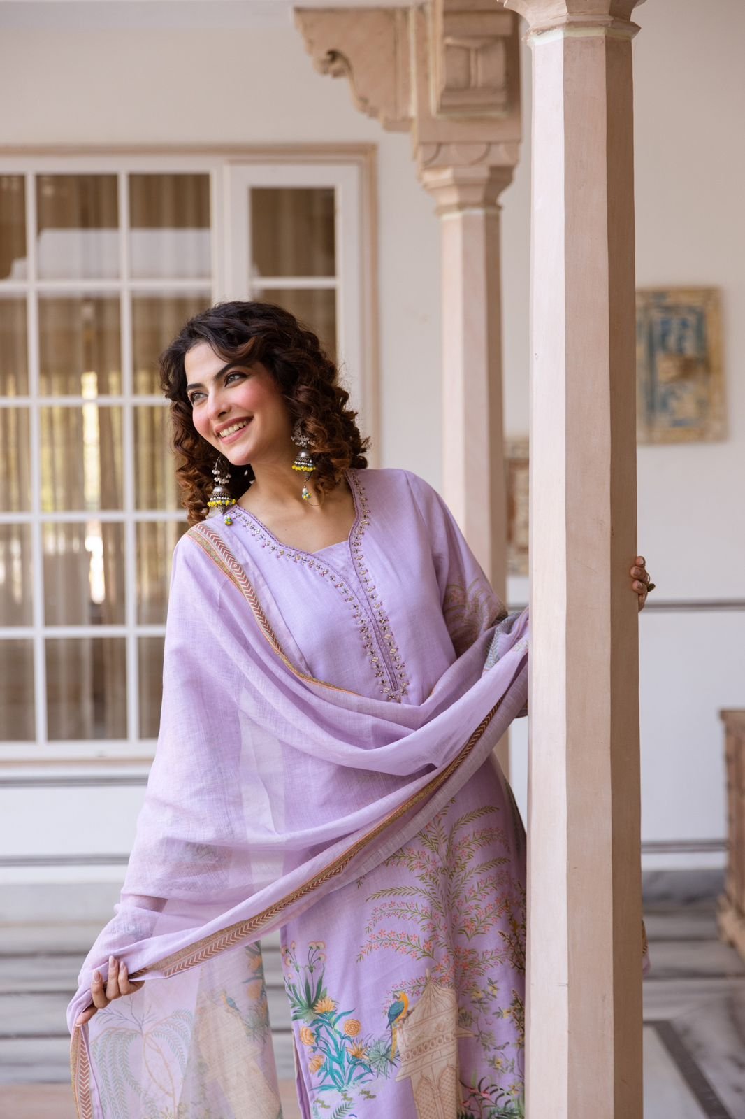 The kurta features delicate handwork on the yoke, adding a subtle handcrafted charm, while the cotton lining ensures ease and comfort during extended wear. Available in refreshing Lavender and Mint shades, this suit set is perfect for office wear, daytime events, and graceful everyday styling.