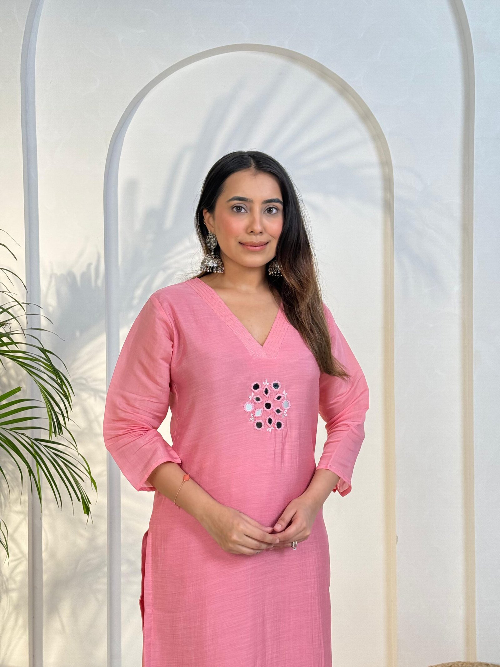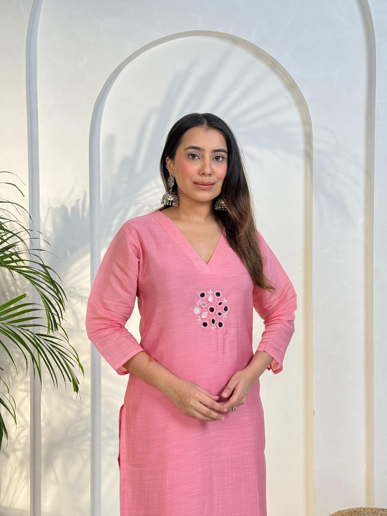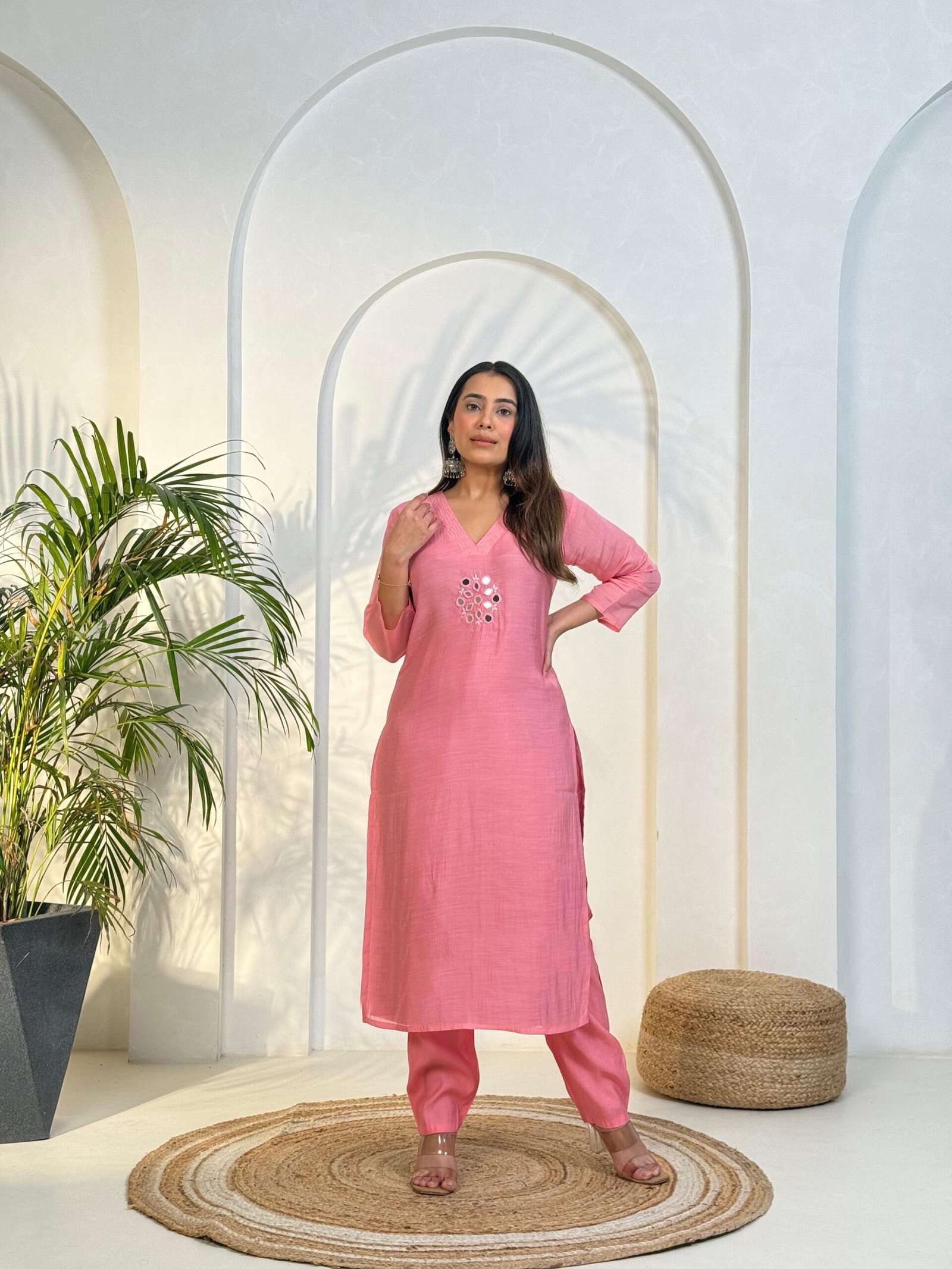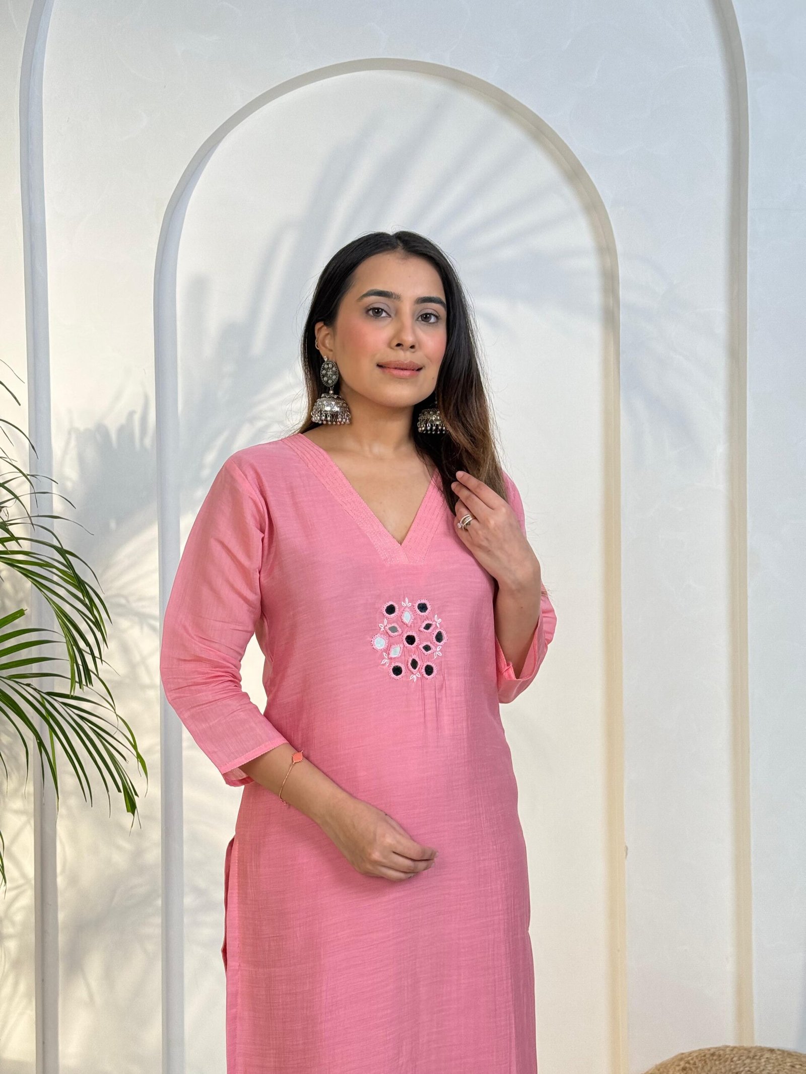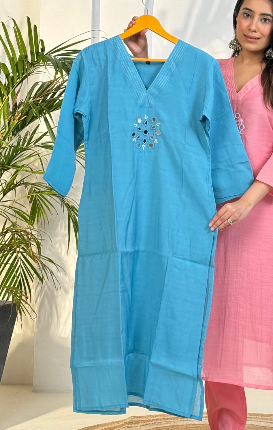 The focal point of the design is its mirror work detailing, adding a delicate sparkle and artisanal touch without being overly ornate. The soft cotton lining ensures breathable comfort throughout the day, making it ideal for both celebratory occasions and semi-formal gatherings.