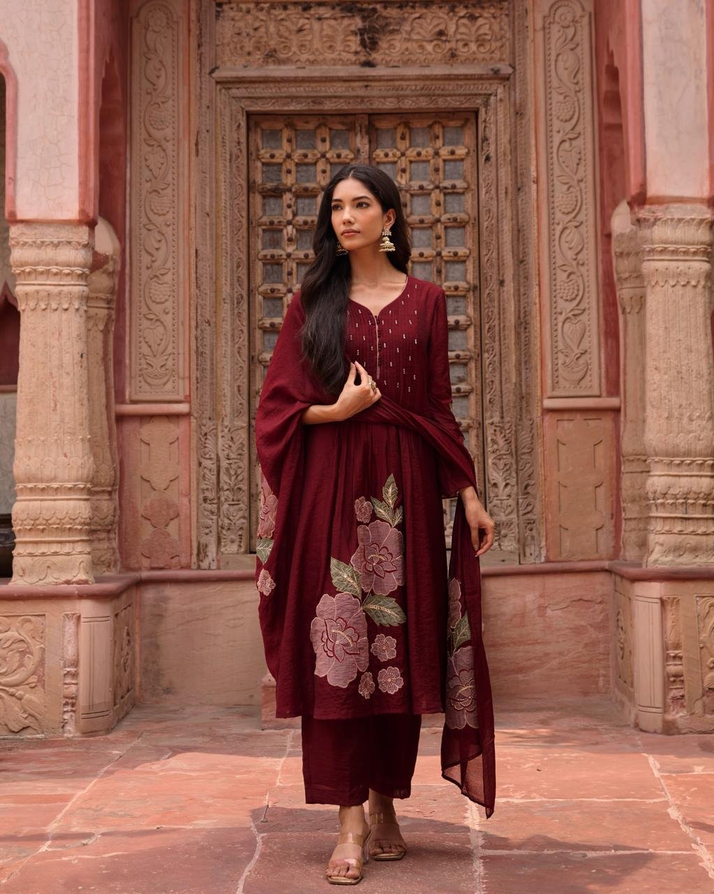 Available in a rich rust shade and sizes 40 to 46, this suit set is a graceful choice for weddings, parties, and festive gatherings.