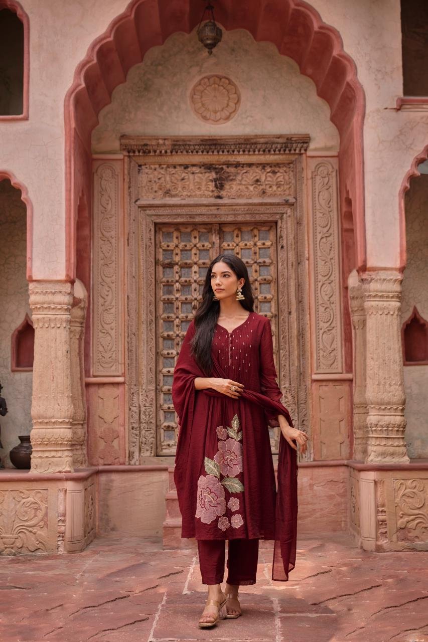 Adorned with appliqué detailing, intricate zari, and sequins work, this suit set radiates charm and festive sparkle. The look is completed with a designer Mal Chanderi dupatta, while the cotton lining ensures comfort for long wear.