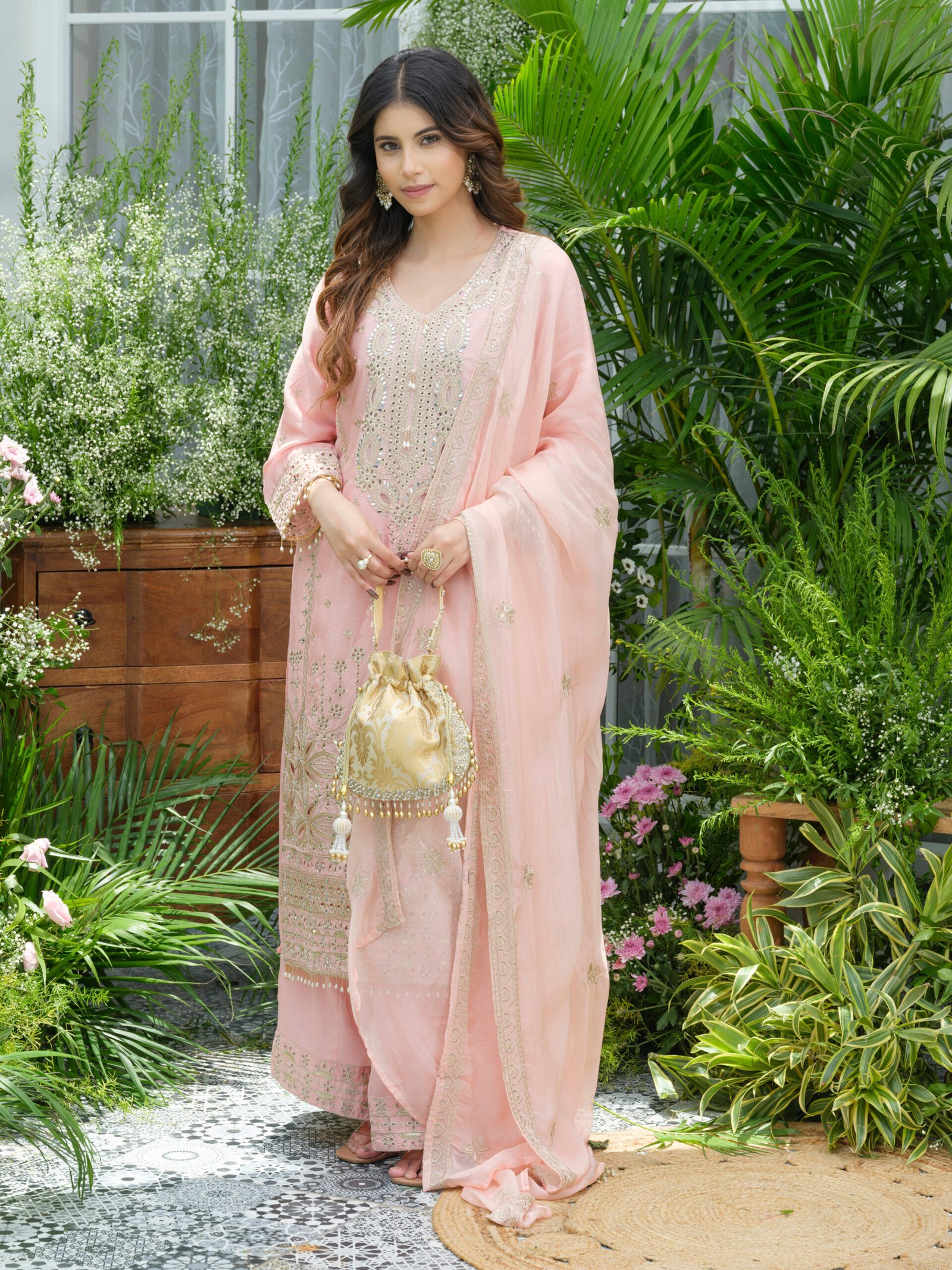 Available in two stunning shades – pista green for a refreshing, subtle vibe, and pink for a soft, feminine elegance – this set offers versatile styling options. Accessorize with statement earrings, a clutch, and heels for a complete festive-ready look.