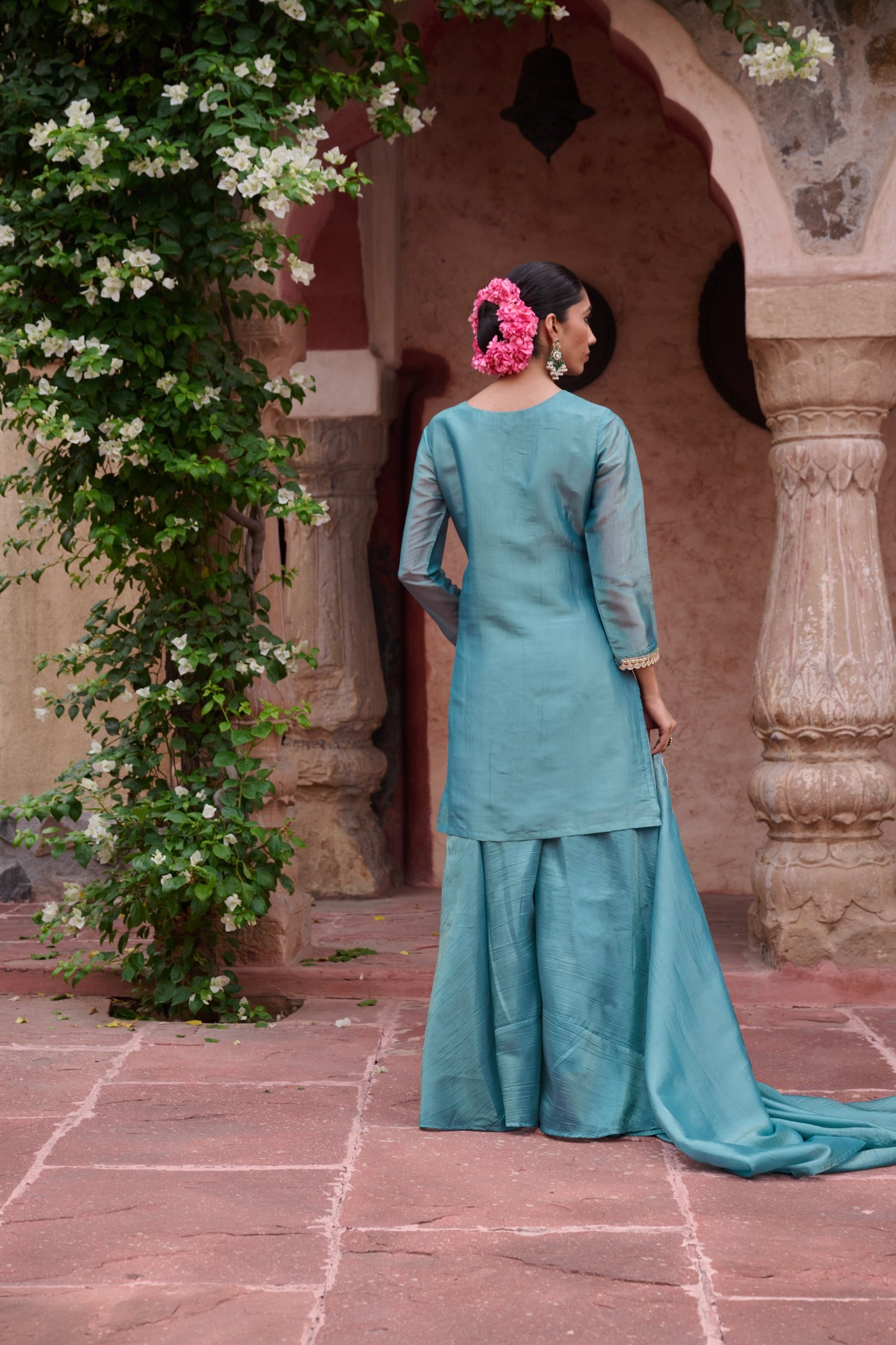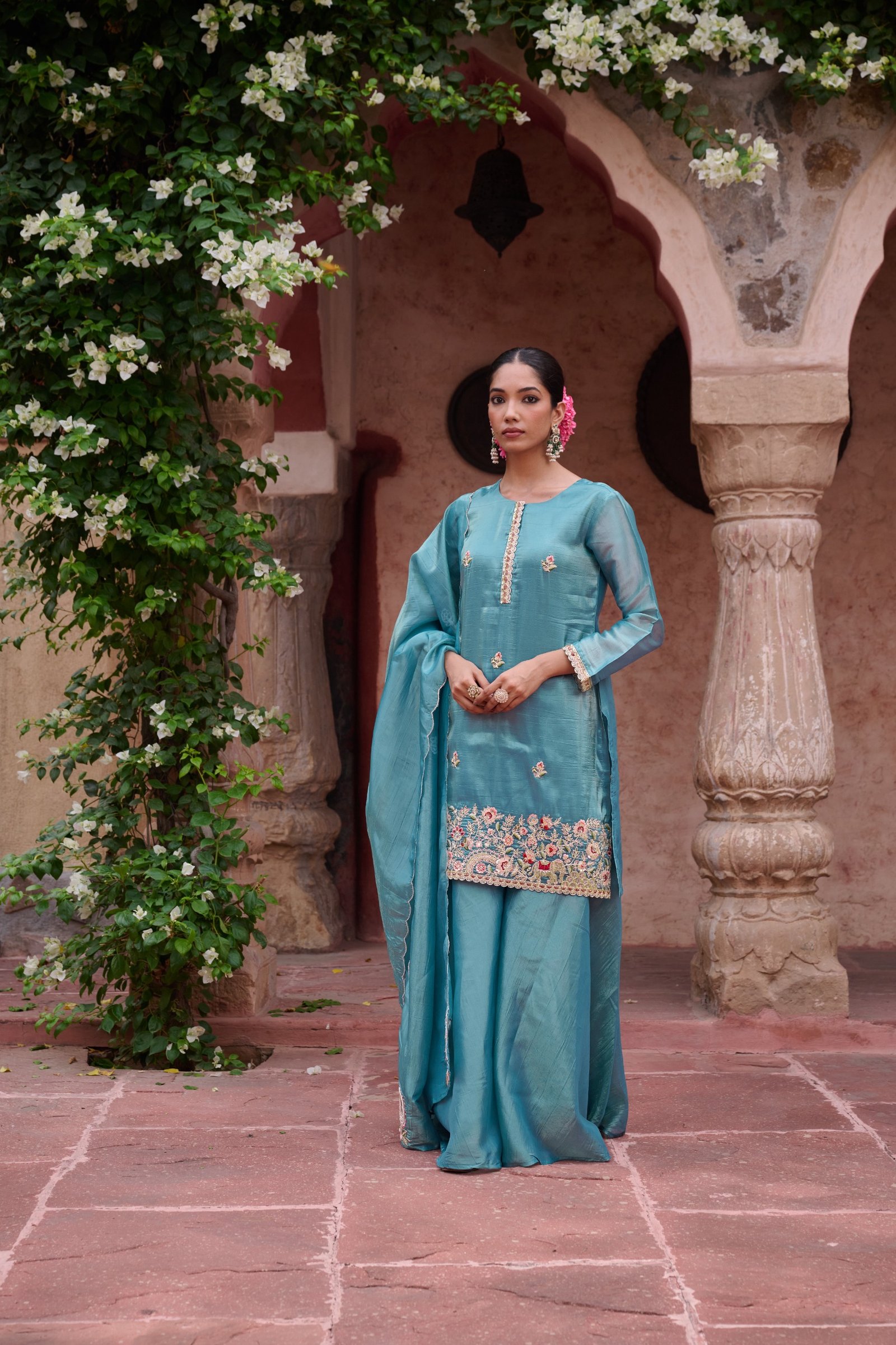 The short kurta design adds a contemporary edge, beautifully complemented by intricate zari and handwork detailing that elevates the outfit’s charm. The divider-style bottom ensures both comfort and flair, making it a standout piece in your wardrobe.