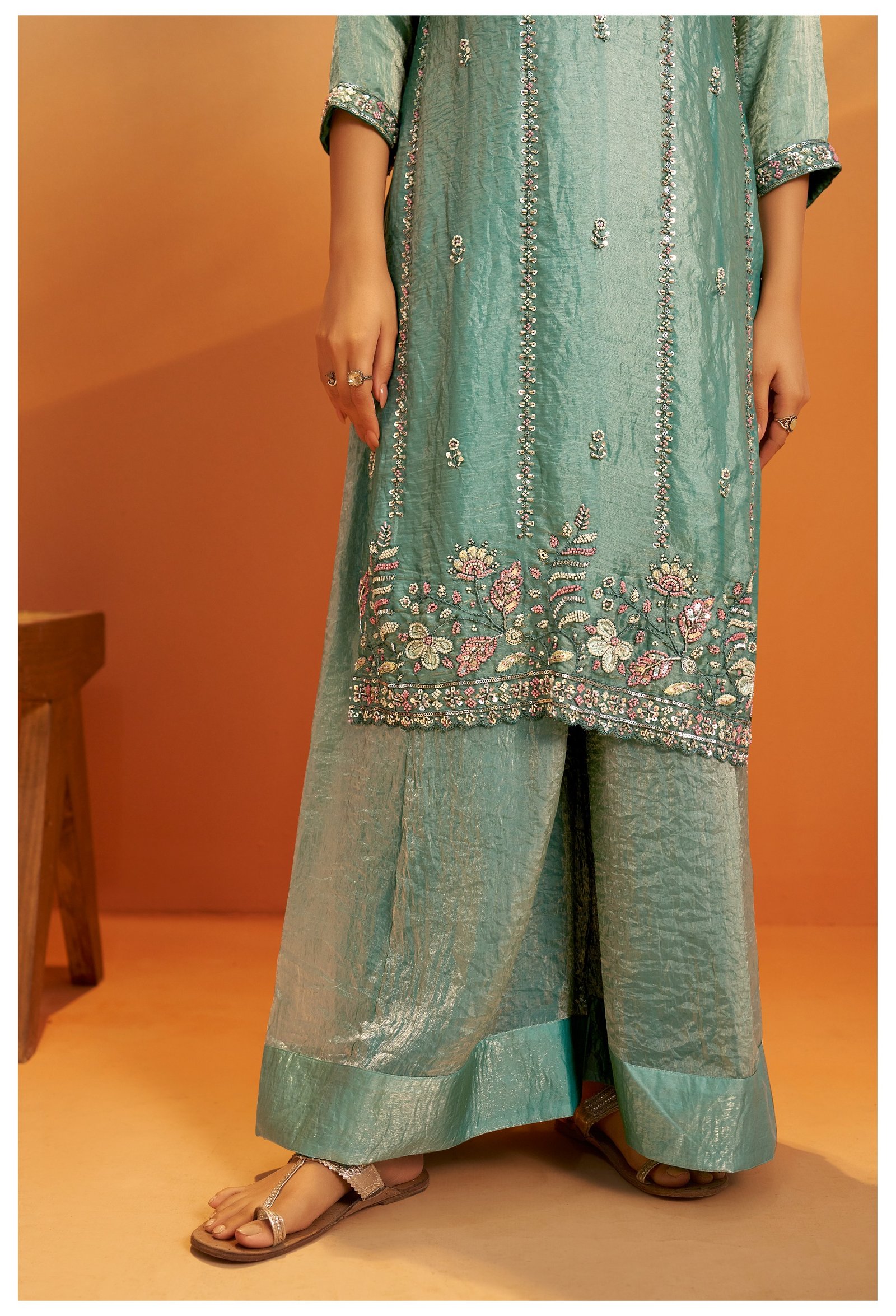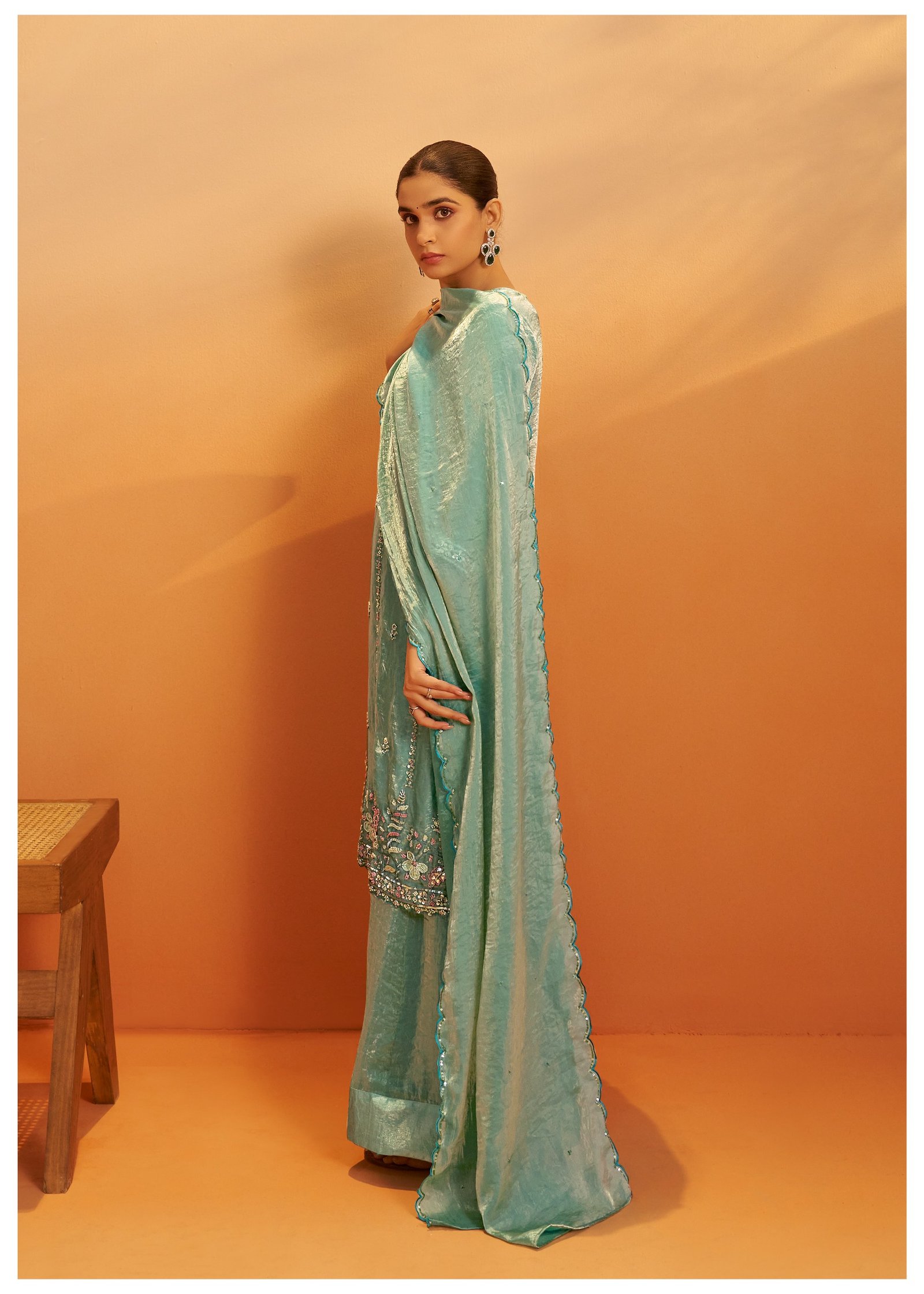 The PW-175 Divider Suit Set is a bold festive statement crafted from crush tissue fabric. Featuring heavy beadwork, this short kurta divider suit delivers modern elegance with traditional charm.
