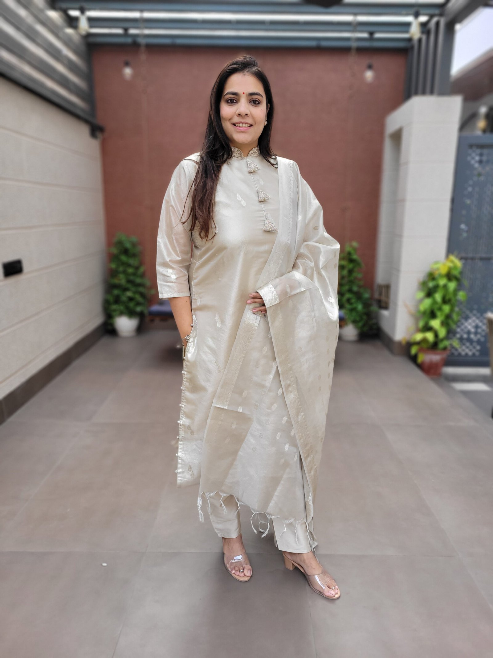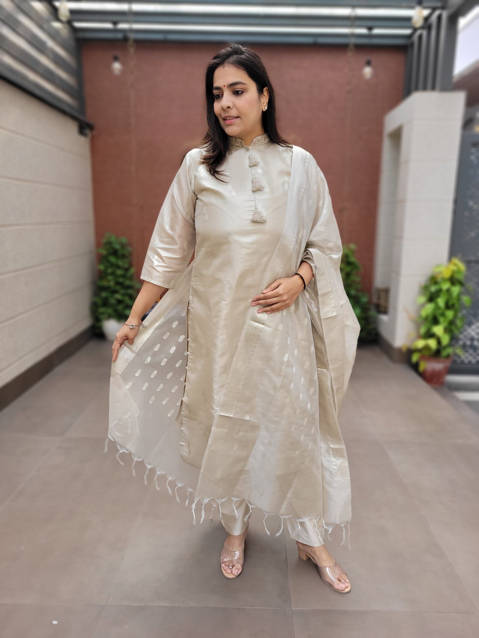 Delicate handwork on the tassels adds a handcrafted touch, elevating the overall look while keeping the design tasteful and balanced. The lightweight nature of the tissue jacquard fabric ensures comfort along with an effortlessly elegant fall.