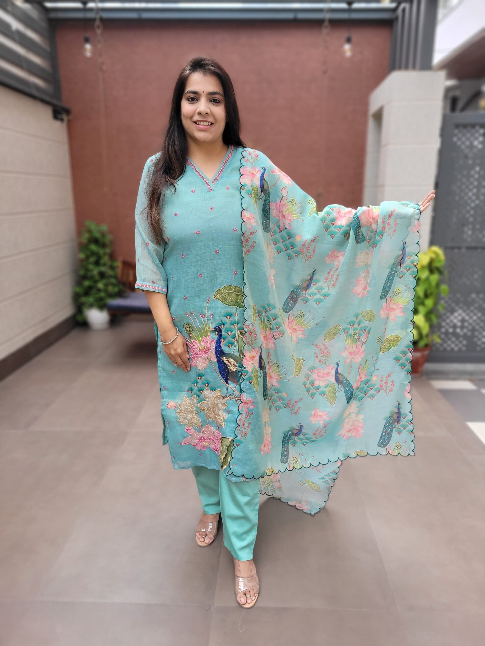 The DU-362 Designer Wear 3PC Set blends refined elegance with traditional craftsmanship. Crafted from premium tissue linen fabric, this ensemble offers a graceful texture with a subtle sheen, enhanced by intricate heavy Kantha work that adds artisanal charm.