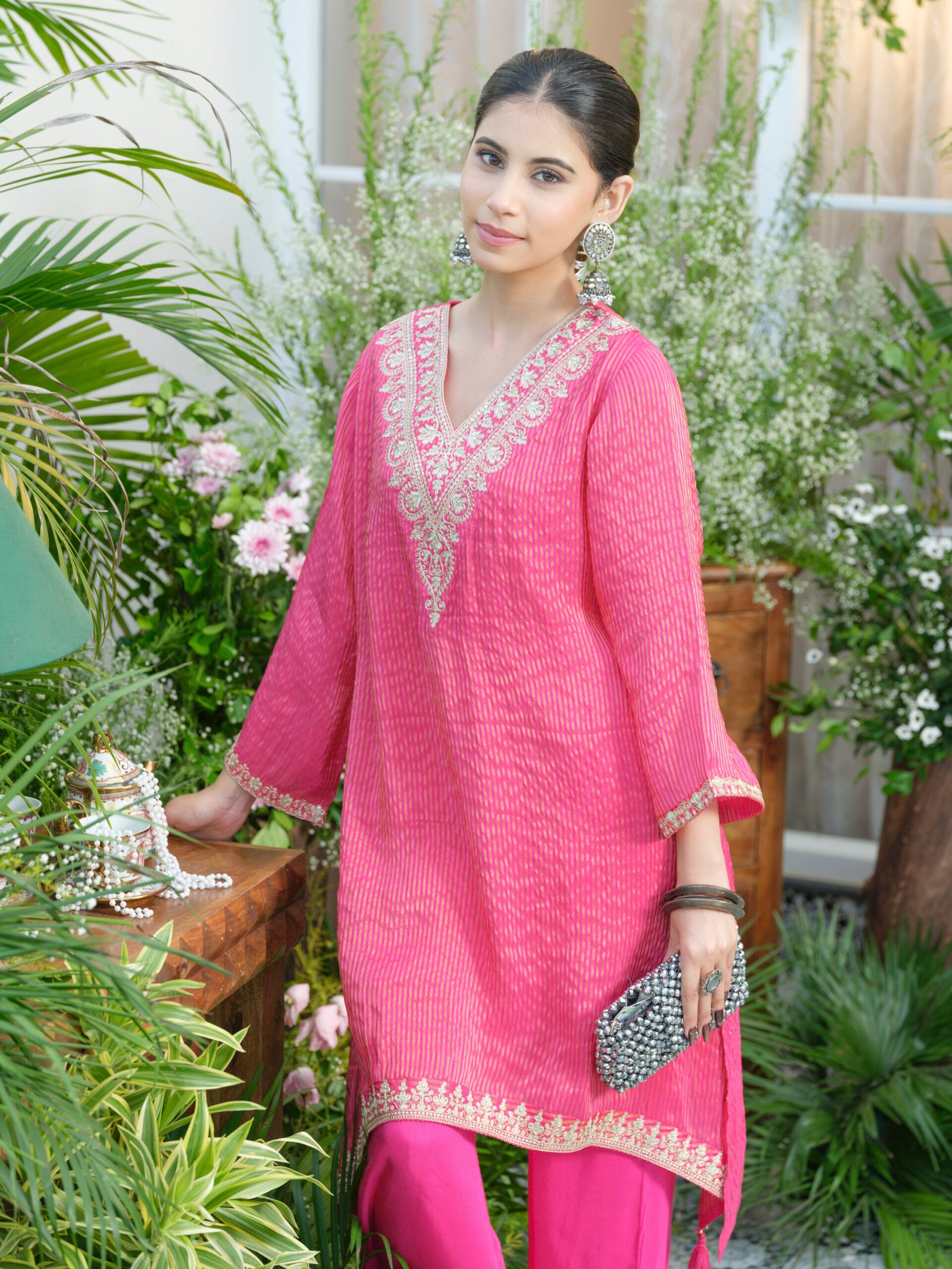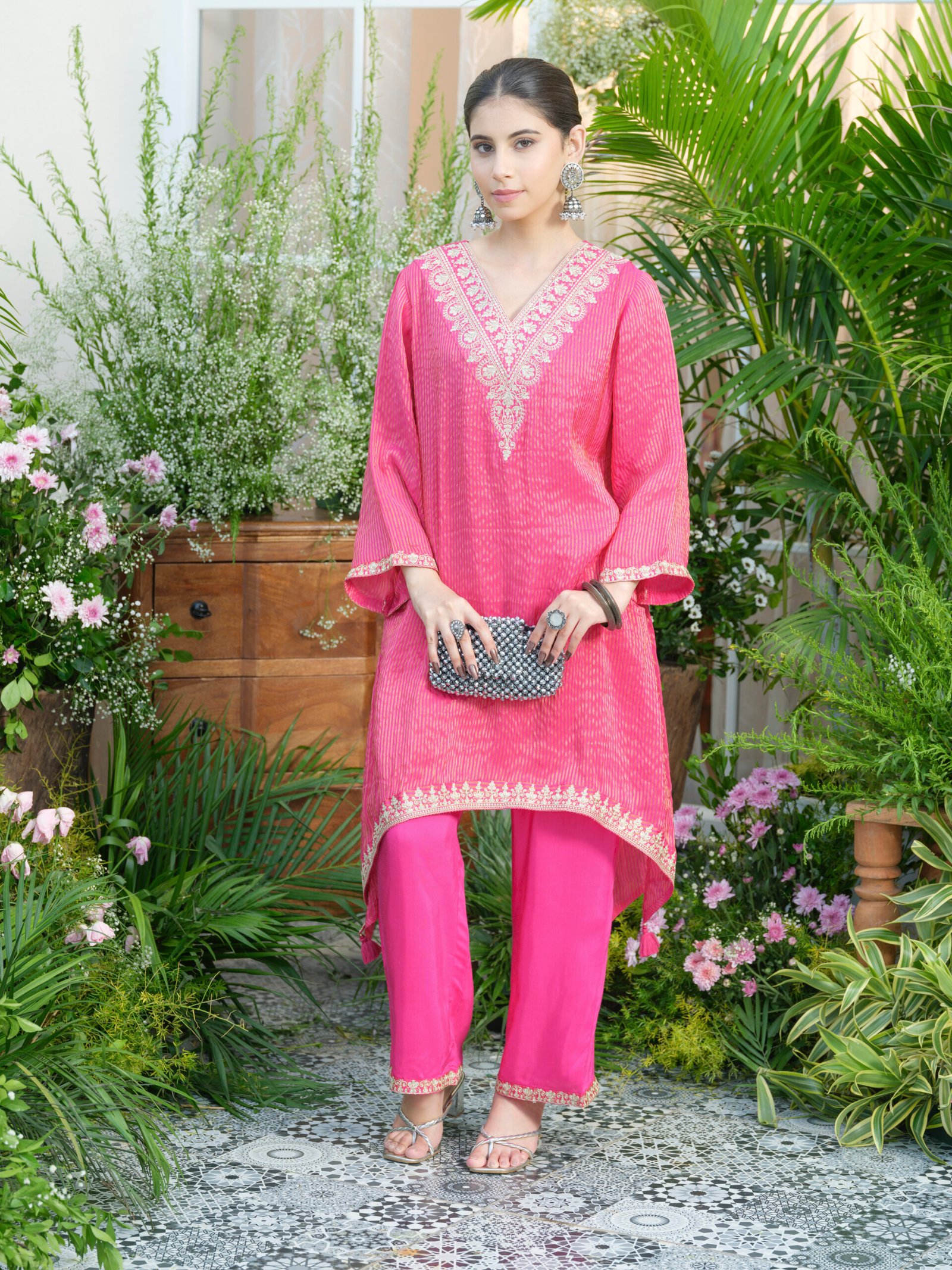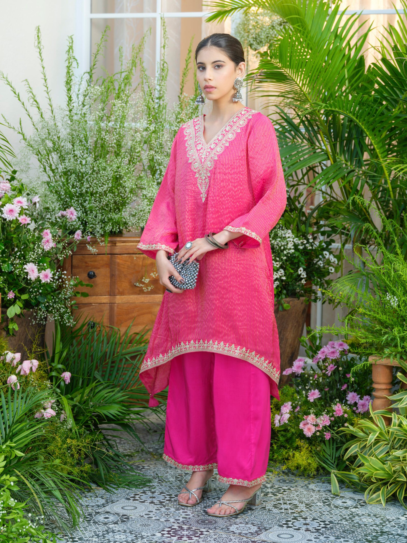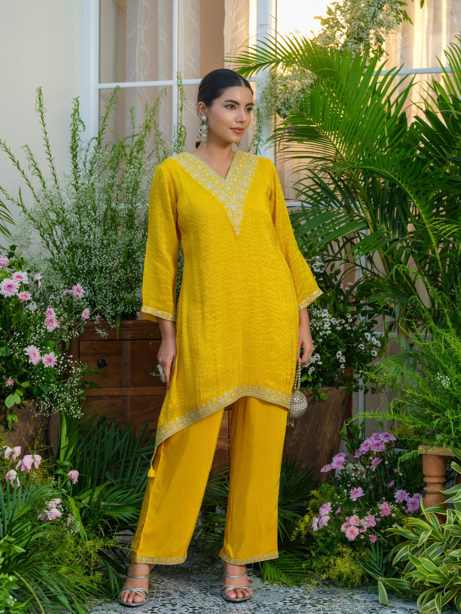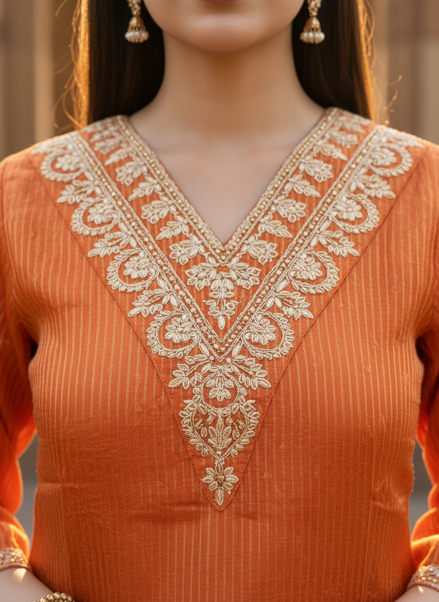 The kurta features delicate zari embroidery on the yoke, while the palazzo is enhanced with fine zari work, creating a graceful festive appeal. Available in three vibrant colors – Orange, Rani, and Yellow, this co-ord set is perfect for parties, festive occasions, and semi-formal gatherings.