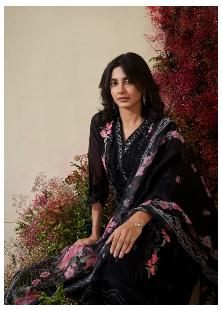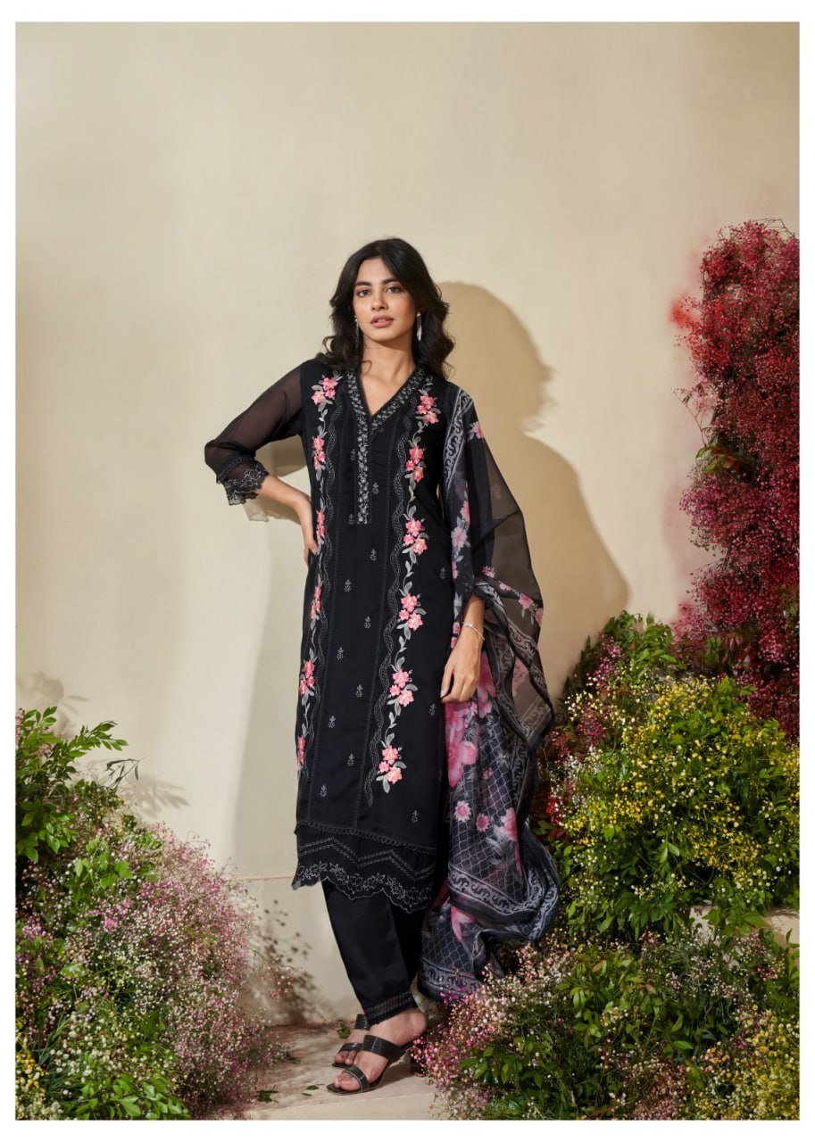 The DU-269 V-Neck 3PC Set features a stylish A-line organza kurta with refined embroidery and a premium panel concept design. The digital print dupatta adds color and sophistication, making this set ideal for festive gatherings and modern ethnic wear.