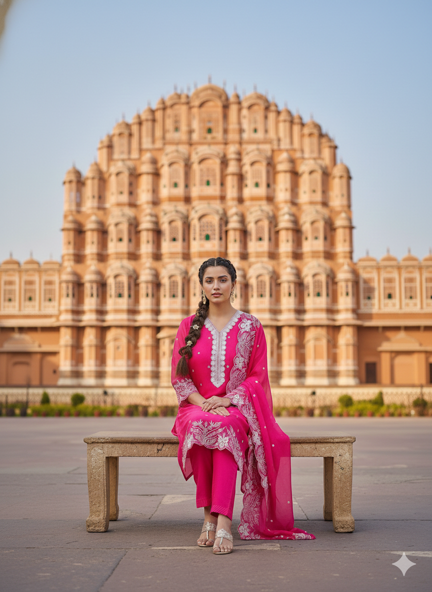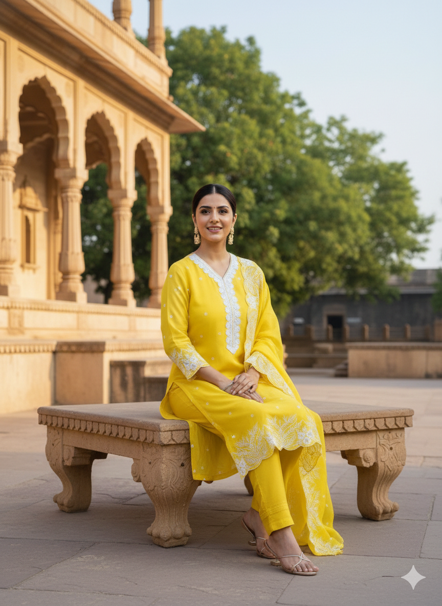 Available in sizes 38 to 44, this 3-piece set comes in two vibrant shades – Yellow and Rani – making it a must-have for weddings, festive celebrations, and special gatherings.