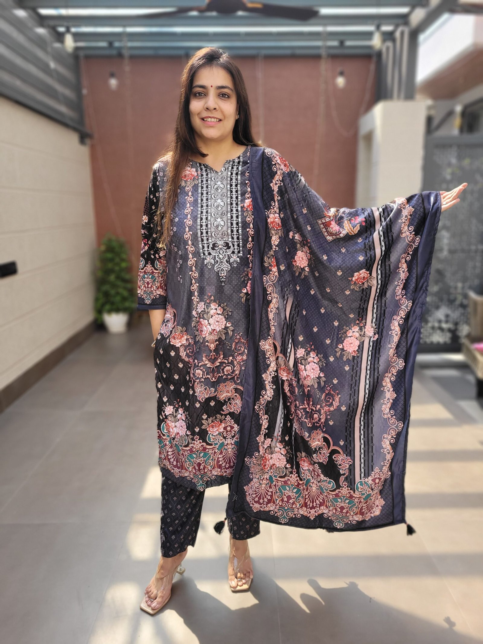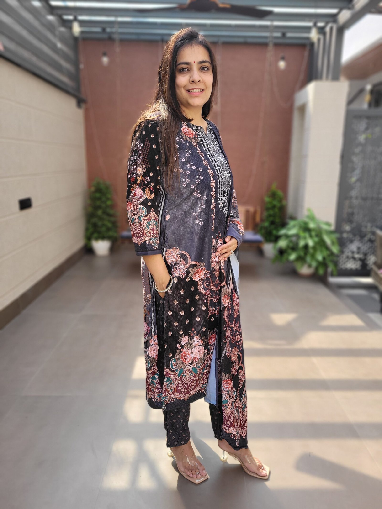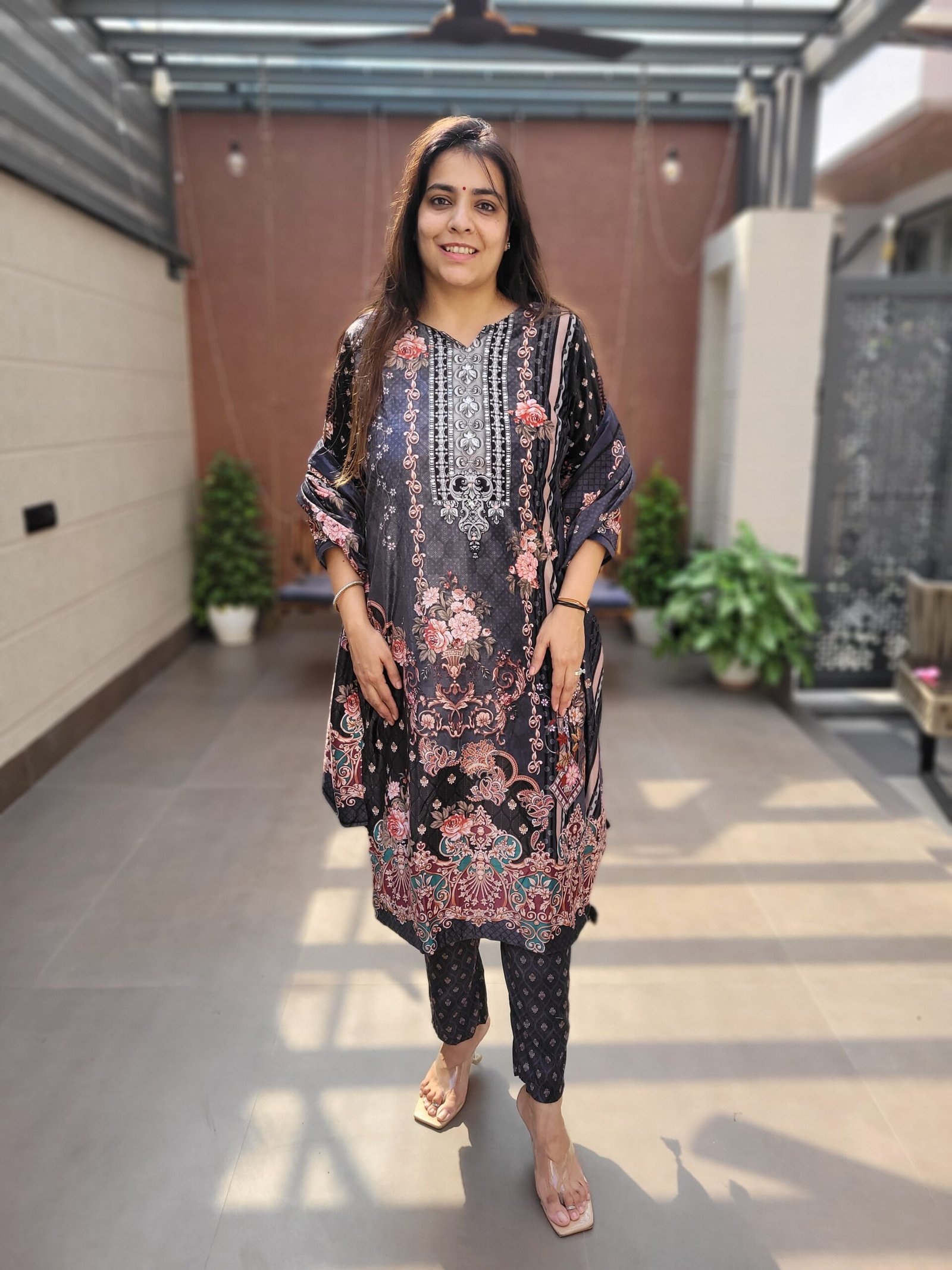 This suit set is ideal for winter weddings, festive gatherings, and special celebrations. The heavy velvet fabric ensures warmth without compromising style, while the intricate digital print adds a contemporary touch. The handwork on the yoke highlights meticulous craftsmanship, making this outfit a standout piece. The full velvet dupatta adds versatility, allowing for effortless draping and styling.