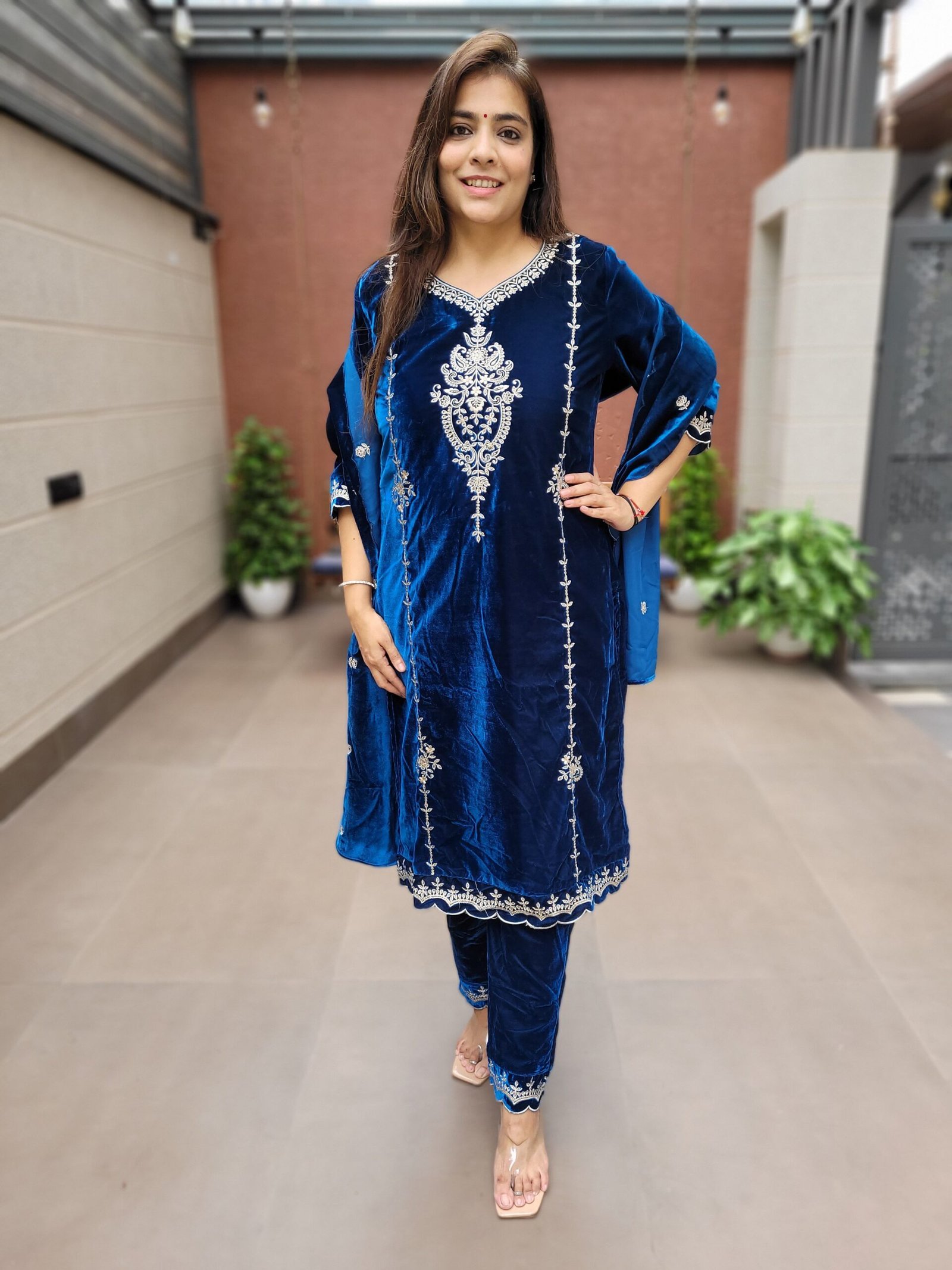 Indulge in elegance with this exquisite Velvet 3-Piece Set, designed for those who seek opulence and sophistication. Made from heavy velvet, this set features beautiful embroidery and intricate zari work, creating a rich, traditional aesthetic with a contemporary twist. The full velvet dupatta adds an extra layer of luxury, making this ensemble perfect for weddings, festive occasions, or any event where you want to make a statement.
