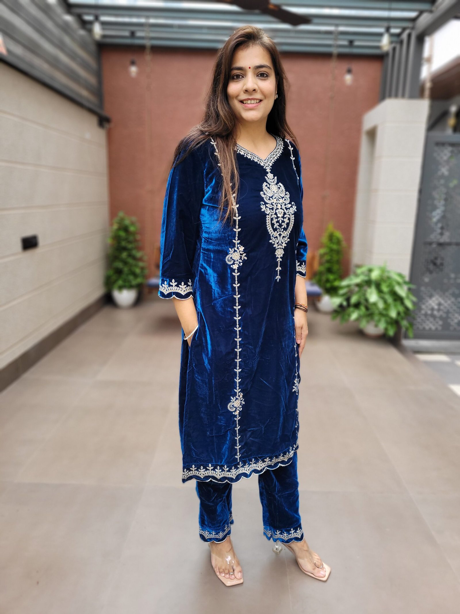 Style this set with statement jewelry and embellished footwear to create a striking look, or keep it simple for an elegant, understated appearance. Whether it’s a family gathering or a grand celebration, this velvet set ensures you look effortlessly chic.
