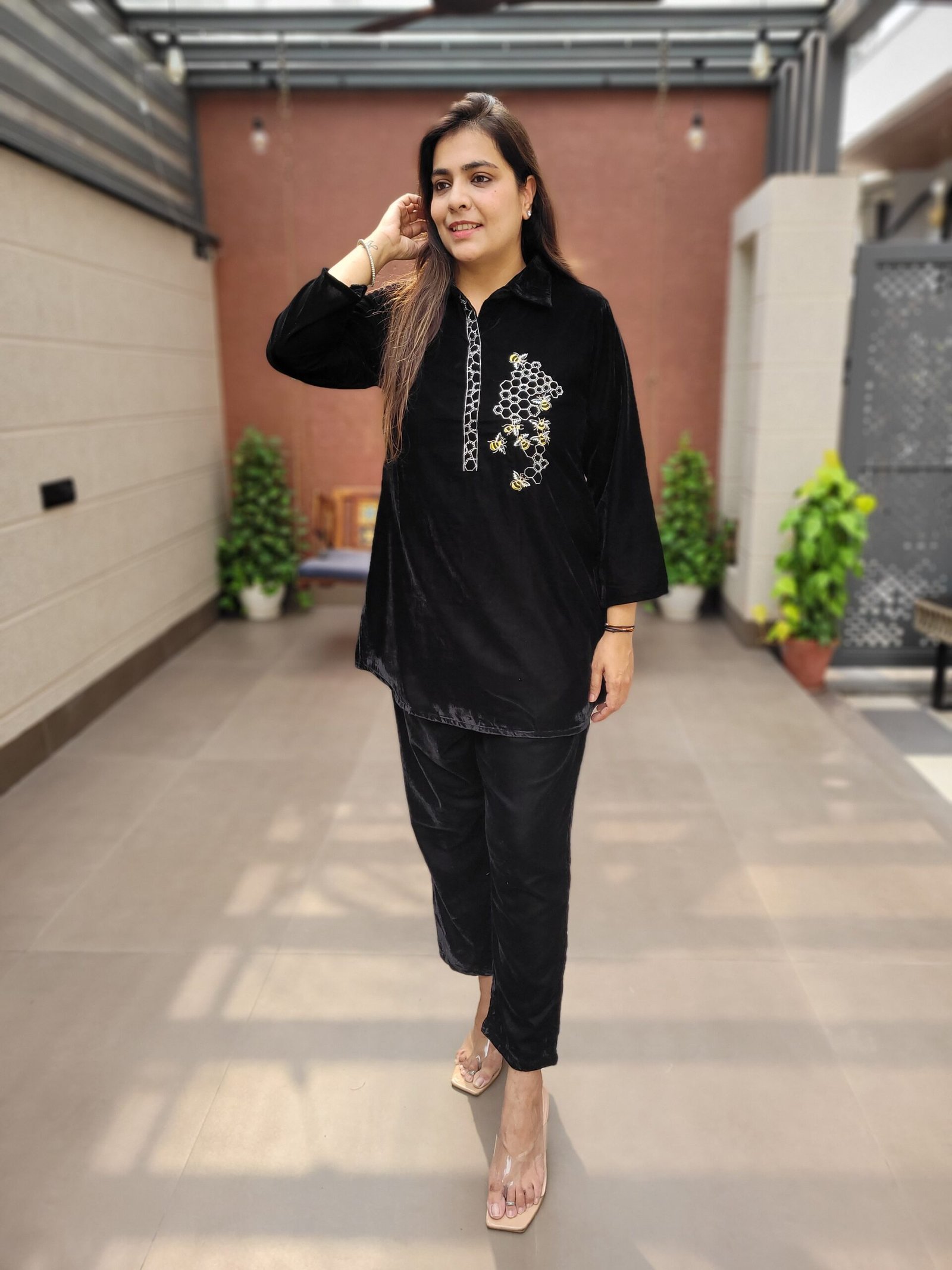 The luxurious velvet fabric ensures a soft and comfortable fit, while the honey bee handwork gives the set a one-of-a-kind charm. The carefully detailed embroidery adds texture and dimension, making it an ideal choice for those who appreciate craftsmanship and attention to detail.