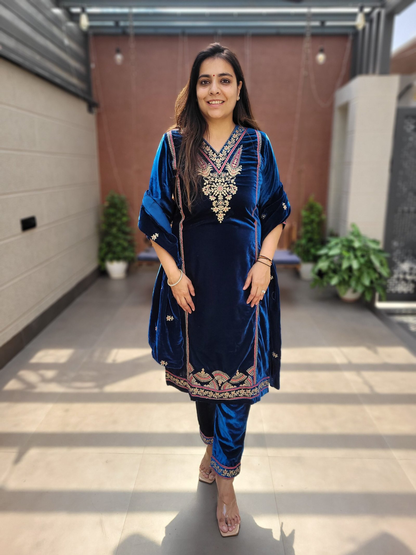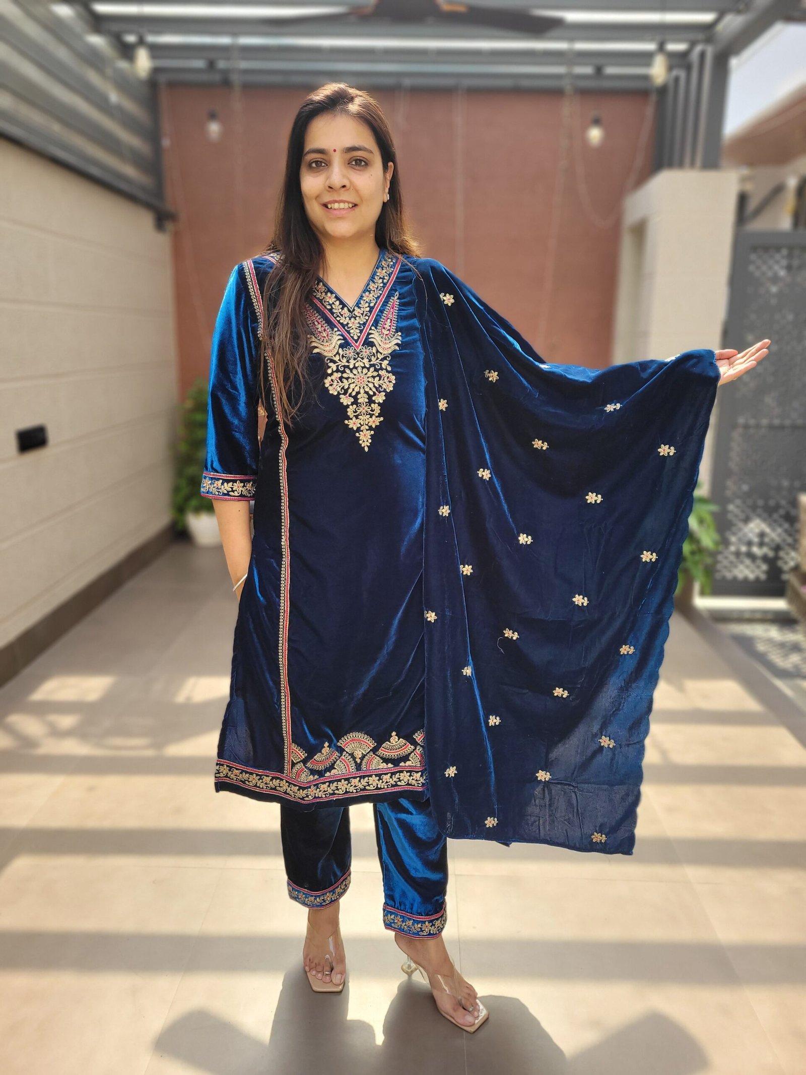 The rich velvet fabric ensures warmth and comfort, making it an ideal choice for cooler weather while maintaining a luxurious feel. The heavy zari work adds depth and texture, elevating the overall appearance and making this set a true statement piece. The lining included ensures a smooth and comfortable fit, enhancing your confidence and elegance.